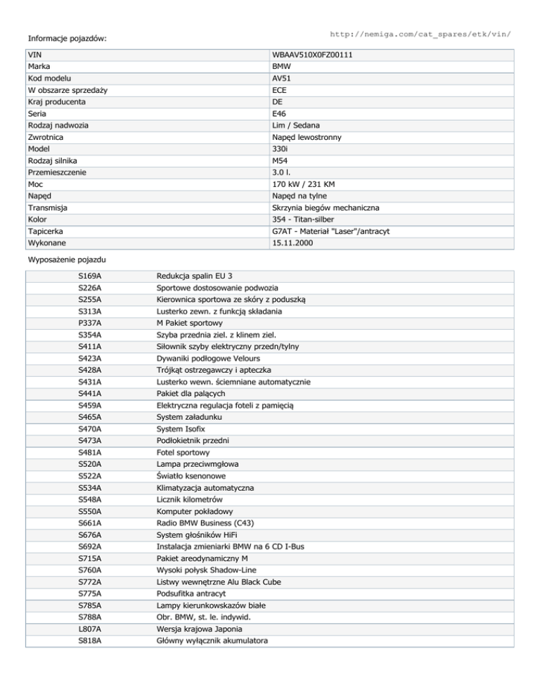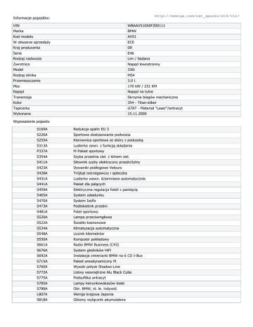http://nemiga.com/cat_spares/etk/vin/ Informacje pojazdów: VIN WBAAV510X0FZ00111 Marka BMW Kod modelu AV51 W obszarze sprzedaży ECE Kraj producenta DE Seria E46 Rodzaj nadwozia Lim / Sedana Zwrotnica Napęd lewostronny Model 330i Rodzaj silnika M54 Przemieszczenie 3.0 l. Moc 170 kW / 231 KM Napęd Napęd na tylne Transmisja Skrzynia biegów mechaniczna Kolor 354 - Titan-silber Tapicerka G7AT - Materiał "Laser"/antracyt Wykonane 15.11.2000 Wyposażenie pojazdu S169A Redukcja spalin EU 3 S226A Sportowe dostosowanie podwozia S255A Kierownica sportowa ze skóry z poduszką S313A Lusterko zewn. z funkcją składania P337A M Pakiet sportowy S354A Szyba przednia ziel. z klinem ziel. S411A Siłownik szyby elektryczny przedn/tylny S423A Dywaniki podłogowe Velours S428A Trójkąt ostrzegawczy i apteczka S431A Lusterko wewn. ściemniane automatycznie S441A Pakiet dla palących S459A Elektryczna regulacja foteli z pamięcią S465A System załadunku S470A System Isofix S473A Podłokietnik przedni S481A Fotel sportowy S520A Lampa przeciwmgłowa S522A Światło ksenonowe S534A Klimatyzacja automatyczna S548A Licznik kilometrów S550A Komputer pokładowy S661A Radio BMW Business (C43) S676A System głośników HiFi S692A Instalacja zmieniarki BMW na 6 CD I-Bus S715A Pakiet areodynamiczny M S760A Wysoki połysk Shadow-Line S772A Listwy wewnętrzne Alu Black Cube S775A Podsufitka antracyt S785A Lampy kierunkowskazów białe S788A Obr. BMW, st. le. indywid. L807A Wersja krajowa Japonia S818A Główny wyłącznik akumulatora S823A Wersja dla ciepłych krajów S832A Akumulator w bagażniku S845A Akustyczne ostrzeżenie o pasach S853A Wersja językowa, angielski S875A Pilot na podczerwień S925A Dummy-SALAPA S992A Sterowanie mocowania tabl. rej. Dokument przygotowany przez portal Automotive Nemiga.com. Informacje na temat VIN bezpłatnie!