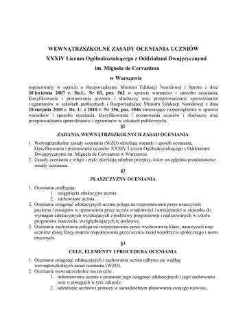 WEWNĄTRZSZKOLNE ZASADY OCENIANIA UCZNIÓW XXXIV Liceum Ogólnokształcącego z Oddziałami Dwujęzycznymi im. Miguela de Cervantesa w Warszawie (opracowany w oparciu o Rozporządzenie Ministra Edukacji Narodowej i Sportu z dnia 30 kwietnia 2007 r. Dz.U. Nr 83, poz. 562 w sprawie warunków i sposobu oceniania, klasyfikowania i promowania uczniów i słuchaczy oraz przeprowadzania sprawdzianów i egzaminów w szkołach publicznych i Rozporządzenie Ministra Edukacji Narodowej z dnia 20 sierpnia 2010 r. Dz. U. z 2010 r. Nr 156, poz. 1046 zmieniające rozporządzenie w sprawie warunków i sposobu oceniania, klasyfikowania i promowania uczniów i słuchaczy oraz przeprowadzania sprawdzianów i egzaminów w szkołach publicznych). §1 ZADANIA WEWNĄTRZSZKOLNYCH ZASAD OCENIANIA 1. Wewnątrzszkolne zasady oceniania (WZO) określają warunki i sposób oceniania, klasyfikowania i promowania uczniów XXXIV Liceum Ogólnokształcącego z Oddziałami Dwujęzycznymi im. Miguela de Cervantesa w Warszawie. 2. Zasady oceniania z religii i etyki określają odrębne przepisy, które uwzględnia przedmiotowe zasady oceniania. §2 PŁASZCZYZNY OCENIANIA 1. Ocenianiu podlegają: 1. osiągnięcia edukacyjne ucznia 2. zachowanie ucznia. 2. Ocenianie osiągnięć edukacyjnych ucznia polega na rozpoznawaniu przez nauczycieli poziomu i postępów w opanowaniu przez ucznia wiadomości i umiejętności w stosunku do wymagań edukacyjnych wynikających z podstawy programowej i realizowanych w szkole programów nauczania, uwzględniających tę podstawę. 3. Ocenianie zachowania polega na rozpoznawaniu przez wychowawcę klasy, nauczycieli oraz uczniów danej klasy stopnia respektowania przez ucznia zasad współżycia społecznego i norm etycznych. §3 CELE, ELEMENTY I PROCEDURA OCENIANIA 1. Ocenianie osiągnięć edukacyjnych i zachowania ucznia odbywa się według wewnątrzszkolnych zasad oceniania (WZO). 2. Ocenianie wewnątrzszkolne ma na celu: 1. informowanie ucznia o poziomie jego osiągnięć edukacyjnych i jego zachowaniu oraz o postępach w tym zakresie; 2. udzielanie uczniowi pomocy w samodzielnym planowaniu swojego rozwoju; 3. motywowanie ucznia do dalszych postępów w nauce i zachowaniu; 4. dostarczenie rodzicom (prawnym opiekunom) i nauczycielom informacji o postępach, trudnościach w nauce, zachowaniu oraz specjalnych uzdolnieniach ucznia 5. umożliwienie nauczycielom doskonalenia organizacji i metod pracy dydaktyczno wychowawczej. 3. Ocenianie wewnątrzszkolne obejmuje: 1. formułowanie przez nauczycieli wymagań edukacyjnych niezbędnych do uzyskania poszczególnych śródrocznych i rocznych ocen klasyfikacyjnych z obowiązkowych i dodatkowych zajęć edukacyjnych; 2. ustalenie kryteriów oceniania zachowania; 3. ocenianie bieżące i ustalanie śródrocznych ocen klasyfikacyjnych z obowiązkowych i dodatkowych zajęć edukacyjnych oraz śródrocznej oceny klasyfikacyjnej zachowania według zasad podanych poniżej; 4. przeprowadzanie egzaminów klasyfikacyjnych; 5. ustalanie rocznych ocen klasyfikacyjnych z obowiązkowych i dodatkowych zajęć edukacyjnych oraz rocznej oceny klasyfikacyjnej zachowania; 6. ustalanie warunków i trybu uzyskania wyższych niż przewidywane rocznych (semestralnych) ocen klasyfikacyjnych z obowiązkowych i dodatkowych zajęć edukacyjnych oraz rocznej oceny klasyfikacyjnej zachowania; 7. ustalenie warunków i sposobu przekazywania rodzicom (prawnym opiekunom) informacji o postępach i trudnościach ucznia w nauce. 4. Procedura oceniania 1. Nauczyciel przedmiotu systematycznie dokonuje oceny wiedzy i umiejętności ucznia w formach i warunkach zapewniających obiektywność oceny, 2. Nauczyciel przedmiotu powiadamia uczniów przynajmniej z jednotygodniowym wyprzedzeniem, o terminie i zakresie pisemnych sprawdzianów wiadomości. W ciągu jednego dnia może się odbyć nie więcej niż jedna praca klasowa (pisemny sprawdzian), a w ciągu tygodnia – trzy (nie dotyczy to prac klasowych i sprawdzianów przekładanych na prośbę uczniów). 3. Wychowawca udziela informacji rodzicom (prawnym opiekunom) o ocenach w formie ustnej lub w postaci wypisu ocen z dziennika w czasie zebrań, na przerwach lub po lekcjach (po wcześniejszym uzgodnieniu terminu spotkania). 4. Wychowawca zaprasza na zebrania, w ten sposób umożliwia rodzicom spotkanie z innymi nauczycielami i uzyskanie dodatkowych informacji o postępach ucznia. §4 ZAPOZNAWANIE Z ZASADAMI OCENIANIA 1. Nauczyciele na początku każdego roku szkolnego informują uczniów oraz ich rodziców (prawnych opiekunów) o: 1. wymaganiach edukacyjnych niezbędnych do uzyskania poszczególnych śródrocznych i rocznych ocen klasyfikacyjnych z obowiązkowych i dodatkowych zajęć edukacyjnych, wynikających z realizowanego przez siebie programu nauczania; 2. sposobach sprawdzania osiągnięć edukacyjnych uczniów; 3. o warunkach i trybie uzyskania wyższej niż przewidywana rocznej oceny klasyfikacyjnej z obowiązkowych i dodatkowych zajęć edukacyjnych. 2. Wychowawca klasy na początku każdego roku szkolnego informuje uczniów oraz ich rodziców (prawnych opiekunów) o warunkach i sposobie oraz kryteriach oceniania zachowania oraz warunkach i trybie uzyskania wyższej niż przewidywana rocznej oceny klasyfikacyjnej z zachowania. 3. Procedura informowania uczniów i rodziców 1. Nauczyciel na pierwszej lekcji danego przedmiotu nauczania odczytuje i omawia wymagania edukacyjne 2. Stosownym wpisem w dzienniku nauczyciel dokumentuje zapoznanie uczniów z wymaganiami edukacyjnymi 3. Wychowawca we wrześniu na godzinie wychowawczej zapoznaje uczniów z wewnątrzszkolnymi zasadami oceniania i fakt ten dokumentuje stosownym wpisem w dzienniku lekcyjnym 4. Wychowawca na pierwszym lub drugim zebraniu zapoznaje rodziców (prawnych opiekunów) z wewnątrzszkolnymi zasadami oceniania oraz z wybranymi przedmiotowymi zasadami oceniania przekazanymi mu przez dyrekcję szkoły lub nauczycieli poszczególnych przedmiotów 5. Rodzice poświadczaj