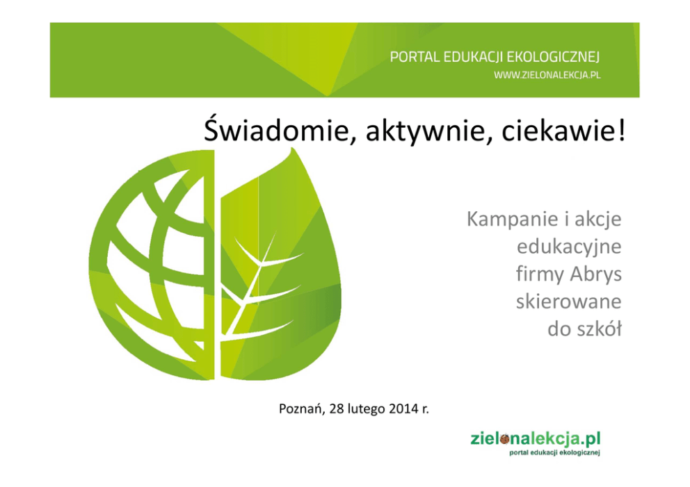 Świadomie, aktywnie, ciekawie! Kampanie i akcje edukacyjne firmy Abrys skierowane do szkół Poznań, 28 lutego 2014 r. ZielonaLekcja.pl: partner w edukacji : • informujemy – o tym, co ekologicznego dzieje się w Twojej okolicy, o szkoleniach, konkursach, wystawach, projektach dotacyjnych oraz o ogólnopolskich kampaniach, w które możesz się włączyć, • edukujemy – zamieszczamy gotowe do pobrania materiały edukacyjne, utwory multimedialne, artykuły fachowe, • inspirujemy – poprzez bazy dobrych praktyk pokazujemy najlepsze działania prowadzone przez firmy, gminy i szkoły w zakresie edukacji ekologicznej; zamieszczamy mapy miejsc, gdzie odetchniesz pełną piersią i zaczerpniesz edukacji ekologicznej! Dynks: niech (od)żyją przedmioty : • Cel konkursu: zainteresowanie młodzieży i dorosłych tematyką recyklingu w kontekście przedmiotów i urządzeń codziennego użytku, • Promowanie praktycznego zastosowania idei 3R Zadaniem uczestników jest stworzenie przedmiotu lub urządzenia wykorzystywanego do codziennego użytku, • Kluczowe jest wykorzystywanie do konstrukcji elementów przeznaczonych do wyrzucenia lub zakwalifikowanych jako odpady, • Na potrzeby konkursu powstanie portal recyklingowy, na którym będą prezentowane filmy ukazujące zastosowanie stworzonych przedmiotów i urządzeń. • Planowany start konkursu: wiosna 2014 r. Misja-Emisja: walczmy razem z Dymonami! • Misja-emisja” - złożona ogólnopolska kampania edukacyjno-informacyjna, cel: ograniczenie poziomu zanieczyszczenia powietrza, spowodowanego niską emisją. • Działania będą realizowane za pośrednictwem – gmin, przedsiębiorstw i edukatorów, • Wiodącym elementem kreacji postać Dymskiego – jest to edukator, doradca i mentor, a także pozytywny bohater kampanii, • Konkurs dla szkół „Lekcja o niskiej emisji” – na scenariusze lekcji poświęcone niskiej emisji Zgłoszenia do 31 maja 2014 r. Więcej na: www.misja-emisja.pl Konkurs o Puchar Recyklingu: edukacja odpadowa : i selektywna zbiórka odpadów • Kategoria „Edukacja Ekologiczna” – edycja 2014: działania realizowane od 1 września 2012 r. do 31 sierpnia 2013 r. • Oceniane są: oryginalność, adaptacja do warunków lokalnych, skuteczność w osiąganiu założonych celów, zasięg terytorialny oraz współczynnik ilości osób objętych działaniami do wielkości danej populacji • Tytuł Mistrza Edukacji Ekologicznej za całokształt działań edukacyjnych • Dodatkowo Partnerzy konkursu nagradzają działania w ramach poszczególnych frakcji odpadów – m.in. baterie i tworzywa sztuczne • Nagrody finansowe od wojewódzkich funduszy za działania uczestników z danego województwa • Szkoły są zwolnione z opłaty rejestracyjnej! • Zgłoszenia do 30 kwietnia 2014 r. • Patronat Honorowy: Więcej na: www.pucharrecyklingu.pl Zapraszamy do kontaktu! Emilia Seweryn Tel. 61 655 81 34 [email protected]