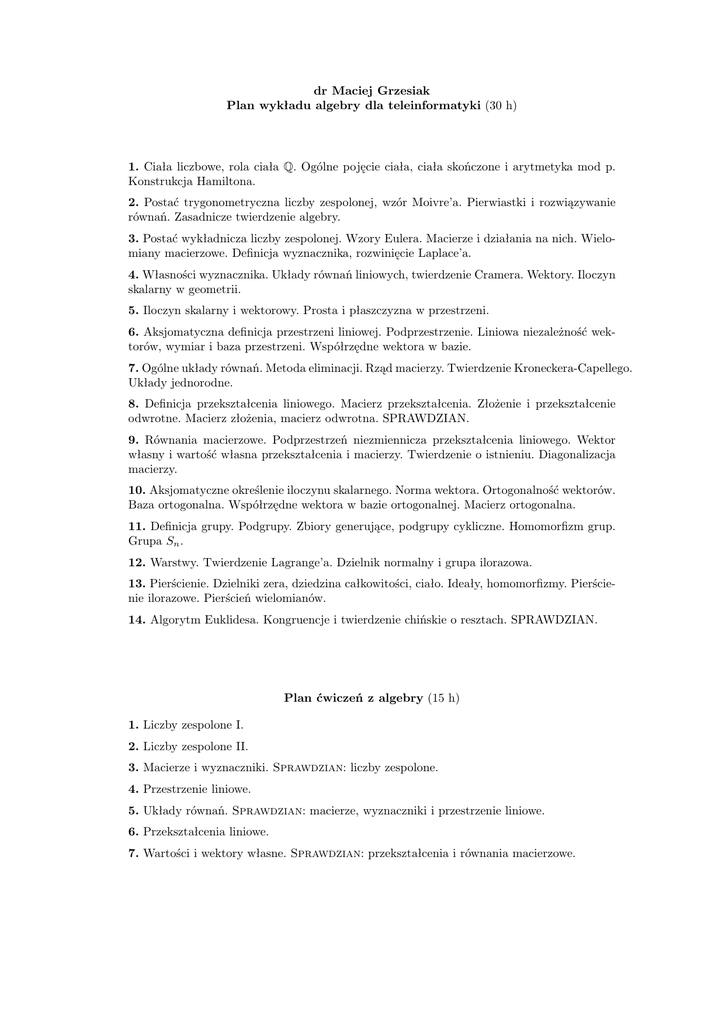 dr Maciej Grzesiak Plan wykładu algebry dla teleinformatyki (30 h) 1. Ciała liczbowe, rola ciała Q. Ogólne pojęcie ciała, ciała skończone i arytmetyka mod p. Konstrukcja Hamiltona. 2. Postać trygonometryczna liczby zespolonej, wzór Moivre’a. Pierwiastki i rozwiązywanie równań. Zasadnicze twierdzenie algebry. 3. Postać wykładnicza liczby zespolonej. Wzory Eulera. Macierze i działania na nich. Wielomiany macierzowe. Definicja wyznacznika, rozwinięcie Laplace’a. 4. Własności wyznacznika. Układy równań liniowych, twierdzenie Cramera. Wektory. Iloczyn skalarny w geometrii. 5. Iloczyn skalarny i wektorowy. Prosta i płaszczyzna w przestrzeni. 6. Aksjomatyczna definicja przestrzeni liniowej. Podprzestrzenie. Liniowa niezależność wektorów, wymiar i baza przestrzeni. Współrzędne wektora w bazie. 7. Ogólne układy równań. Metoda eliminacji. Rząd macierzy. Twierdzenie Kroneckera-Capellego. Układy jednorodne. 8. Definicja przekształcenia liniowego. Macierz przekształcenia. Złożenie i przekształcenie odwrotne. Macierz złożenia, macierz odwrotna. SPRAWDZIAN. 9. Równania macierzowe. Podprzestrzeń niezmiennicza przekształcenia liniowego. Wektor własny i wartość własna przekształcenia i macierzy. Twierdzenie o istnieniu. Diagonalizacja macierzy. 10. Aksjomatyczne określenie iloczynu skalarnego. Norma wektora. Ortogonalność wektorów. Baza ortogonalna. Współrzędne wektora w bazie ortogonalnej. Macierz ortogonalna. 11. Definicja grupy. Podgrupy. Zbiory generujące, podgrupy cykliczne. Homomorfizm grup. Grupa Sn . 12. Warstwy. Twierdzenie Lagrange’a. Dzielnik normalny i grupa ilorazowa. 13. Pierścienie. Dzielniki zera, dziedzina całkowitości, ciało. Ideały, homomorfizmy. Pierścienie ilorazowe. Pierścień wielomianów. 14. Algorytm Euklidesa. Kongruencje i twierdzenie chińskie o resztach. SPRAWDZIAN. Plan ćwiczeń z algebry (15 h) 1. Liczby zespolone I. 2. Liczby zespolone II. 3. Macierze i wyznaczniki. Sprawdzian: liczby zespolone. 4. Przestrzenie liniowe. 5. Układy równań. Sprawdzian: macierze, wyznaczniki i przestrzenie liniowe. 6. Przekształcenia liniowe. 7. Wartości i wektory własne. Sprawdzian: przekształcenia i równania macierzowe.