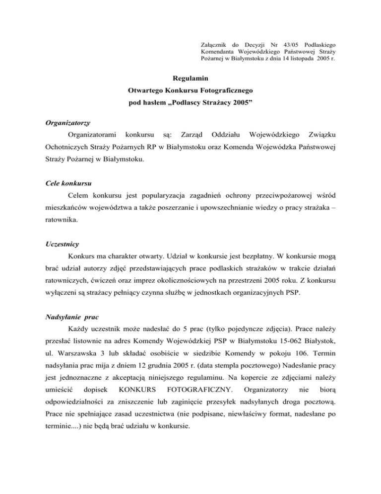 Załącznik do Decyzji Nr 43/05 Podlaskiego Komendanta Wojewódzkiego Państwowej Straży Pożarnej w Białymstoku z dnia 14 listopada 2005 r. Regulamin Otwartego Konkursu Fotograficznego pod hasłem „Podlascy Strażacy 2005” Organizatorzy Organizatorami konkursu są: Zarząd Oddziału Wojewódzkiego Związku Ochotniczych Straży Pożarnych RP w Białymstoku oraz Komenda Wojewódzka Państwowej Straży Pożarnej w Białymstoku. Cele konkursu Celem konkursu jest popularyzacja zagadnień ochrony przeciwpożarowej wśród mieszkańców województwa a także poszerzanie i upowszechnianie wiedzy o pracy strażaka – ratownika. Uczestnicy Konkurs ma charakter otwarty. Udział w konkursie jest bezpłatny. W konkursie mogą brać udział autorzy zdjęć przedstawiających prace podlaskich strażaków w trakcie działań ratowniczych, ćwiczeń oraz imprez okolicznościowych na przestrzeni 2005 roku. Z konkursu wyłączeni są strażacy pełniący czynna służbę w jednostkach organizacyjnych PSP. Nadsyłanie prac Każdy uczestnik może nadesłać do 5 prac (tylko pojedyncze zdjęcia). Prace należy przesłać listownie na adres Komendy Wojewódzkiej PSP w Białymstoku 15-062 Białystok, ul. Warszawska 3 lub składać osobiście w siedzibie Komendy w pokoju 106. Termin nadsyłania prac mija z dniem 12 grudnia 2005 r. (data stempla pocztowego) Nadesłanie pracy jest jednoznaczne z akceptacją niniejszego regulaminu. Na kopercie ze zdjęciami należy umieścić dopisek KONKURS FOTOGRAFICZNY. Organizatorzy nie biorą odpowiedzialności za zniszczenie lub zaginięcie przesyłek nadsyłanych droga pocztową. Prace nie spełniające zasad uczestnictwa (nie podpisane, niewłaściwy format, nadesłane po terminie....) nie będą brać udziału w konkursie. Technika wykonywania prac Konkurs rozgrywany będzie w jednej kategorii tematycznej: zdjęcie kolorowe o tematyce pożarniczej. Format zdjęć: minimalny 15x21, maksymalny 21x30; Opis pracy: 1) imię, nazwisko, wiek autora pracy, 2) adres zamieszkania autora, powiat, województwo, telefon kontaktowy, 3) czas i miejsce wykona zdjęcia oraz krótki opis co przedstawiają. Jury Jury powoływane jest przez Podlaskiego Komendanta Wojewódzkiego PSP. W skład Jury wchodzą pracownicy Komendy Wojewódzkiej PSP w Białymstoku i Zarządu Oddziału Wojewódzkiego ZOSP RP w Białymstoku. Zadaniem Jury jest: – ocena (jawna) i ustalenie wyników konkursu, – sporządzenie protokołu zawierającego wyniki konkursu według kolejności miejsc, – poinformowanie zwycięzców o wynikach konkursu. Konkurs zostanie rozstrzygnięty do dnia 21 grudnia 2005 r. Orzeczenia Jury są ostateczne. Nagrody Najlepsze trzy prace zostaną nagrodzone atrakcyjnymi nagrodami rzeczowymi i dyplomami. Przewidziane są także dodatkowe wyróżnienia. Popularyzacja Wybrane prace finałowe będą eksponowane na uroczystym wręczeniu nagród oraz w siedzibie Organizatorów, jak również zamieszczone na stronie internetowej www.straz.bialystok.pl. Nadesłane prace staną się własnością Organizatorów i będą stanowiły element promocyjny Straży Pożarnej. Nagrodzone prace mogą zostać także wykorzystane do projektowania materiałów popularyzatorskich i promocyjnych opracowywanych przez Organizatorów. Komitet organizacyjny