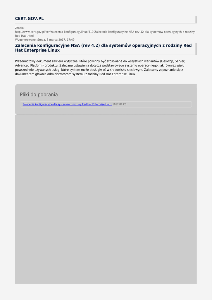 CERT.GOV.PL Źródło: http://www.cert.gov.pl/cer/zalecenia-konfiguracyj/linux/510,Zalecenia-konfiguracyjne-NSA-rev-42-dla-systemow-operacyjnych-z-rodzinyRed-Hat-.html Wygenerowano: Środa, 8 marca 2017, 17:49 Zalecenia konfiguracyjne NSA (rev 4.2) dla systemów operacyjnych z rodziny Red Hat Enterprise Linux Przedmiotowy dokument zawiera wytyczne, które powinny być stosowane do wszystkich wariantów (Desktop, Server, Advanced Platform) produktu. Zalecane ustawienia dotyczą podstawowego systemu operacyjnego, jak również wielu powszechnie używanych usług, które system może obsługiwać w środowisku sieciowym. Zalecamy zapoznanie się z dokumentem głównie administratorom systemu z rodziny Red Hat Enterprise Linux. Pliki do pobrania Zalecenia konfiguracyjne dla systemów z rodziny Red Hat Enterprise Linux 1017.84 KB zalecenia, guide, security, Red Hat WL Ocena: 5/5 (1)