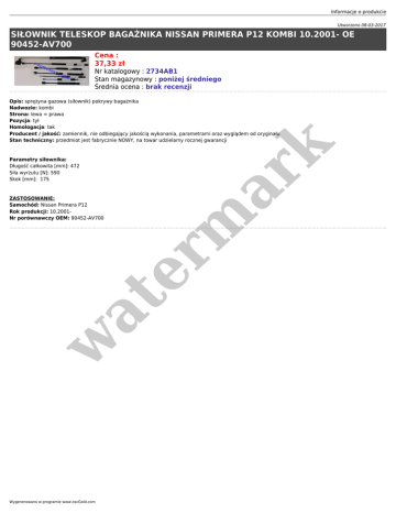 Informacje o produkcie Utworzono 08-03-2017 SIŁOWNIK TELESKOP BAGAŻNIKA NISSAN PRIMERA P12 KOMBI 10.2001- OE 90452-AV700 Cena : 37,33 zł Nr katalogowy : 2734AB1 Stan magazynowy : poniżej średniego Średnia ocena : brak recenzji Parametry siłownika: Długość całkowita [mm]: 472 Siła wyrzutu [N]: 590 Skok [mm]: 175 w at ZASTOSOWANIE: Samochód: Nissan Primera P12 Rok produkcji: 10.2001Nr porównawczy OEM: 90452-AV700 er m ar k Opis: sprężyna gazowa (siłownik) pokrywy bagażnika Nadwozie: kombi Strona: lewa = prawa Pozycja: tył Homologacja: tak Producent / jakość: zamiennik, nie odbiegający jakością wykonania, parametrami oraz wyglądem od oryginału Stan techniczny: przedmiot jest fabrycznie NOWY, na towar udzielamy rocznej gwarancji Wygenerowano w programie www.oscGold.com