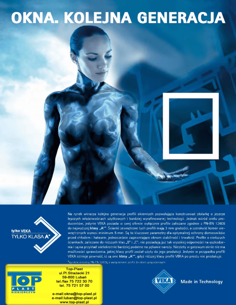 DLACZEGO TYLKO VEKA – KLASA A*? Wybrać dobrze Stolarka okienna to produkt o bardzo długim cyklu życia. Kupowany jest na ogół z zamiarem eksploatacji przez 30 – 40 lat, a jego wymiana wiąże się z poważnymi pracami remontowymi. Przy takiej inwestycji nie ma miejsca na błędy i poprawki. Należy wybrać raz, a dobrze. Tymczasem selekcja optymalnego systemu profili okiennych to skomplikowane przedsięwzięcie trudne nawet dla fachowców. Inwestor spotyka się na rynku z wieloma niemożliwymi do zweryfikowania i często sprzecznymi ze sobą, bądź nieporównywalnymi informacjami o zaletach i wadach różnych systemów. Duża ich część ma charakter czysto marketingowy i niekiedy w sposób zamierzony prowadzi na manowce. Na dodatek sprawdzenie w gotowym oknie właściwości użytych do jego produkcji profili jest praktycznie niemożliwe. Jak więc sobie radzić w takiej sytuacji? VEKA Zdobyć pewność Jest jeden szybki i pewny sposób oddzielenia ziarna od plew: Wystarczy wybrać producenta profili okiennych, którego wszystkie systemy zaliczane są na podstawie badań renomowanego instytutu naukowego i zgodnie z normą PN-EN 12608 do najwyższej klasy A*. Otóż jedynym spełniającym to kryterium producentem w Polsce jest VEKA, co udokumentowały certyfikaty instytutu RAL Deutsches Institut für Gütesicherung und Kennzeichnung e. V., a potwierdzają Aprobaty Techniczne Instytutu Techniki Budowlanej, wydane przez tenże Instytut dla każdego z systemów VEKA Polska. Wybierając system okienny VEKA masz pewność - to jest klasa A*! Mieć klasę Profile okienne klasy A* wyróżniają się grubością ścianek zewnętrznych wynoszącą min. 3 mm** oraz obecnością komór wewnętrznych, których szerokość przekracza 5 mm. Do ich produkcji konieczne jest zużycie przynajmniej 10% PVC więcej, niż do produkcji profili klasy B. Te kluczowe parametry zapewniają następujące cechy użytkowe: Niską podatność na uszkodzenia. Grube ścianki profili VEKA klasy A* zapewniają silne łączenia naroży okiennych, co zapobiega groźnemu zjawisku ich pękania na spawach. Wytrzymałość naroży okiennych wykonanych z tych profili znacznie przewyższa wytrzymałość profili klasy B i C. Klasa A*: grubość ścianki min. 3 mm** KLASA B KLASA A* -10% Klasa A*: przynajmniej 10% więcej materiału dla poprawy funkcji użytkowych Wysoką stabilność. Profile VEKA klasy A* przyczyniają się do zwiększenia stabilności ram i skrzydeł na wygięcie i skręcanie, szczególnie tych o dużych wymiarach. Wzrasta również o 20% w relacji do klasy B odporność profili na wyrywanie wkrętów używanych do mocowania okuć. Doskonała odporność na zmiany temperatur. To istotne w naszym klimacie, w którym dobowe zmiany temperatur potrafią być bardzo duże. Przeanalizujmy przedwiośnie. Temperatury nocą są ujemne (-2 0C.), a w słoneczny dzień dochodzą do 16 0C. W ciągu tych kilku godzin, pomiędzy porankiem a południem profil okienny musi wykonać olbrzymią pracę, przyjmując w tak krótkim czasie, tak dużą dawkę energii. Profil rozszerza się. Gdy zapada zmierzch proces odwraca się. Profil okienny schładza się i kurczy w krótkim czasie. Powstają wysokie naprężenia, szczególnie na narożach okiennych. Grube ścianki wszystkich profili VEKA zapewniają doskonałą statykę i silne łączenie naroży okiennych, bez zagrożenia, że popękają. Doskonałe parametry ochrony termicznej. W nowych generacjach profili standardowo stosuje się już układy 5-komorowe. Badania wykazały, iż dalsze zwiększanie liczby komór nie przynosi już znaczącej poprawy współczynnika przenikania ciepła. Natomiast większa grubość ścianek i szerokość komór to pewny sposób osiągania dalszych oszczędności ciepła w dobie rosnących cen energii. Doskonałe parametry izolacji akustycznej. Profile VEKA klasy A* to również zdecydowanie wyższy komfort akustyczny dzięki skutecznemu tłumieniu dobiegającego z zewnątrz hałasu. *zgodnie z normą PN-EN 12608, z wyłączeniem profili do okien gospodarczych **tolerancja wymiarowa 0,2 mm VEKA Polska Sp. z o.o. • ul. Sobieskiego 71 • 96-100 Skierniewice • tel. (46) 834 44 00 • fax (46) 834 44 74 • www.veka.pl Made in Technology