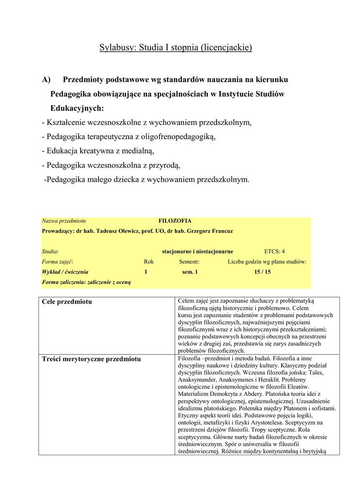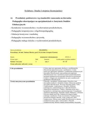 Sylabusy: Studia I stopnia (licencjackie) A) Przedmioty podstawowe wg standardów nauczania na kierunku Pedagogika obowiązujące na specjalnościach w Instytucie Studiów Edukacyjnych: - Kształcenie wczesnoszkolne z wychowaniem przedszkolnym, - Pedagogika terapeutyczna z oligofrenopedagogiką, - Edukacja kreatywna z medialną, - Pedagogika wczesnoszkolna z przyrodą, -Pedagogika małego dziecka z wychowaniem przedszkolnym. Nazwa przedmiotu FILOZOFIA Prowadzący: dr hab. Tadeusz Olewicz, prof. UO, dr hab. Grzegorz Francuz Studia: stacjonarne i niestacjonarne Forma zajęć: Rok Wykład / ćwiczenia I Semestr: sem. 1 ETCS: 4 Liczba godzin wg planu studiów: 15 / 15 Forma zaliczenia: zaliczenie z oceną Cele przedmiotu Treści merytoryczne przedmiotu Celem zajęć jest zapoznanie słuchaczy z problematyką filozoficzną ujętą historycznie i problemowo. Celem kursu jest zapoznanie studentów z problemami podstawowych dyscyplin filozoficznych, najważniejszymi pojęciami filozoficznymi wraz z ich historycznymi przekształceniami; poznanie podstawowych koncepcji obecnych na przestrzeni wieków z drugiej zaś, przedstawia się zarys zasadniczych problemów filozoficznych. Filozofia –przedmiot i metoda badań. Filozofia a inne dyscypliny naukowe i dziedziny kultury. Klasyczny podział dyscyplin filozoficznych. Wczesna filozofia jońska: Tales, Anaksymander, Anaksymenes i Heraklit. Problemy ontologiczne i epistemologiczne w filozofii Eleatów. Materializm Demokryta z Abdery. Platońska teoria idei z perspektywy ontologicznej, epistemologicznej. Uzasadnienie idealizmu platońskiego. Polemika między Platonem i sofistami. Etyczny aspekt teorii idei. Podstawowe pojęcia logiki, ontologii, metafizyki i fizyki Arystotelesa. Sceptycyzm na przestrzeni dziejów filozofii. Tropy sceptyczne. Rola sceptycyzmu. Główne nurty badań filozoficznych w okresie średniowiecznym. Spór o uniwersalia w filozofii średniowiecznej. Różnice między kontynentalną i brytyjską filozofią nowożytną –wprowadzenie. Zwrot nowożytny w nauce i w filozofii. Kartezjusz –metoda naukowa, argumenty sceptyczne. Problem dualizmu substancji materialnej i duchowej. Główne zagadnienia brytyjskiej filozofii nowożytnej. Filozofia Johna Locke'a, Georga Berkeleya i Davida Hume'a. Kantowska filozofia transcendentalna. Podstawowe idee romantyzmu i idealizmu niemieckiego przełomu XVIII i XIX wieku. Filozofia naukowa przełomu XIX i XX wieku. Próby naturalizacji filozofii. Podstawowe założenia programowe fenomenologii Husserla. XX-wieczna filozofia nauki –Popper, Kuhn, Feyerabend. Główne nurty współczesnej filozofii języka. Zwrot lingwistyczny. 1. Russell, Bertrand, Problemy filozofii, Warszawa 1995. 2. Ajdukiewicz K., Zagadnienia i kierunki filozofii (teoria poznania -metafizyka), (różne wydania) 3. Tatarkiewicz W., Historia filozofii, t.1-3 (różne wydania) 4. Markiewicz B., Filozofia (wybór tekstów), t.1-3, (różne wydania) 1. Bocheński J. M., Ku filozoficznemu myśleniu. Wprowadzenie do podstawowych pojąć filozoficznych, Warszawa 1986. 2. Galarowicz J., Na ścieżkach prawdy, Kraków 1992. 3. Grzegorczyk A., Mała propedeutyka filozofii naukowej. Warszawa 1989. 4. Copleston, Frederick, Historia filozofii, T. I, T. II, T. IV, T. V, T.VI, T. VII, T. VIII., (wydania różne). Literatura podstawowa Literatura uzupełniająca Nazwa przedmiotu SOCJOLOGIA Prowadzący: Prof. dr hab. Ludwik Kozołub, dr Irena Czajkowska, dr Jolanta Borusowska Studia: stacjonarne i niestacjonarne Forma zajęć: Rok Wykład / ćwiczenia I Semestr: sem. 1 ETCS: 4 Liczba godzin wg planu studió w: 15 / 15 Forma zaliczenia: zaliczenie z oceną Cele przedmiotu Celem przedmiotu jest zapoznanie studentów z głównymi pojęciami i problemami socjologii ogólnej jako jednej z gałęzi nauk społecznych niezbędnymi do opisu rzeczywistości społecznej. Dostarczenie wiedzy dotyczącej różnych struktur społecznych i różnych zjawisk i procesów społecznych. Umożliwienie konfrontacji założeń teoretycznych z praktyką życia społecznego, wiązanie abstrakcyjnych idei z konkretnymi doświadczeniami. Perspektywa socjologiczna ma ukazać ludzi we wzajemnych związkach. Poznanie struktur i procesów, które kształtują życie społeczne pomoże studentom lepiej zrozumieć życie społeczne oraz siły społeczne oddziałujące na ich życie. Studenci uczą się analizować rzeczywistość społeczną i zachodzące w niej zmiany oraz przygotowują do samodzielnej lektury i myślenia kategoriami socjologicznymi. Treści merytoryczne przedmiotu Na zajęciach scharakteryzowana zostanie socjologia jako nauka, jej przedmiot, początki i rozwój. Omówione też zostaną podstawowe pojęcia socjologiczne, tj. społeczeństwo, zbiory społeczne, zbiorowości społeczne oraz grupa społeczna. Następnie dokonana zostanie analiza różnych struktur społecznych, poczynając od małych grup społecznych, tj. rodzina oraz krąg sąsiedzki, poprzez społeczność lokalną jako przykład grupy średniej, aż do dużych grup społecznych, tj. naród i mniejszości narodowe, państwo, klasy i warstwy społeczne, inteligencję i elity władzy. Literatura podstawowa 1.Goodman N., Wstęp do socjologii, Poznań 2004. 2.Januszek H., Sikora J., Podstawy socjologii, Poznań 2009. 3.Polkowska –Kujawa J., (red.) Socjologia ogólna. Wybrane problemy, Warszawa 2005. 4.Szczepański J., Elementarne pojęcia socjologii, Warszawa 1972. 5.Sztompka P., Socjologia: analiza społeczeństwa, Kraków 2007. Literatura uzupełniająca 1.Giddens A., Socjologia, Warszawa 2008. 2. Gołdyka, Markowska D., Stankiewicz J., Socjologia. Pojęcia, teorie, problemy, Zielona Góra 2000. 3.Marshall G., Słownik socjologii i nauk społecznych, Warszawa 2005. 4.Mendras H., Elementy socjologii, Wrocław 2004. 5.Olechnicki K. Załęcki P., Słownik socjologiczny, Toruń 2002. 6.Podgórski R., Socjologia. Mikrostruktury, 2008. 7. Szacka B., Wprowadzenie do socjologii, Warszawa 2008. Nazw