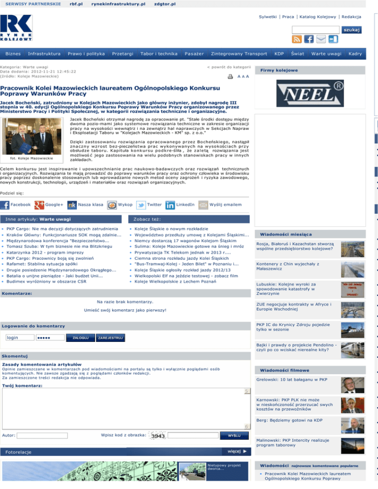 SERWISY PARTNERSKIE rbf.pl rynekinfrastruktury.pl zdgtor.pl Sylwetki Biznes Infrastruktura Prawo i polityka Przetargi Tabor i technika Pasażer Kategoria: Warte uwagi Data dodania: 2012-1 1-21 12:45:22 (źródło: Koleje Mazowieckie) Zintegrowany Transport < powrót do kategorii Praca KDP Katalog Kolejowy Świat Warte uwagi Redakcja Kadry Firmy kolejowe A AA Pracownik Kolei Mazowieckich laureatem Ogólnopolskiego Konkursu Poprawy Warunków Pracy Jacek Bocheński, zatrudniony w Kolejach Mazowieckich jako główny inżynier, zdobył nagrodę III stopnia w 40. edycji Ogólnopolskiego Konkursu Poprawy Warunków Pracy organizowanego przez Ministerstwo Pracy i Polityki Społecznej, w kategorii rozwiązania techniczne i organizacyjne. Jacek Bocheński otrzymał nagrodę za opracowanie pt. "Stałe środki dostępu między dwoma pozio-mami jako systemowe rozwiązania techniczne w zakresie organizacji pracy na wysokości wewnątrz i na zewnątrz hal naprawczych w Sekcjach Napraw i Eksploatacji Taboru w "Kolejach Mazowieckich - KM" sp. z o.o." fot. Koleje Mazowieckie P Dzięki zastosowaniu rozwiązania opracowanego przez Bocheńskiego, nastąpił z n a c z n y w z r o s t b e z-pieczeństwa prac wykonywanych na wysokośc i a c h p r z y obsłudze taboru. Kapituła k o n k u r s u p o d k r e-śliła , że z a l e tą rozwiązania jest możliwoś ć jego zastosowania na wielu podobnych stanowiskach pracy w innych zakładach. • • Celem konkursu jest inspirowanie i upowszechnianie prac naukowo-badawczych oraz rozwiązań technicznych i organizacyjnych. Rozwiązania te mają prowadzić do poprawy warunków pracy oraz ochrony człowieka w środowisku pracy poprzez doskonalenie stosowanych lub wprowadzanie nowych metod oceny zagrożeń i ryzyka zawodowego, nowych konstrukcji, technologii, urządzeń i materiałów oraz rozwiązań organizacyjnych. K • • Podziel się: Facebook Google+ Nasza klasa Wykop Twitter LinkedIn Wyślij emailem N Inne artykuły: Warte uwagi Zobacz też: • • PKP Cargo: Nie ma decyzji dotyczących zatrudnienia • Koleje Śląskie o nowym rozkładzie • Kraków Główny: Funkcjonariusze SOK mogą zdalnie... • Województwo przedłuży umowę z Kolejami Śląskimi... • Międzynarodowa konferencja "Bezpieczeństwo... • Niemcy dostarczą 17 wagonów Kolejom Śląskim • Tomasz Szuba: W tym biznesie nie ma Blitzkriegu • Sulima: Koleje Mazowieckie gotowe na śnieg i mróz • Katarzynka 2012 - program imprezy • Prywatyzacja TK Telekom jednak w 2013 r.... • PKP Cargo: Pracownicy boją się zwolnień • Ciemna strona rozkładu jazdy Kolei Śląskich • Rafamet: Stabilna sytuacja spółki • "Bus-Tramwaj-Kolej - Jeden Bilet" w Poznaniu i... • Drugie posiedzenie Międzynarodowego Okrągłego... • Koleje Śląskie ogłosiły rozkład jazdy 2012/13 • Batalia o unijne pieniądze - Jaki budżet Unii... • Wielkopolski Elf na jeździe testowej - zobacz film • Budimex wyróżniony w obszarze CSR • Koleje Wielkopolskie z Lechem Poznań Wiadomości miesiąc a • Rosja, Białoruś i Kazachstan stworzą wspólne przedsiębiorstwo kolejowe? • • Kontenery z Chin wyjechały z Małaszewicz Komentarze: Na razie brak komentarzy. Umieść swój komentarz jako pierwszy! • Lubuskie: Kolejne wyroki za spowodowanie katastrofy w Zwierzynie • ZUE negocjuje kontrakty w Afryce i Europie Wschodniej • • • PKP IC do Krynicy Zdroju pojedzie tylko w sezonie Logowanie do komentarzy login • • ●●●●● Bajki i prawdy o projekcie Pendolino czyli po co wciskać nierealne kity? Skomentuj • • Zasady komentowania artykułów Opinie zamieszczane w komentarzach pod wiadomościami na portalu są tylko i wył ącznie poglądami osób komentujących. Nie zawsze zgadzają s ię z poglądami członków redakcji. Za zamieszczone treści redakcja nie odpowiada. Wiadomości filmowe Grelowski: 10 lat bałaganu w PKP Twój komentarz: • • 5 Karnowski: PKP PLK nie może w nieskończoność przerzucać swych kosztów na przewoźników Berg: Będziemy gotowi na KDP 6 Autor: • • • • Wpisz kod z obrazka: Malinowski: PKP Intercity realizuje program taborowy • Fotorelacje • Nietypowy projekt dworca... Wiadomości najnowsze komentowane popularne • Pracownik Kolei Mazowieckich laureatem Ogólnopolskiego Konkursu Poprawy • • Warunków Pracy Kolejny pociąg Leo Express w... Protest kolejarzy pod... Warszawa: Symulacja wypadku w... • • Bydgoszcz: Otwarcie mostu tramwajowego • • Chińska kolej dużych prędkości - inwestycja nieopłacalna? • • W przyszłym roku kolejne utrudnienia w metrze • • Raport UTK: Co czwarty pociąg pasażerski przyjeżdża do celu z opóźnieniem • • PKP Cargo: Nie ma decyzji dotyczących zatrudnienia • • Otwarcie ofert na przewozy w Zachodniopomorskiem • • Zakończono modernizację wiaduktu kolejowego w Wandzinie Ł ó dź: "Kopanie wielkiej... • 52,7 mln zł straty netto Przewozów Regionalnych za 2011 r. Nietypowy projekt dworca kolejowego w Cieszynie K • ZTM Warszawa zmienia regulamin przewozów - cz. II • więcej > • Newsletter Subskrybuj RSS Archiwum login Rejestracja do archiwum ●●●●● przypomnij hasło Reklama w portalu | Reklama w miesięczniku | Miesięcznik Rynek Kolejowy | Prenumerata | Empik | Archiwum | Redakcja Wydawnictwo Rynek Kolejowy O wydawnictwie |Nasze portale |Konferencje |Pozostałe usługi Portal Rynek Kolejowy Biznes |Infrastruktura |Prawo i Polityka |Przetargi |Tabor i technika |Pasażer | Zintegrowany Transport |KDP |Świat |Warte uwagi |Kadry |Video |Euro 2012 | II Linia metra |Praca |Katalog Firm |Reklama W najnowszym numerze Najnowszy "Rynek Kolejowy" już w sprzedaży. Zapraszamy do prenumeraty i do Salonów Empik. Przewodnim tematem nowego wydania są inwestycje PKP PLK. Przeczytać można też m. in. o przewozach kruszyw, modernizacji zasilania CMK, taborze Kolei Śląskich. W numerze także wywiad z Henrykiem Grucą i Tomaszem Szubą. Modernizacja zasilania CMK