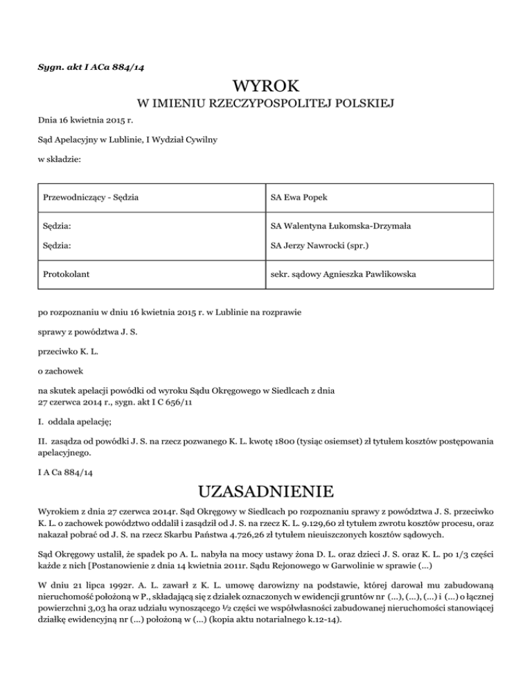 Sygn. akt I ACa 884/14 WYROK W IMIENIU RZECZYPOSPOLITEJ POLSKIEJ Dnia 16 kwietnia 2015 r. Sąd Apelacyjny w Lublinie, I Wydział Cywilny w składzie: Przewodniczący - Sędzia SA Ewa Popek Sędzia: SA Walentyna Łukomska-Drzymała Sędzia: SA Jerzy Nawrocki (spr.) Protokolant sekr. sądowy Agnieszka Pawlikowska po rozpoznaniu w dniu 16 kwietnia 2015 r. w Lublinie na rozprawie sprawy z powództwa J. S. przeciwko K. L. o zachowek na skutek apelacji powódki od wyroku Sądu Okręgowego w Siedlcach z dnia 27 czerwca 2014 r., sygn. akt I C 656/11 I. oddala apelację; II. zasądza od powódki J. S. na rzecz pozwanego K. L. kwotę 1800 (tysiąc osiemset) zł tytułem kosztów postępowania apelacyjnego. I A Ca 884/14 UZASADNIENIE Wyrokiem z dnia 27 czerwca 2014r. Sąd Okręgowy w Siedlcach po rozpoznaniu sprawy z powództwa J. S. przeciwko K. L. o zachowek powództwo oddalił i zasądził od J. S. na rzecz K. L. 9.129,60 zł tytułem zwrotu kosztów procesu, oraz nakazał pobrać od J. S. na rzecz Skarbu Państwa 4.726,26 zł tytułem nieuiszczonych kosztów sądowych. Sąd Okręgowy ustalił, że spadek po A. L. nabyła na mocy ustawy żona D. L. oraz dzieci J. S. oraz K. L. po 1/3 części każde z nich [Postanowienie z dnia 14 kwietnia 2011r. Sądu Rejonowego w Garwolinie w sprawie (...) W dniu 21 lipca 1992r. A. L. zawarł z K. L. umowę darowizny na podstawie, której darował mu zabudowaną nieruchomość położoną w P., składającą się z działek oznaczonych w ewidencji gruntów nr (...), (...), (...) i (...) o łącznej powierzchni 3,03 ha oraz udziału wynoszącego ½ części we współwłasności zabudowanej nieruchomości stanowiącej działkę ewidencyjną nr (...) położoną w (...) (kopia aktu notarialnego k.12-14). Wartość darowizny według stanu na dzień 21 lipca 1992r., a według cen z daty orzekania wynosi łącznie 732 300 zł (opinia biegłych zakresu szacowania nieruchomości H. C. k. 98-145, Z. K. k. 344-382, korekta k. 419-426). J. S. otrzymała od A. L.: • w 1992r. lub 1993r. kwotę 4000 dolarów amerykańskich (okoliczność przyznana przez powódkę); • kwotę 300 000 zł na kupno mieszkania w W. przy ul. (...) [oświadczenie powódki z dniu 14 lub 15 listopada 1977r. o otrzymaniu tej kwoty (k.54)] . Powódka w chwili otwarcia spadku była pełnoletnia i nie była trwale niezdolna do pracy. Sąd zważył, że zgodnie z art. 991 kc powódka J. S. należy do kręgu osób uprawnionych do zachowku po swoim ojcu A. L.. Należny powódce zachowek winien odpowiadać połowie wartości udziału spadkowego, który by jej przypadł przy dziedziczeniu ustawowym tj. ½ z 1/3 czyli 1/6, albowiem w dacie otwarcia spadku powódka była osobą pełnoletnią i nie była trwale niezdolna do pracy. Zaspokojenie roszczenia o zachowek należnego może nastąpić bądź w formie uczynionej przez spadkodawcę darowizny, bądź w postaci powołania do spadku, bądź w postaci zapisu. Dopiero w przypadku, gdy uprawniony nie uzyska równowartości zachowku w jednej z powyższej form może kierować roszczenie o zachowek do spadkobiercy, ewentualnie osoby obdarowanej przez spadkodawcę. W skład spadku po A. L. nie wchodzą żadne składniki majątkowe. Zatem poprzez sam fakt powołania powódki do spadku nie doszło do zaspokojenia jej ewentualnego roszczenia o zachowek. W stanie faktycznym sprawy podstawą roszczenia powódki jest przepis art. 1000 kc, zgodnie z którym gdy spadkodawca dokonał darowizny wyczerpującej cały spadek, uprawniony do zachowku może dochodzić roszczenia o zachowek od obdarowanego w granicach określonych w art. 1000 k.c. (wyr. SN z dnia 30 stycznia 2008 r., III CSK 255/07, OSNC 2009, nr 3, poz. 47). Zgodnie z § 2 tego przepisu jeżeli obdarowany sam jest uprawniony do zachowku, bez względu na to kiedy darowizna została uczyniona ponosi odpowiedzialność względem innych uprawnionych do zachowku, ale tylko do wysokości nadwyżki przekraczającej jego własny zachowek. Zatem granicę ich odpowiedzialności wyznacza różnica pomiędzy wartością wzbogacenia będącego skutkiem darowizny, a wartością przysługującego im zachowku. Ustalenie istnienia wzbogacenia powinno być dokonywane według stanu istniejącego w chwili wystąpienia przez uprawnionego z żądaniem zapłaty i wymaga ustalenia wartości uzyskanej darowizny, wg zasady przewidzianej w art. 995 kc - według stanu z chwili jej dokonania, a według cen z chwili ustalania zachowku. Zgodnie z art. 993 kc przy obliczaniu zachowku dolicza się do spadku wszystkie darowizny uczynione przez spadkodawcę, za wyjątkiem darowizn wskazanych w art. 994 kc. W przedmiotowej sprawie czysta wartość spadku była zerowa. Zatem podstawę wyliczenia zachowku stanowią darowizny uczynione przez spadkodawcę. Sąd ustalił te wartości darowanych pozwanemu nieruchomości na podstawie opinii biegłych z zakresu szacowania nieruchomości H. C. w zakresie działek (...), a Z. K. w zakresie działek nr (...). Wartość nieruchomości darowanych pozwanemu przez A. L. wynosiła łącznie 732 300 zł i składały się na nią następujące wartości działek: • działki nr (...) na kwotę 384 000 zł i • udziału w działce nr (...) na kwotę 151 000 zł. • działki nr (...) na kwotę 58 600 zł, • działki nr (...) na kwotę 93 400 zł i • działki nr (...) na kwotę 45 300 zł. Na podstawie zebranego w sprawie materiału dowodowego Sąd uznał, iż J. S. otrzymała w dniu 14 listopada 1977r. darowiznę od A. L. w kwocie 300 000 zł. Powódka zaprzeczyła, aby taką darowiznę otrzymała stwierdzając, iż dokument przedstawiony przez pozwanego na tę okoliczność jest sfałszowany, o czym świadczy fakt, iż widnieją na nim dwie różne daty (oświadczenie k.54). W wyjaśnieniach podała, iż nie podpisywała dokumentów in blanco (k.46v), by następnie stwierdzić w piśmie z 24 maja 2013r., iż była zmuszana przez ojca do podpisywania dokumentów in blanco (k.314). Twierdzenia powódki są s