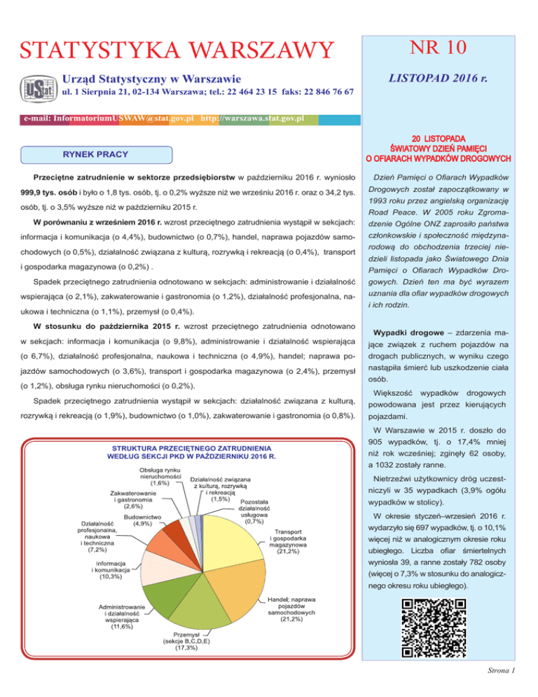 NR 10 STATYSTYKA WARSZAWY Urząd Statystyczny w Warszawie LISTOPAD 2016 r. ul. 1 Sierpnia 21, 02-134 Warszawa; tel.: 22 464 23 15 faks: 22 846 76 67 e-mail: [email protected] http://warszawa.stat.gov.pl RYNEK PRACY 20 LISTOPADA ŚWIATOWY DZIEŃ PAMIĘCI O OFIARACH WYPADKÓW DROGOWYCH Przeciętne zatrudnienie w sektorze przedsiębiorstw w październiku 2016 r. wyniosło Dzień Pamięci o Ofiarach Wypadków 999,9 tys. osób i było o 1,8 tys. osób, tj. o 0,2% wyższe niż we wrześniu 2016 r. oraz o 34,2 tys. Drogowych został zapoczątkowany w osób, tj. o 3,5% wyższe niż w październiku 2015 r. 1993 roku przez angielską organizację Road Peace. W 2005 roku Zgroma- W porównaniu z wrześniem 2016 r. wzrost przeciętnego zatrudnienia wystąpił w sekcjach: dzenie Ogólne ONZ zaprosiło państwa informacja i komunikacja (o 4,4%), budownictwo (o 0,7%), handel, naprawa pojazdów samo- członkowskie i społeczność międzyna- chodowych (o 0,5%), działalność związana z kulturą, rozrywką i rekreacją (o 0,4%), transport i gospodarka magazynowa (o 0,2%) . rodową do obchodzenia trzeciej niedzieli listopada jako Światowego Dnia Pamięci o Ofiarach Wypadków Dro- Spadek przeciętnego zatrudnienia odnotowano w sekcjach: administrowanie i działalność gowych. Dzień ten ma być wyrazem wspierająca (o 2,1%), zakwaterowanie i gastronomia (o 1,2%), działalność profesjonalna, na- uznania dla ofiar wypadków drogowych ukowa i techniczna (o 1,1%), przemysł (o 0,4%). W stosunku do października 2015 r. wzrost przeciętnego zatrudnienia odnotowano i ich rodzin. Wypadki drogowe – zdarzenia ma- w sekcjach: informacja i komunikacja (o 9,8%), administrowanie i działalność wspierająca jące związek z ruchem pojazdów na (o 6,7%), działalność profesjonalna, naukowa i techniczna (o 4,9%), handel; naprawa po- drogach publicznych, w wyniku czego jazdów samochodowych (o 3,6%), transport i gospodarka magazynowa (o 2,4%), przemysł nastąpiła śmierć lub uszkodzenie ciała (o 1,2%), obsługa rynku nieruchomości (o 0,2%). Spadek przeciętnego zatrudnienia wystąpił w sekcjach: działalność związana z kulturą, rozrywką i rekreacją (o 1,9%), budownictwo (o 1,0%), zakwaterowanie i gastronomia (o 0,8%). osób. Większość wypadków drogowych powodowana jest przez kierujących pojazdami. W Warszawie w 2015 r. doszło do STRUKTURA PRZECIĘTNEGO ZATRUDNIENIA WEDŁUG SEKCJI PKD W PAŹDZIERNIKU 2016 R. 905 wypadków, tj. o 17,4% mniej niż rok wcześniej; zginęły 62 osoby, a 1032 zostały ranne. Nietrzeźwi użytkownicy dróg uczestniczyli w 35 wypadkach (3,9% ogółu wypadków w stolicy). W okresie styczeń–wrzesień 2016 r. wydarzyło się 697 wypadków, tj. o 10,1% więcej niż w analogicznym okresie roku ubiegłego. Liczba ofiar śmiertelnych wyniosła 39, a ranne zostały 782 osoby (więcej o 7,3% w stosunku do analogicznego okresu roku ubiegłego). Strona 1 RYNEK PRACY (dok.) Podstawowe dane o m.st. Warszawie W końcu października 2016 r. liczba zarejestrowanych bezrobotnych wyniosła 34420 osób, była o 1170 osób, tj. o 3,3% mniejsza niż w końcu września 2016 r. i o 7352 osoby, Przeciętne zatrudnienie w sektorze przedsiębiorstw w październiku 2016 r. wyniosło 999,9 tys. osób i było o 3,5% wyższe niż przed rokiem. W końcu października 2016 r. liczba zarejestrowanych bezrobotnych wyniosła 34420 osób i była o 17,6% mniejsza niż przed rokiem, a stopa bezrobocia ukształtowała się na poziomie 2,9%. W końcu października 2016 r. liczba kobiet, tj. o 17,6% mniejsza niż w analogicznym okresie 2015 r. Liczba zarejestrowanych bezrobotnych kobiet wyniosła 17190 co stanowiło 49,9% ogółu bezrobotnych (przed miesiącem 50,3%, przed rokiem 48,5%) i 18,1% bezrobotnych kobiet w województwie mazowieckim. W stosunku do września 2016 r. liczba bezrobotnych kobiet zmniejszyła się o 712 osób, tj. o 4,0%, a w stosunku do października 2015 r. zmniejszyła się o 3071 osób, tj. o 15,2%. Stopa bezrobocia rejestrowanego wynosiła 2,9% (przed miesiącem 3,0%, a przed rokiem 3,6%), średnia w województwie mazowieckim kształtowała się na poziomie 7,2% (przed miesiącem 7,4%, a przed rokiem 8,4%), natomiast w kraju na poziomie 8,2% (przed miesiącem 8,3%, a przed rokiem 9,6%). które nie podjęły zatrudnienia po urodze- W październiku 2016 r. w urzędach pracy zarejestrowano 3809 osób bezrobotnych (4062 niu dziecka wyniosła 3405, tj. 19,8% ogółu we wrześniu 2016 r., a 4103 w październiku 2015 r.). Bezrobotni zarejestrowani stanowili zarejestrowanych bezrobotnych kobiet. 18,3% ogółu zarejestrowanych bezrobotnych w województwie. Liczba osób rejestrujących się po raz pierwszy wyniosła 1185 (przed miesiącem 1230), Przeciętne miesięczne wynagrodzenie co stanowiło 31,1% ogółu zarejestrowanych bezrobotnych, którzy zarejestrowali się w paź- brutto w sektorze przedsiębiorstw w paź- dzierniku br. oraz 25,6% zarejestrowanych po raz pierwszy w województwie. Udział osób dzierniku 2016 r. wyniosło 5608,36 zł i było o 3,0% wyższe niż w październiku 2015 r. zwolnionych z przyczyn dotyczących zakładu pracy wśród bezrobotnych zarejestrowanych w październiku 2016 r. wyniósł 5,5% (w województwie mazowieckim 4,8%), przed miesiącem 3,4%, a przed rokiem 4,8%. Produkcja sprzedana przemysłu (w cenach stałych) w październiku 2016 r. była o 5,5% mniejsza niż przed rokiem. W październiku 2016 r. wyrejestrowano z ewidencji bezrobotnych 4979 osób (4857 we wrześniu 2016 r., a 5380 w październiku 2015 r.), co stanowiło 19,6% wyrejestrowanych z ewidencji bezrobotnych w województwie mazowieckim. Spośród wyrejestrowanych bezrobotnych 2557 osób podjęło pracę. Ponadto 1472 osoby utraciły status bezrobotnego w wyniku Produkcja budowlano-montażowa (w cenach bieżących) w październiku 2016 r. była o 28,6% mniejsza niż przed rokiem. Sprzedaż detaliczna (w cenach bieżących) zrealizowana przez przedsiębiorstwa handlowe i niehandlowe w paździe