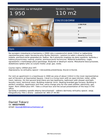 MIESZKANIE na WYNAJEM 1 950 Szczecin, Sienna 110 m2 156/3518/OMW 1 950 PLN 110 2 2 Secondary 2000 Opis Na wynajem mieszkanie w kamienicy z 2000 roku o powierzchni około 110m2 w najbardziej reprezentacyjnej części Szczecina przy Rynku Siennym. I poziom to salon z otwartą kuchnią, toaleta, pomieszczenie gospodarcze, balkon. Na II poziomie znajdują się dwie sypialnie, łazienka z kabiną prysznicową i wanną, pralnia, pomieszczenie techniczne. Materiał budowlany: cegła, ogrzewanie z markowego pieca gazowego. Budynek w idealnym stanie. Mieszkanie bezczynszowe, dodatkowa opłata tylko za zużyte media: prąd, gaz, woda. Czynsz najmu 1950zł plus VAT. Zapraszamy na wirtualny spacer i rzeczywistą prezentację, klucze w biurze. For rent an apartment in a townhouse in 2000 wo area of about 110m2 in the most representative part of Szczecin at Haymarket Square. I level is a living room with an open kitchen, toilet, utility room, balcony. On the second level there are two bedrooms, bathroom with shower and bath, laundry room, technical room. Building material: brick. Heating branded gas furnace. Building in perfect condition. Apartment rent free, extra charge only for the used utilities: electricity, gas, water. Rent 1950zł plus VAT. Take a virtual tour and the actual presentation of the keys in the office. Sprzedaj w podobny sposób własną nieruchomość - odbierz darmowy wirtualny spacer, sesję fotograficzną i film z drona - zadzwoń tel. 693 27 44 95! Daniel Tokarz tel. 693274495 email: [email protected] 360 Nieruchomości Powered by TCPDF (www.tcpdf.org)
