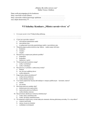 „Miejmy dla siebie zawsze czas” Matka Teresa z Kalkuty Dane osób przystępujących do konkursu: Imię i nazwisko ucznia (klasa) ………………………………………………… Imię i nazwisko rodzica/prawnego opiekuna …………………………………… oraz chętni domownicy …………………………………………………….. VI Szkolny Konkurs „Mistrz savoir-vivre` u” 1. Co to jest savoir-vivre? Podaj krótką definicję. ……………………………………………………………………………………………………………... …………………………………………………………………………………………………………....... 2. Czym jest nazwisko rodowe? a. nazwiskiem panieńskim matki b. nazwiskiem ojca c. to połączenie nazwiska panieńskiego matki z nazwiskiem ojca 3. Wyjaśnij pojęcia pokrewieństwa (np. babcia – matka mamy lub taty). a. bratanicab. świekrac. stryjek4. Kto pierwszy rozpoczyna jedzenie posiłku? a. gospodyni b. gospodarz c. najstarszy z gości 5. W drzwiach pierwszeństwo mają? a. osoby wychodzące b. osoby wchodzące 6. Kto pierwszy wychodzi z zatłoczonej windy? a. kobieta b. ten, kto jest najbliżej drzwi c. osoba najstarsza 7. Kogo komu należy przedstawić? a. osobę starszą młodszej b. osobę młodszą starszej 8. Czy można poprawiać fryzurę lub makijaż w miejscu publicznym – kawiarni, teatrze? a. można b. nie można 9. Kto komu pierwszy podaje rękę? a. kobieta pierwsza mężczyźnie b. mężczyzna pierwszy kobiecie c. osoba młodsza starszej 10. Kto powinien zakończyć rozmowę telefoniczną? a. osoba, która zatelefonowała b. osoba, do której zatelefonowano 11. W restauracji widzisz przy swoim nakryciu starannie złożoną płócienną serwetkę. Co z nią robisz? a. wiążesz pod brodą b. starasz się jej nie dotykać c. rozkładasz na kolanach 12. Sztućce skrzyżowane na talerzu są sygnałem dla kelnera, że: a. kontynuujemy posiłek b. skończyliśmy jedzenie c. prosimy o dokładkę 13. Czy dopuszcza się jedzenie drobiu rękoma? a. tak b. nie 14. Czy savoir-vivre dopuszcza odchylenie talerza przy jedzeniu zupy? a. tak b. nie 15. Zaproszono Cię na przyjęcie i przyszedłeś za wcześnie. Co powinieneś zrobić? a. poczekać i wejść 10-15 minut po umówionej godzinie b. wejść wcześniej c. zadzwonić i zapytać, czy gospodarze są gotowi na przyjęcie gości 16. Po wejściu do mieszkania znajomych: a. witamy się i rozbieramy b. rozbieramy się i witamy c. rozbieramy się, przechodzimy do pokoju i się witamy 17. Otrzymałeś prezent od gości. Należy go rozpakować: a. przy gościach b. po wyjściu gości c. obojętnie kiedy 18. Kwiaty zapakowane w papier: a. wręczamy z opakowaniem b. wyjmujemy z opakowania c. nie ma to znaczenia 19. Co oznacza netykieta? a. nie ma takiego słowa b. protokół dyplomatyczny c. zasady przyzwoitego zachowania w Internecie 20. Co to jest kindersztuba? a. z języka niemieckiego zabawa dzieci b. specjalne pomieszczenie do zabawy c. ogłada towarzyska 21. Co oznacza zachować konwenanse? a. zachować się stosownie do sytuacji b. zachować pamiątki z ważnych wydarzeń c. zachować dobre wspomnienia 22. Co oznacza kurtuazja? a. niestosowny gest b. uprzejmość c. dokuczliwe upominanie kogoś Dziękujemy za poświęcony czas. Rozwiązane testy należy przynieść dnia 14.03.2014 r. do biblioteki szkolnej.