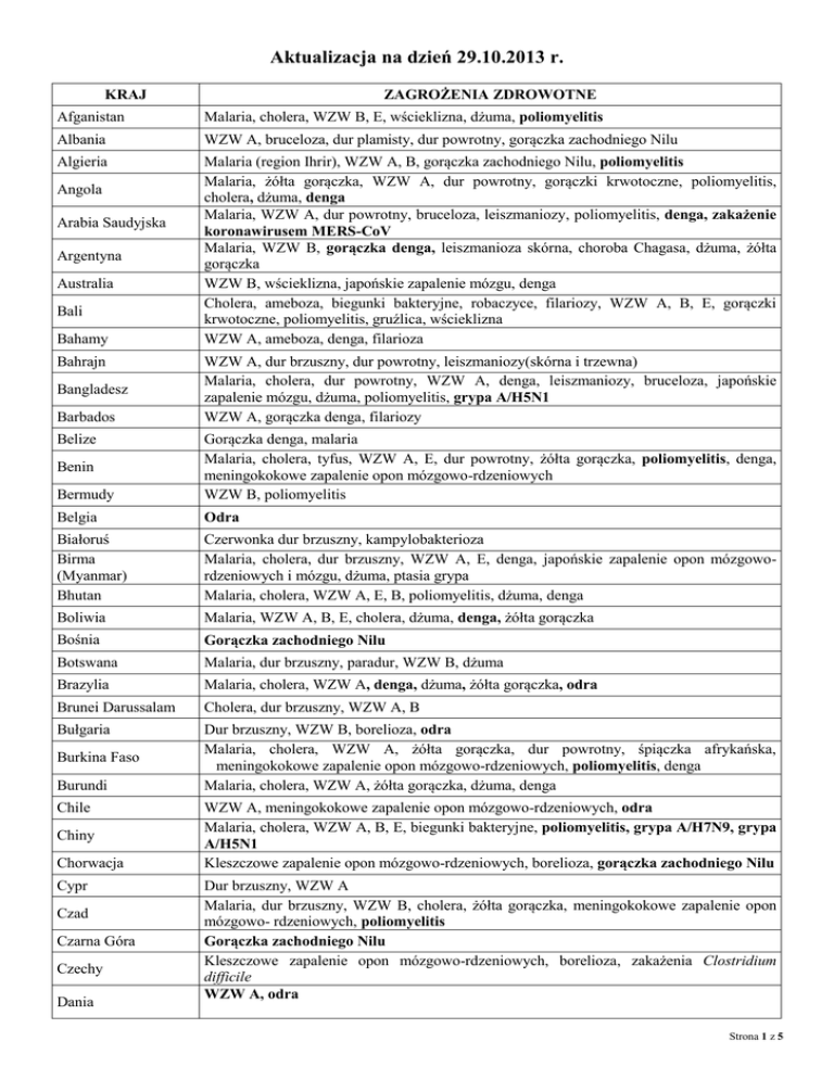 Aktualizacja na dzień 29.10.2013 r. ZAGROŻENIA ZDROWOTNE KRAJ Afganistan Malaria, cholera, WZW B, E, wścieklizna, dżuma, poliomyelitis Albania WZW A, bruceloza, dur plamisty, dur powrotny, gorączka zachodniego Nilu Algieria Malaria (region Ihrir), WZW A, B, gorączka zachodniego Nilu, poliomyelitis Malaria, żółta gorączka, WZW A, dur powrotny, gorączki krwotoczne, poliomyelitis, cholera, dżuma, denga Malaria, WZW A, dur powrotny, bruceloza, leiszmaniozy, poliomyelitis, denga, zakażenie koronawirusem MERS-CoV Malaria, WZW B, gorączka denga, leiszmanioza skórna, choroba Chagasa, dżuma, żółta gorączka WZW B, wścieklizna, japońskie zapalenie mózgu, denga Cholera, ameboza, biegunki bakteryjne, robaczyce, filariozy, WZW A, B, E, gorączki krwotoczne, poliomyelitis, gruźlica, wścieklizna WZW A, ameboza, denga, filarioza Angola Arabia Saudyjska Argentyna Australia Bali Bahamy Bahrajn Bangladesz Barbados WZW A, dur brzuszny, dur powrotny, leiszmaniozy(skórna i trzewna) Malaria, cholera, dur powrotny, WZW A, denga, leiszmaniozy, bruceloza, japońskie zapalenie mózgu, dżuma, poliomyelitis, grypa A/H5N1 WZW A, gorączka denga, filariozy Bermudy Gorączka denga, malaria Malaria, cholera, tyfus, WZW A, E, dur powrotny, żółta gorączka, poliomyelitis, denga, meningokokowe zapalenie opon mózgowo-rdzeniowych WZW B, poliomyelitis Belgia Odra Białoruś Birma (Myanmar) Bhutan Czerwonka dur brzuszny, kampylobakterioza Malaria, cholera, dur brzuszny, WZW A, E, denga, japońskie zapalenie opon mózgowordzeniowych i mózgu, dżuma, ptasia grypa Malaria, cholera, WZW A, E, B, poliomyelitis, dżuma, denga Boliwia Malaria, WZW A, B, E, cholera, dżuma, denga, żółta gorączka Bośnia Gorączka zachodniego Nilu Botswana Malaria, dur brzuszny, paradur, WZW B, dżuma Brazylia Malaria, cholera, WZW A, denga, dżuma, żółta gorączka, odra Brunei Darussalam Cholera, dur brzuszny, WZW A, B Bułgaria Dur brzuszny, WZW B, borelioza, odra Malaria, cholera, WZW A, żółta gorączka, dur powrotny, śpiączka afrykańska, meningokokowe zapalenie opon mózgowo-rdzeniowych, poliomyelitis, denga Malaria, cholera, WZW A, żółta gorączka, dżuma, denga Belize Benin Burkina Faso Burundi Chile Chiny Chorwacja Cypr Czad Czarna Góra Czechy Dania WZW A, meningokokowe zapalenie opon mózgowo-rdzeniowych, odra Malaria, cholera, WZW A, B, E, biegunki bakteryjne, poliomyelitis, grypa A/H7N9, grypa A/H5N1 Kleszczowe zapalenie opon mózgowo-rdzeniowych, borelioza, gorączka zachodniego Nilu Dur brzuszny, WZW A Malaria, dur brzuszny, WZW B, cholera, żółta gorączka, meningokokowe zapalenie opon mózgowo- rdzeniowych, poliomyelitis Gorączka zachodniego Nilu Kleszczowe zapalenie opon mózgowo-rdzeniowych, borelioza, zakażenia Clostridium difficile WZW A, odra Strona 1 z 5 Demokratyczna Republika Konga Dominikana Malaria, cholera, WZW A, E, B, żółta gorączka, gorączki krwotoczne, dżuma, meningokokowe zapalenie opon mózgowo- rdzeniowych, poliomyelitis, odra, Ebola Malaria, WZW B, denga, leptospiroza, cholera Dżibuti Malaria, WZW A, B, dury, gorączki krwotoczne, poliomyelitis, denga, Egipt Malaria, dur brzuszny, cholera, dur powrotny, poliomyelitis, WZW A, grypa A/H5N1 Ekwador Malaria, cholera, WZW A, żółta gorączka, dżuma, denga, odra Erytrea Malaria, cholera, WZW A, E, żółta gorączka, denga Estonia WZW A, kleszczowe zapalenie opon mózgowo-rdzeniowych, borelioza Malaria, WZW A, E, dury, gorączki krwotoczne, poliomyelitis, żółta gorączka, denga, cholera, odra WZW A, E, denga, dur brzuszny Malaria, cholera, WZW A, E, gorączki krwotoczne, gorączka denga, japońskie zapalenie mózgu, meningokokowe zapalenie opon mózgowo- rdzeniowych, Borelioza, kleszczowe zapalenie opon mózgowo-rdzeniowych, odra, WZW A Etiopia Fidżi Filipiny Finlandia Grecja Odra, zakażenie korona wirusem MERS-CoV Malaria, WZW A, E, B, gorączki krwotoczne, denga, dur powrotny, poliomyelitis, śpiączka afrykańska, cholera, żółta gorączka Malaria, cholera, WZW A, E, gorączki krwotoczne, denga, dur powrotny, poliomyelitis, żółta gorączka, meningokokowe zapalenie opon mózgowo-rdzeniowych Malaria, cholera, WZW A, E, B gorączki krwotoczne, denga, żółta gorączka, meningokokowe zapalenie opon mózgowo-rdzeniowych, poliomyelitis Kleszczowe zapalenie opon mózgowo-rdzeniowych, gorączka zachodniego Nilu, malaria Gruzja Biegunka podróżnych, ogniska cholery, robaczyce, WZW B, odra Gujana Malaria, cholera, WZW A, E, B, gorączki krwotoczne, denga Gujana Francuska Malaria, cholera, gorączki krwotoczne, WZW A, B, wścieklizna, denga, żółta gorączka Gwadelupa WZW A, B, tężec, błonica, dur brzuszny, denga Gwatemala Haiti Malaria, cholera, WZW A, B, E, gorączki krwotoczne, poliomyelitis, gorączka denga Malaria, WZW A, B, E, żółta gorączka, denga, gorączki krwotoczne, poliomyelitis, cholera, meningokokowe zapalenie opon mózgowo- rdzeniowych Malaria, WZW A, B, E, gorączki krwotoczne, gorączka denga, tularemia, cholera Hiszpania Odra Hercegowina Gorączka zachodniego Nilu Holandia Odra Honduras Malaria, WZW A, B, E, gorączki krwotoczne, denga, wścieklizna Hongkong Irlandia Malaria, cholera, WZW A, E Malaria, cholera, WZW A, E, gorączki krwotoczne, denga, japońskie zapalenie mózgu, meningokokowe zapalenie opon mózgowo-rdzeniowych, chikungunya, dżuma, poliomyelitis Malaria, cholera, WZW A, E, B, gorączki krwotoczne, denga, poliomyelitis, gruźlica, dżuma, meningokokowe zapalenie opon mózgowo- rdzeniowych, wścieklizna, ptasia grypa, chikungunya, grypa A/H1N1 Malaria, gorączki krwotoczne, denga, poliomyelitis, WZW B, odra Malaria, cholera, WZW A, B, C, dur powrotny, gorączki krwotoczne, poliomyelitis, gorączka krymsko-kongijska, dżuma Kleszczowe zapalenie opon mózgowo-rdzeniowych, borelioza, odra Islandia Kleszczowe zapalenie opon mózgowo-rdzeniowych, borelioza Izrael Gorączka zachodniego Nilu, zagrożenie poliomyelitis Jamajka WZW A, E, B, gorączki krwotoczne, gorączka denga,