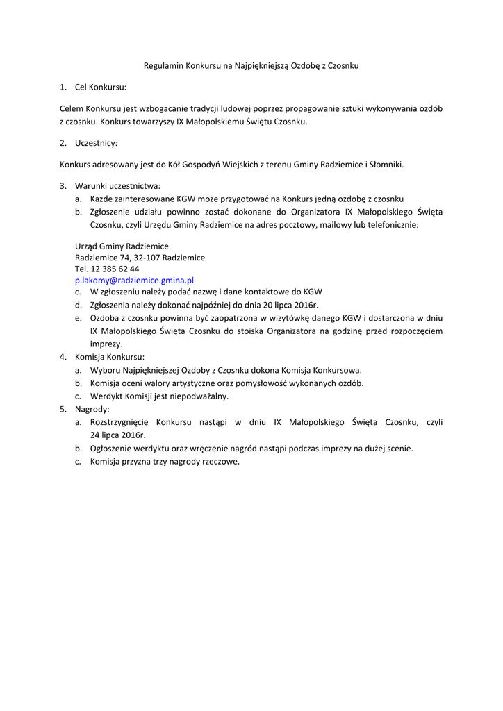 Regulamin Konkursu na Najpiękniejszą Ozdobę z Czosnku 1. Cel Konkursu: Celem Konkursu jest wzbogacanie tradycji ludowej poprzez propagowanie sztuki wykonywania ozdób z czosnku. Konkurs towarzyszy IX Małopolskiemu Świętu Czosnku. 2. Uczestnicy: Konkurs adresowany jest do Kół Gospodyń Wiejskich z terenu Gminy Radziemice i Słomniki. 3. Warunki uczestnictwa: a. Każde zainteresowane KGW może przygotować na Konkurs jedną ozdobę z czosnku b. Zgłoszenie udziału powinno zostać dokonane do Organizatora IX Małopolskiego Święta Czosnku, czyli Urzędu Gminy Radziemice na adres pocztowy, mailowy lub telefonicznie: Urząd Gminy Radziemice Radziemice 74, 32‐107 Radziemice Tel. 12 385 62 44 [email protected] c. W zgłoszeniu należy podać nazwę i dane kontaktowe do KGW d. Zgłoszenia należy dokonać najpóźniej do dnia 20 lipca 2016r. e. Ozdoba z czosnku powinna być zaopatrzona w wizytówkę danego KGW i dostarczona w dniu IX Małopolskiego Święta Czosnku do stoiska Organizatora na godzinę przed rozpoczęciem imprezy. 4. Komisja Konkursu: a. Wyboru Najpiękniejszej Ozdoby z Czosnku dokona Komisja Konkursowa. b. Komisja oceni walory artystyczne oraz pomysłowość wykonanych ozdób. c. Werdykt Komisji jest niepodważalny. 5. Nagrody: a. Rozstrzygnięcie Konkursu nastąpi w dniu IX Małopolskiego Święta Czosnku, czyli 24 lipca 2016r. b. Ogłoszenie werdyktu oraz wręczenie nagród nastąpi podczas imprezy na dużej scenie. c. Komisja przyzna trzy nagrody rzeczowe.