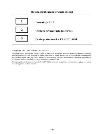 Ogólna struktura instrukcji obsługi Instrukcje BHP. Obsługa wykrawarki laserowej. Obsługa sterownika FANUC 160i-L. © Copyright 2005, LVD COMPANY NV. BELGIA Wszystkie prawa zastrzeŜone. śadnej części tej publikacji nie moŜna powielać ani przechowywać w systemie odzyskiwania danych lub przesyłać w Ŝadnej formie ani w Ŝaden sposób, czy to elektronicznie, mechanicznie, poprzez kserokopię, zapis lub w inny sposób bez wcześniejszej pisemnej zgody autora. Informacje znajdujące się w instrukcji podlegają zmianie bez wcześniejszego powiadomienia. Niniejszy podręcznik stanowi własność firmy LVD i bez pisemnej zgody firmy nie dopuszcza się jego powielania ani udostępniania osobom trzecim. 1 / 13 Wprowadzenie IMPULS i AXEL to wypalarki laserowe ze standardem „latającej optyki” do cięcia blach płaskich w arkuszach. Głowica tnąca przemieszcza się wzdłuŜ 3 osi: X, Y i Z. Sanie wzdłuŜne (oś X dla Impuls / oś Y dla Axel) przesuwają się na pewną odległość na belce, podczas gdy belka przemieszcza się na pewną odległość wzdłuŜ innej osi (oś Y dla Impuls / oś X dla Axel). Maksymalna odległość dla osi X i Y zaleŜy od wymiarów stołu. W skład sani wchodzi równieŜ pionowa oś Z z głowicą tnącą. Napędzana serwomechanizmem oś Z posiada skok rzędu 280 mm (Impuls) lub 100 mm (Axel) i pozwala głowicy tnącej na podąŜanie za falistością blachy. Urządzenia IMPULS i AXEL wykorzystują szybki laser CO2 o wysokiej mocy o przepływie osiowym, wzbudzany sterownikiem RF GE-Fanuc. Laser pracuje w trybie D. Dzięki tym specjalnym właściwościom, w połączeniu z róŜnymi urządzeniami impulsowymi, detale mogą być wykonywane z bardzo duŜą dokładnością. Źródło lasera, sterowanie, szafki elektryczne, układ odciągowy oraz jednostka chłodząca stanowią standardowe wyposaŜenie maszyny. Dostęp do maszyny dla celów obsługi i konserwacji jest moŜliwy z kaŜdej jej strony. Celem podręcznika jest pomoc osobom szkolonym w zakresie obsługi wypalarki laserowej firmy LVD/STRIPPIT. Powinno się go przetrzymywać w bezpiecznym i łatwo dostępnym miejscu tak, aby stanowił źródło informacji na temat właściwej obsługi maszyny. Informacje zawarte w dokumencie uwaŜa się aktualne na dzień jego publikacji. Jednak w wyniku ciągłego wprowadzania usprawnień technologicznych, informacje takie mogą ulec zmianie bez uprzedniego powiadomienia. Firma LVD/STRIPPIT stwierdza, Ŝe znajdujące się w tym podręczniku informacje są aktualne, lecz nie gwarantuje, Ŝe są wyczerpujące oraz informuje, Ŝe dla wykonania pewnych czynności z zakresu bezpieczeństwa konieczne moŜe być zastosowanie innych czynności. Podręcznika moŜna uŜywać z maszynami następującego typu (patrz poniŜszy wykaz) wyposaŜonymi w źródło lasera Fanuc CO2 (moŜliwe są róŜne jego typy) i w sterownik Fanuc 160i-L. IMPULS AXEL IMPULS 40(65)30 (4 lub 6 KW) AXEL 3015 S (2 lub 4 KW) IMPULS 6020 (4 lub 6 KW) AXEL 3015 L (2 lub 4 KW) IMPULS 4030 (4 lub 6 KW) AXEL 3015 LT (2 lub 4 KW) IMPULS 4020 R (4 lub 6 KW) AXEL 3015 SL (4 lub 5 KW) IMPULS 40(80)30 (4 lub 6 KW) IMPULS 40(125)30 (4 lub 6 KW) Instrukcja obsługi dla powyŜszych typów maszyn jest wspólna. Tematy dotyczące tylko jednego konkretnego typu wydrukowano kursywą. 2 / 13 Specyfikacja maszyny IMPULS 40(65)30 Maksymalny rozmiar blachy Suw na osi X Suw na osi Y Suw na osi Z Maks. prędkość pozycjonowania oś X oś Y X i Y jednocześnie oś Z Dokładność powtarzania Dokładność pozycjonowania 6500 mm x 3100 mm : 3150 mm 4050 mm 280 mm 60 m/min 60 m/min 85 m/min 15 m/min +/- 0,025 mm +/- 0,05 mm/m IMPULS 6020 Maksymalny rozmiar blachy Suw na osi X Suw na osi Y Suw na osi Z Maks. prędkość pozycjonowania oś X oś Y X i Y jednocześnie oś Z Dokładność powtarzania Dokładność pozycjonowania 6250 mm x 2100 mm : 2100 mm 6280 mm 280 mm 60 m/min 60 m/min 85 m/min 24 m/min +/- 0,025 mm +/- 0,05 mm/m IMPULS 4030 Maksymalny rozmiar blachy Suw na osi X Suw na osi Y Suw na osi Z Maks. prędkość pozycjonowania oś X oś Y X i Y jednocześnie oś Z Dokładność powtarzania Dokładność pozycjonowania 4000 mm x 3000 mm 3150 mm 4050 mm 280 mm 60 m/min 60 m/min 85 m/min 24 m/min +/- 0,025 mm +/- 0,05 mm/m IMPULS 4020 R Maksymalny rozmiar blachy Suw na osi X Suw na osi Y Suw na osi Z Maks. prędkość pozycjonowania oś X oś Y X i Y jednocześnie oś Z Dokładność powtarzania Dokładność pozycjonowania 4000 mm x 2000 mm 3150 mm 4050 mm 280 mm 60 m/min 60 m/min 85 m/min 24 m/min +/- 0,025 mm +/- 0,05 mm/m 3 / 13 IMPULS 40(80)30 Maksymalny rozmiar blachy Suw na osi X Suw na osi Y Suw na osi Z Maks. prędkość pozycjonowania oś X oś Y X i Y jednocześnie oś Z Dokładność powtarzania Dokładność pozycjonowania 8000 mm x 3100 mm : 3150 mm 4050 mm 280 mm 60 m/min 60 m/min 85 m/min 15 m/min +/- 0,025 mm +/- 0,05 mm/m IMPULS 40(125)30 Maksymalny rozmiar blachy Suw na osi X Suw na osi Y Suw na osi Z Maks. prędkość pozycjonowania oś X oś Y X i Y jednocześnie oś Z Dokładność powtarzania Dokładność pozycjonowania 12500 mm x 3100 mm : 3150 mm 4050 mm 280 mm 60 m/min 60 m/min 85 m/min 15 m/min +/- 0,025 mm +/- 0,05 mm/m AXEL 3015 S - AXEL 3015 L - AXEL 3015 LT Maksymalny rozmiar blachy Suw na osi X Suw na osi Y Suw na osi Z Maks. prędkość pozycjonowania oś X oś Y X i Y jednocześnie oś Z Dokładność powtarzania Dokładność pozycjonowania Maksymalna waga arkusza 3000 mm x 1500 mm : 3150 mm 1600 mm 100 mm 120 m/min 120 m/min 170 m/min 24 m/min +/- 0,025 mm +/- 0,05 mm/m 750 kg AXEL 3015 SL Maksymalny rozmiar blachy Suw na osi X Suw na osi Y Suw na osi Z Maks. prędkość pozycjonowania oś X oś Y X i Y jednocześnie oś Z Dokładność powtarzania Dokładność pozycjonowania Maksymalna waga arkusza 3000 mm x 1500 mm : 3150 mm 1600 mm 100 mm 120 m/min 120 m/min 170 m/min 24 m/min +/- 0,025 mm +/- 0,05 mm/m 750 kg 4 / 13 Zapobieganie wypadkom i urządzenia zabezpieczające Przed zapoz