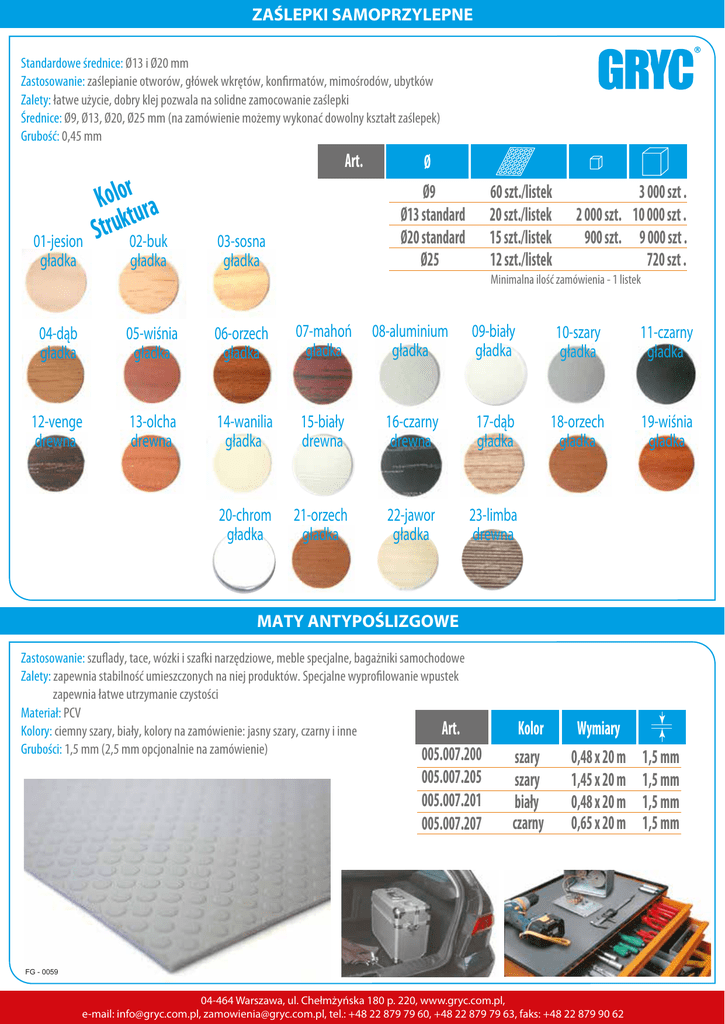ZAŚLEPKI SAMOPRZYLEPNE Standardowe średnice: Ø13 i Ø20 mm Zastosowanie: zaślepianie otworów, główek wkrętów, konfirmatów, mimośrodów, ubytków Zalety: łatwe użycie, dobry klej pozwala na solidne zamocowanie zaślepki Średnice: Ø9, Ø13, Ø20, Ø25 mm (na zamówienie możemy wykonać dowolny kształt zaślepek) Grubość: 0,45 mm 01-jesion gładka Kolor ura t Struk02-buk gładka Art. 03-sosna gładka Ø Ø9 Ø13 standard Ø20 standard Ø25 60 szt./listek 20 szt./listek 15 szt./listek 12 szt./listek 3 000 szt . 2 000 szt. 10 000 szt . 900 szt. 9 000 szt . 720 szt . Minimalna ilość zamówienia - 1 listek 04-dąb gładka 05-wiśnia gładka 06-orzech gładka 07-mahoń gładka 08-aluminium gładka 09-biały gładka 10-szary gładka 11-czarny gładka 12-venge drewna 13-olcha drewna 14-wanilia gładka 15-biały drewna 16-czarny drewna 17-dąb gładka 18-orzech gładka 19-wiśnia gładka 20-chrom gładka 21-orzech gładka 22-jawor gładka 23-limba drewna MATY ANTYPOŚLIZGOWE Zastosowanie: szuflady, tace, wózki i szafki narzędziowe, meble specjalne, bagażniki samochodowe Zalety: zapewnia stabilność umieszczonych na niej produktów. Specjalne wyprofilowanie wpustek zapewnia łatwe utrzymanie czystości Materiał: PCV Art. Kolory: ciemny szary, biały, kolory na zamówienie: jasny szary, czarny i inne Grubości: 1,5 mm (2,5 mm opcjonalnie na zamówienie) 005.007.200 005.007.205 005.007.201 005.007.207 Kolor szary szary biały czarny Wymiary 0,48 x 20 m 1,45 x 20 m 0,48 x 20 m 0,65 x 20 m FG - 0059 04-464 Warszawa, ul. Chełmżyńska 180 p. 220, www.gryc.com.pl, e-mail: [email protected], [email protected], tel.: +48 22 879 79 60, +48 22 879 79 63, faks: +48 22 879 90 62 1,5 mm 1,5 mm 1,5 mm 1,5 mm