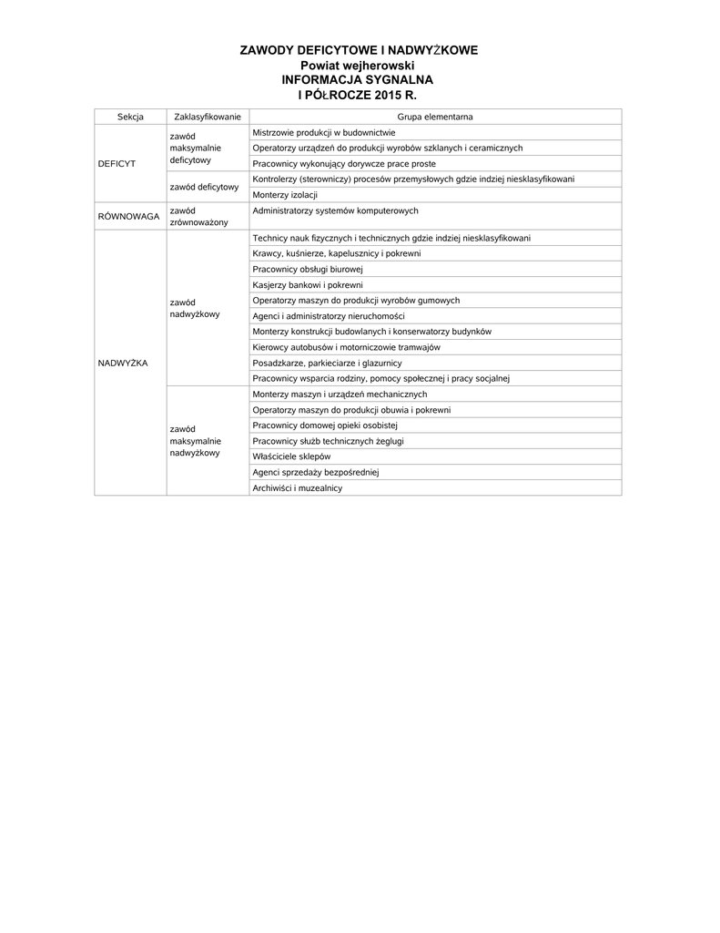 ZAWODY DEFICYTOWE I NADWYŻKOWE Powiat wejherowski INFORMACJA SYGNALNA I PÓŁROCZE 2015 R. Sekcja DEFICYT Zaklasyfikowanie zawód maksymalnie deficytowy zawód deficytowy RÓWNOWAGA zawód zrównoważony Grupa elementarna Mistrzowie produkcji w budownictwie Operatorzy urządzeń do produkcji wyrobów szklanych i ceramicznych Pracownicy wykonujący dorywcze prace proste Kontrolerzy (sterowniczy) procesów przemysłowych gdzie indziej niesklasyfikowani Monterzy izolacji Administratorzy systemów komputerowych Technicy nauk fizycznych i technicznych gdzie indziej niesklasyfikowani Krawcy, kuśnierze, kapelusznicy i pokrewni Pracownicy obsługi biurowej Kasjerzy bankowi i pokrewni zawód nadwyżkowy Operatorzy maszyn do produkcji wyrobów gumowych Agenci i administratorzy nieruchomości Monterzy konstrukcji budowlanych i konserwatorzy budynków Kierowcy autobusów i motorniczowie tramwajów NADWYŻKA Posadzkarze, parkieciarze i glazurnicy Pracownicy wsparcia rodziny, pomocy społecznej i pracy socjalnej Monterzy maszyn i urządzeń mechanicznych Operatorzy maszyn do produkcji obuwia i pokrewni zawód maksymalnie nadwyżkowy Pracownicy domowej opieki osobistej Pracownicy służb technicznych żeglugi Właściciele sklepów Agenci sprzedaży bezpośredniej Archiwiści i muzealnicy