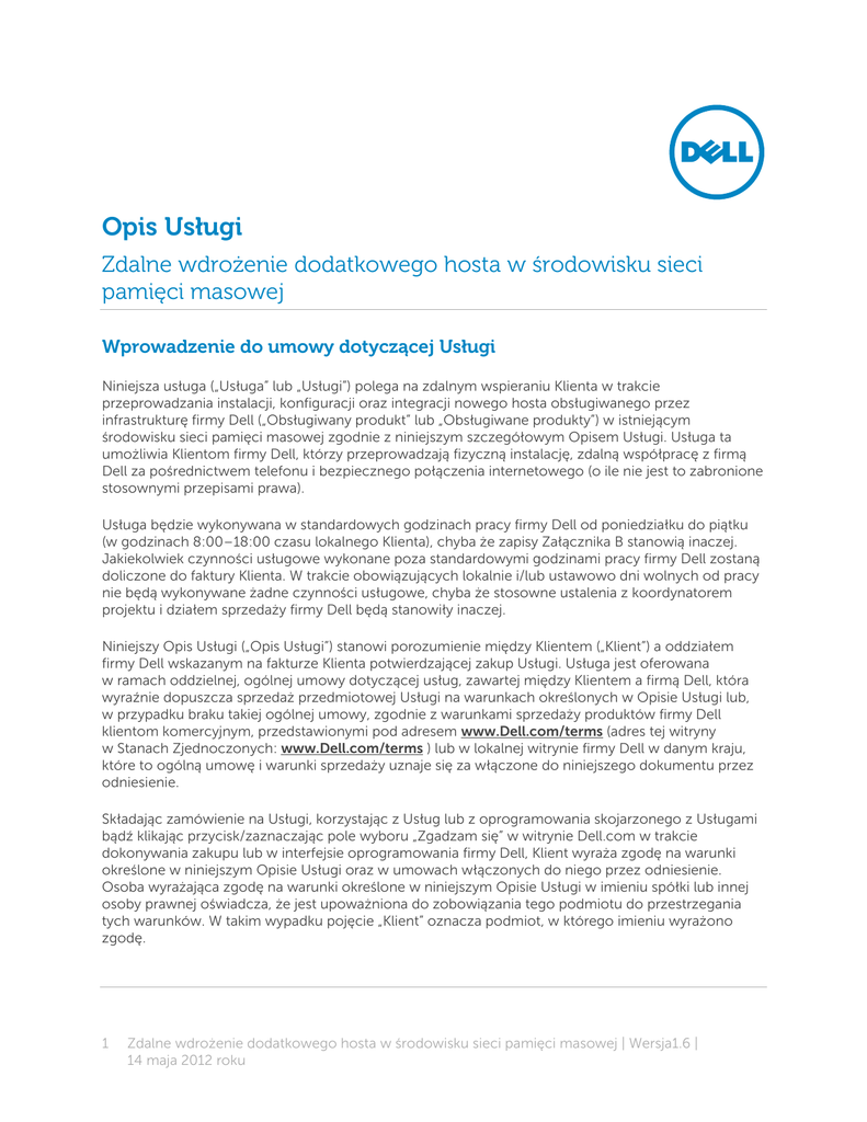 Opis Usługi Zdalne wdrożenie dodatkowego hosta w środowisku sieci pamięci masowej Wprowadzenie do umowy dotyczącej Usługi Niniejsza usługa („Usługa” lub „Usługi”) polega na zdalnym wspieraniu Klienta w trakcie przeprowadzania instalacji, konfiguracji oraz integracji nowego hosta obsługiwanego przez infrastrukturę firmy Dell („Obsługiwany produkt” lub „Obsługiwane produkty”) w istniejącym środowisku sieci pamięci masowej zgodnie z niniejszym szczegółowym Opisem Usługi. Usługa ta umożliwia Klientom firmy Dell, którzy przeprowadzają fizyczną instalację, zdalną współpracę z firmą Dell za pośrednictwem telefonu i bezpiecznego połączenia internetowego (o ile nie jest to zabronione stosownymi przepisami prawa). Usługa będzie wykonywana w standardowych godzinach pracy firmy Dell od poniedziałku do piątku (w godzinach 8:00–18:00 czasu lokalnego Klienta), chyba że zapisy Załącznika B stanowią inaczej. Jakiekolwiek czynności usługowe wykonane poza standardowymi godzinami pracy firmy Dell zostaną doliczone do faktury Klienta. W trakcie obowiązujących lokalnie i/lub ustawowo dni wolnych od pracy nie będą wykonywane żadne czynności usługowe, chyba że stosowne ustalenia z koordynatorem projektu i działem sprzedaży firmy Dell będą stanowiły inaczej. Niniejszy Opis Usługi („Opis Usługi”) stanowi porozumienie między Klientem („Klient”) a oddziałem firmy Dell wskazanym na fakturze Klienta potwierdzającej zakup Usługi. Usługa jest oferowana w ramach oddzielnej, ogólnej umowy dotyczącej usług, zawartej między Klientem a firmą Dell, która wyraźnie dopuszcza sprzedaż przedmiotowej Usługi na warunkach określonych w Opisie Usługi lub, w przypadku braku takiej ogólnej umowy, zgodnie z warunkami sprzedaży produktów firmy Dell klientom komercyjnym, przedstawionymi pod adresem www.Dell.com/terms (adres tej witryny w Stanach Zjednoczonych: www.Dell.com/terms ) lub w lokalnej witrynie firmy Dell w danym kraju, które to ogólną umowę i warunki sprzedaży uznaje się za włączone do niniejszego dokumentu przez odniesienie. Składając zamówienie na Usługi, korzystając z Usług lub z oprogramowania skojarzonego z Usługami bądź klikając przycisk/zaznaczając pole wyboru „Zgadzam się” w witrynie Dell.com w trakcie dokonywania zakupu lub w interfejsie oprogramowania firmy Dell, Klient wyraża zgodę na warunki określone w niniejszym Opisie Usługi oraz w umowach włączonych do niego przez odniesienie. Osoba wyrażająca zgodę na warunki określone w niniejszym Opisie Usługi w imieniu spółki lub innej osoby prawnej oświadcza, że jest upoważniona do zobowiązania tego podmiotu do przestrzegania tych warunków. W takim wypadku pojęcie „Klient” oznacza podmiot, w którego imieniu wyrażono zgodę. 1 Zdalne wdrożenie dodatkowego hosta w środowisku sieci pamięci masowej | Wersja1.6 | 14 maja 2012 roku Zakres umowy dotyczącej Usługi Kody SKU Usługi Zobacz Załącznik A. Główne etapy wykonywania Usługi • Zaplanowanie i zaprojektowanie: 1. Sprawdzenie niniejszego Opisu Usługi w celu zapoznania się z zakresem prac. 2. Uzyskanie i sprawdzenie informacji na temat konfiguracji technicznej, niezbędnych do przeprowadzenia instalacji. 3. Opracowanie prawidłowego projektu na podstawie konfiguracji technicznej urządzeń i oprogramowania Klienta. 4. Opracowanie harmonogramu wdrożenia. • Zdalne zainstalowanie: 1. Przygotowanie hosta: a. Zainstalowanie odpowiednich sterowników i oprogramowania na hoście. 2. Wyodrębnienie maksymalnie 2 jednostek logicznych z istniejącej sieci pamięci masowej i przypisanie ich do hosta. • Przetestowanie: 1. Sprawdzenie, czy możliwy jest odczyt/zapis na przypisanej jednostce logicznej z poziomu hosta dodanego do sieci pamięci masowej. • Zamknięcie projektu: 1. Przeprowadzenie krótkiego spotkania informacyjnego z Klientem w zakresie wdrożenia i dokumentacji dotyczącej wdrożenia. To omówienie nie zastępuje dostępnych kursów dla Klienta dotyczących tych produktów. 2. Uzyskanie od Klienta akceptacji wykonanych Usług. Usługi wykluczone • Fizyczne zainstalowanie jakichkolwiek urządzeń lub programów niezwiązanych z niniejszą Usługą. • Okablowanie sieci i inne czynności związane ze środowiskiem lub zasilaniem. • Skonfigurowanie nowych macierzy pamięci masowej (Usługa jest wykonywana na istniejącej sieci pamięci masowej). • Podniesienie wydajności, zoptymalizowanie działania systemu, tworzenie skryptów albo inne podobne Usługi. • Skonfigurowanie jakiegokolwiek nieobsługiwanego systemu operacyjnego pod kątem macierzy pamięci masowej. • Zutylizowanie elementów opakowań oraz innych odpadów. • Jakiekolwiek czynności niewymienione wyraźnie w niniejszym Opisie Usługi. 2 Zdalne wdrożenie dodatkowego hosta w środowisku sieci pamięci masowej | Wersja1.6 | 14 maja 2012 roku Obowiązki Klienta związane z Usługą • Przygotowanie obiektów Klienta: 1. Dopilnowanie, by pożądana konfiguracja spełniała minimalne wymagania systemowe dostawcy w zakresie konfiguracji urządzeń i oprogramowania, takie jak wymagania dotyczące dodatków Service Pack, jąder czy systemu BIOS. 2. Dopilnowanie, by przed wykonaniem niniejszej Usługi zostały spełnione wymagania techniczne i wymagania dotyczące środowiska, np. by zapewniono odpowiednie zasilanie. 3. Dopilnowanie, by obsługiwany system operacyjny z aktualnym dodatkiem Service Pack i systemem BIOS był zainstalowany na serwerze zarządzania i sprawny. 4. Dopilnowanie, by zostały wykonane kopie zapasowe wszystkich istniejących konfiguracji sieci, które będą podlegać czynnościom usługowym. 5. Dopilnowanie, by cały system obsługi pamięci masowej (serwery, urządzenia pamięci masowej, systemy operacyjne, oprogramowanie i wzajemne połączenia) był co najmniej na poziomie zgodnym z minimalnymi wymaganiami dotyczącymi obsługiwanych wersji urządzeń, oprogramow