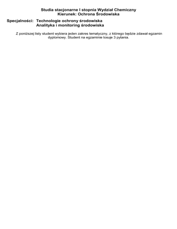 Studia stacjonarne I stopnia Wydział Chemiczny Kierunek: Ochrona Środowiska Specjalności: Technologie ochrony środowiska Analityka i monitoring środowiska .Z poniższej listy student wybiera jeden zakres tematyczny, z którego będzie zdawał egzamin dyplomowy. Student na egzaminie losuje 3 pytania. „Analityka chemiczna” 1. 2. 3. 4. 5. 6. 7. 8. 9. 10. 11. 12. 13. 14. 15. 16. 17. 18. 19. 20. 21. 22. 23. 24. Zasady pobierania reprezentatywnej próbki z partii materiału. Absorpcyjna spektrometria atomowa. Zasada pomiaru i zasadnicze elementy spektrometru AAS. Wielkości charakteryzujące metodę analityczną. Wysokosprawna chromatografia cieczowa (HPLC) – budowa aparatu, zasada rozdziału mieszaniny związków. Metody przeprowadzania próbek stałych do roztworu. Spektrofotometria UV-VIS. Prawo Lamberta-Beera, molowy współczynnik absorpcji, krzywa absorpcji, schemat blokowy spektrofotometru. Iloczyn rozpuszczalności. Obliczanie rozpuszczalności związków trudno rozpuszczalnych, czynniki wpływające na rozpuszczalność osadów. Emisyjna spektrometria atomowa. Zasada pomiaru, podstawowe elementy spektrometru ICP. Rola wskaźnika w metodach miareczkowych i zasada doboru wskaźnika. Teorie działania wskaźników alkacymetrycznych. Klasyfikacja metod chromatograficznych i ich analityczne zastosowanie. Teoria Brönsteda. Sprzężona para kwas – zasada, przykłady i kierunek reakcji protolizy. Chromatografia gazowa. Zasada rozdziału i oznaczenia, podstawowe elementy chromatografu GC. Reakcje utleniania i redukcji. Wzór Nernsta dla układów red-oks, kierunek reakcji, czynniki wpływające na przebieg reakcji. Metody bezwzględne i porównawcze. Sposoby kalibracji w metodach porównawczych. Kompleksy proste i chelatowe, czynniki wpływające na trwałość kompleksów. Zastosowanie EDTA w analizie chemicznej. Podstawy potencjometrii. Wzór Nernsta, rodzaje elektrod, zasada pomiaru potencjału. Rodzaje miareczkowań – bezpośrednie, pośrednie, odwrotne i podstawieniowe, podać przykłady. Analiza śladowa – metody rozdzielania i zagęszczania. Roztwory buforowe. Skład, mechanizm działania i zastosowanie w analizie chemicznej. Rola i znaczenie wzorców w analizie chemicznej – wzorce pierwotne, roztwory wzorcowe, materiały odniesienia. Rodzaje błędów w analizie chemicznej. Podstawy polarografii i jej zastosowanie w analizie chemicznej. Rodzaje osadów, zasada wytrącania osadów, mechanizmy współstrącenia, wytrącanie z roztworów jednorodnych. Kryteria wyboru metody analitycznej. „Geologia, gleboznawstwo i podstawy ochrony powierzchni ziemi” 1. 2. 3. 4. 5. 6. 7. 8. 9. 10. 11. 12. 13. 14. 15. 16. 17. 18. 19. 20. 21. 22. 23. 24. Budowa Ziemi. Plutonizm i wulkanizm. Podział genetyczny skał krystalicznych, charakterystyka skał i minerałów. Przyczyny i rodzaje metamorfizmu. Podstawy tektoniki płyt. Egzogeniczne procesy geologiczne. Geneza i charakterystyka skał osadowych. Charakterystyka wybranych procesów geomorfologicznych. Surowce mineralne Polski – geneza wybranych złóż i ich znaczenie gospodarcze. Profil i przekrój geologiczny, mapy geologiczne. Procesy glebotwórcze. Systematyka gleb Polski. Charakterystyka gleb bielicoziemnych i brunatnoziemnych. Właściwości sorpcyjne gleb. Odczyn gleb, rodzaje kwasowości, skutki zakwaszenia. Charakterystyka frakcji organicznej gleb. Woda w glebie. Metody badań w geologii i gleboznawstwie. Geomechaniczna i fizyczna degradacja gleb – źródła i metody rekultywacji. Chemiczna degradacja gleb – źródła i metody rekultywacji. Technologie przetwarzania i zagospodarowania odpadów komunalnych. Zasady lokalizacji, eksploatacji i rekultywacji składowisk odpadów. Termiczne przekształcanie odpadów. Osady ściekowe – technologie przetwarzania. Odpady górnicze i energetyczne – kierunki wykorzystania. Pozwolenia i dokumentacja w gospodarce odpadami. „Chemia i ochrona atmosfery” 1. 2. 3. 4. 5. 6. 7. 8. 9. 10. 11. 12. 13. 14. 15. 16. 17. 18. 19. 20. 21. 22. 23. 24. Charakterystyka atmosfery ziemskiej Scharakteryzować źródła i rodzaje zanieczyszczeń atmosfery Skutki zanieczyszczenia atmosfery Efekt cieplarniany i gazy cieplarniane. Metody zmniejszania emisji CO2 i CH4. Mechanizmy powstawania i niszczenia ozonu w stratosferze Chlorofluorowęglowodory i ich rola w niszczeniu warstwy ozonowej Mechanizm tworzenia „dziur ozonowych” w strefach okołobiegunowych Ozon troposferyczny Mechanizm tworzenia smogu fotochemicznego Źródła, mechanizm powstawania i szkodliwość kwaśnych dreszczów Porównanie smogu chemicznego i fotochemicznego Usuwanie gazów kwaśnych metodą absorpcji w roztworach amin Metody usuwania siarkowodoru z gazów. Proces Clausa Źródła SO2 i jego usuwanie z gazów odlotowych Usuwanie NOx ze źródeł stacjonarnych ze szczególnym uwzględnieniem metody SCR Szkodliwość i unieszkodliwianie spalin samochodów z silnikiem benzynowym Szkodliwość i unieszkodliwianie spalin środków transportu z silnikiem Diesla Źródła i charakterystyka lotnych związków organicznych (LZO) Metody unieszkodliwiania lotnych związków organicznych (LZO) Charakterystyka pyłów. Typy urządzeń odpylających Scharaktreryzować odnawialne źródła energii Katalityczne spalanie metanu w gazach turbinowych i jego związek z ochroną środowiska Porównać wady i zalety konwencjonalnych i odnawialnych źródeł energii Źródła i skutki obecności chloru w atmosferze „Zanieczyszczenia i ochrona wód” 1. 2. 3. 4. 5. 6. 7. 8. 9. 10. 11. 12. 13. 14. 15. 16. 17. 18. 19. 20. 21. 22. 23. 24. Krążenie wody w przyrodzie. Chemiczne metody dezynfekcji wody. Fizyczne metody dezynfekcji wody. Tlenowe wskaźniki jakości wody. Czynniki wpływające na pojemność buforową wody. Usuwanie związków żelaza i manganu z wody. Współczesne metody usuwania związków azotu i fosforu zawartych w ściekach. Ocena jakości ekosystemów wodnych przy użyciu pojęcia saprobowości. Klasy jakości wody. Ocz
