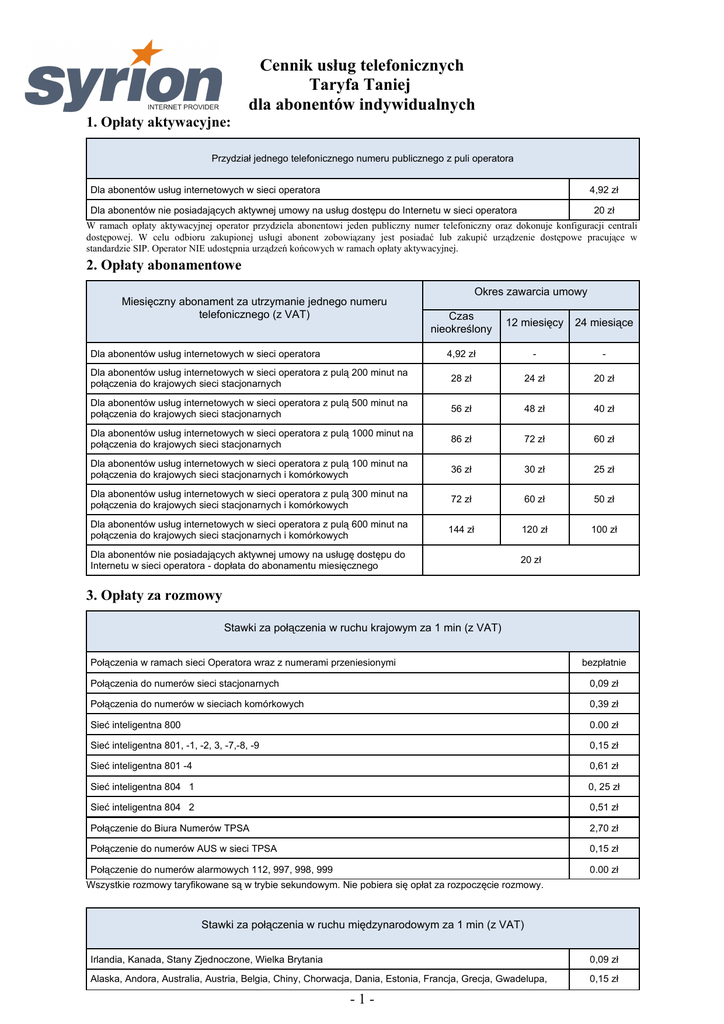 Cennik usług telefonicznych Taryfa Taniej dla abonentów indywidualnych 1. Opłaty aktywacyjne: Przydział jednego telefonicznego numeru publicznego z puli operatora Dla abonentów usług internetowych w sieci operatora 4,92 zł Dla abonentów nie posiadających aktywnej umowy na usług dostępu do Internetu w sieci operatora 20 zł W ramach opłaty aktywacyjnej operator przydziela abonentowi jeden publiczny numer telefoniczny oraz dokonuje konfiguracji centrali dostępowej. W celu odbioru zakupionej usługi abonent zobowiązany jest posiadać lub zakupić urządzenie dostępowe pracujące w standardzie SIP. Operator NIE udostępnia urządzeń końcowych w ramach opłaty aktywacyjnej. 2. Opłaty abonamentowe Miesięczny abonament za utrzymanie jednego numeru telefonicznego (z VAT) Okres zawarcia umowy Czas nieokreślony 12 miesięcy 24 miesiące 4,92 zł - - Dla abonentów usług internetowych w sieci operatora z pulą 200 minut na połączenia do krajowych sieci stacjonarnych 28 zł 24 zł 20 zł Dla abonentów usług internetowych w sieci operatora z pulą 500 minut na połączenia do krajowych sieci stacjonarnych 56 zł 48 zł 40 zł Dla abonentów usług internetowych w sieci operatora z pulą 1000 minut na połączenia do krajowych sieci stacjonarnych 86 zł 72 zł 60 zł Dla abonentów usług internetowych w sieci operatora z pulą 100 minut na połączenia do krajowych sieci stacjonarnych i komórkowych 36 zł 30 zł 25 zł Dla abonentów usług internetowych w sieci operatora z pulą 300 minut na połączenia do krajowych sieci stacjonarnych i komórkowych 72 zł 60 zł 50 zł Dla abonentów usług internetowych w sieci operatora z pulą 600 minut na połączenia do krajowych sieci stacjonarnych i komórkowych 144 zł 120 zł 100 zł Dla abonentów usług internetowych w sieci operatora Dla abonentów nie posiadających aktywnej umowy na usługę dostępu do Internetu w sieci operatora - dopłata do abonamentu miesięcznego 20 zł 3. Opłaty za rozmowy Stawki za połączenia w ruchu krajowym za 1 min (z VAT) Połączenia w ramach sieci Operatora wraz z numerami przeniesionymi bezpłatnie Połączenia do numerów sieci stacjonarnych 0,09 zł Połączenia do numerów w sieciach komórkowych 0,39 zł Sieć inteligentna 800 0.00 zł Sieć inteligentna 801, -1, -2, 3, -7,-8, -9 0,15 zł Sieć inteligentna 801 -4 0,61 zł Sieć inteligentna 804 1 0, 25 zł Sieć inteligentna 804 2 0,51 zł Połączenie do Biura Numerów TPSA 2,70 zł Połączenie do numerów AUS w sieci TPSA 0,15 zł Połączenie do numerów alarmowych 112, 997, 998, 999 0.00 zł Wszystkie rozmowy taryfikowane są w trybie sekundowym. Nie pobiera się opłat za rozpoczęcie rozmowy. Stawki za połączenia w ruchu międzynarodowym za 1 min (z VAT) Irlandia, Kanada, Stany Zjednoczone, Wielka Brytania 0,09 zł Alaska, Andora, Australia, Austria, Belgia, Chiny, Chorwacja, Dania, Estonia, Francja, Grecja, Gwadelupa, 0,15 zł -1- Guam, Hawaje, Hiszpania, Holandia, Hong-Kong, Izrael, Luksemburg, Martynika, Niemcy, Norwegia, Panama, Portugalia, Portoryko, Singapur, Słowacja, Słowenia, Szwajcaria, Szwecja, Tajwan, Tajlandia, Węgry, Włochy, Wyspy Dziewicze Stanów Zjednoczonych Bahamy, Bangladesz, Brunei, Bułgaria, Cypr, Czechy, Finlandia, Indie, Japonia, Jordania, Korea Południowa, Liechtenstein, Litwa, Łotwa, Malezja, Monako, Peru, Rumunia, San Marino, Zambia 0,25 zł Albania, Argentyna, Bahrajn, Barbados, Bermudy, Ghana, Kostaryka, Laos, Makao, Macedonia, Malta, Rosja, Samoa Amerykańskie, Serbia, Tajwan – komórkowe, Urugwaj, Wietnam 0,40 zł Algieria, Australia – komórkowe, Burundi, Chile, Dominikana, Egipt, Finlandia – komórkowe, Indonezja, Irak, Japonia – komórkowe, Kenia, Kirgistan, Kolumbia, Kuwejt, Mauritius, Meksyk, Pakistan, Seszele, Sudan, Szwecja – komórkowe, Tadżykistan, Trynidad i Tobago, Turkmenistan, Ukraina, Uzbekistan, Zimbabwe, Wyspa Wielkanocna 0,60 zł Algieria – komórkowe, Antyle Holenderskie, Arabia Saudyjska, Azerbejdżan, Boliwia, Bośnia i Hercegowina, Czad, Francja – komórkowe, Gruzja, Grecja – komórkowe, Gwatemala, Honduras, Iran, Jordania, Kazachstan, Malawi, Mołdawia, Mongolia, Montserrat, Mozambik, Niemcy – komórkowe, Nigeria, Nowa Zelandia, Panama – komórkowe, Portugalia – komórkowe, Rwanda, Saint Lucia, Sri Lanka, Tanzania, Turks i Caicos, Uganda, Ukraina – komórkowe, Węgry – komórka, Wenezuela 0,85 zł Angola, Armenia, Aruba, Austria – komórkowe, Barbados – komórkowe, Belgia – komórkowe, Benin, Bhutan, Brazylia, Chorwacja – komórkowe, Czechy – komórkowe, Dominika, Filipiny, Haiti, Holandia – komórkowe, Jemen, Kajmany, Katar, Lesoto, Liban, Litwa – komórkowe, Luksemburg – komórkowe, Meksyk – komórkowe, Namibia, Nepal, Norwegia – komórkowe, Oman, Palestyna, Senegal, Słowacja – komórkowe, Republika Południowej Afryki, Saint Kitts i Nevis, Saint-Pierre i Miquelon, Syria, Turcja, Zambia – komórkowe , Zjednoczone Emiraty Arabskie 1,10 zł Afganistan, Andora – komórkowe, Antigua i Barbuda, Azerbejdżan – komórkowe, Białoruś, Belize, Botswana, Brytyjskie Wyspy Dziewicze, Burkina Faso, Dania – komórkowe, Ekwador, Estonia – Komórkowe, Gabon, Ghana – komórkowe, Gibraltar, Grenada, Gujana, Gwinea Równikowa, Hiszpania – komórkowe, Irlandia – komórkowe, Izrael – komórkowe, Jamajka, Kamerun, Libia, Łotwa – komórkowe, Macedonia, Malediwy, Mali, Malta – komórkowe, Mauretania, Niger, Nikaragua, Palestyna – komórkowe, Peru – komórkowe, Rumunia – komórkowe, Serbia – komórkowe, Suazi, Surinam, Urugwaj – komórkowe, Wielka Brytania – komórkowe, Wybrzeże Kości Słoniowej 1,40 zł Albania – komórkowe, Bośnia i Hercegowina – komórkowe, Czarnogóra, Erytrea, Etiopia, Fidżi, Gambia, Gujana Francuska, Islandia, Kongo, Liberia, Maroko, Mikronezja, Monako – komórkowe, Nowa Kaledonia, Republika Zielonego Przylądka, Saint Vincent i Grenadyny , Salwador, Sierra Leone, Słoweni