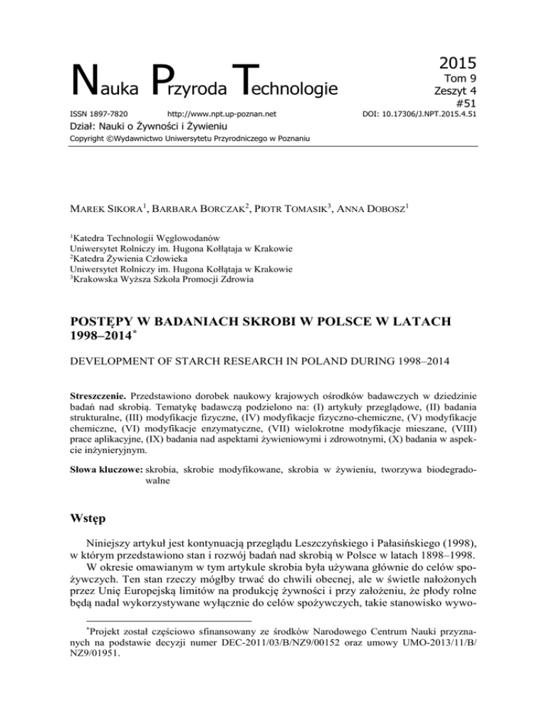 N auka ISSN 1897-7820 P rzyroda T 2015 echnologie http://www.npt.up-poznan.net Tom 9 Zeszyt 4 #51 DOI: 10.17306/J.NPT.2015.4.51 Dział: Nauki o Żywności i Żywieniu Copyright ©Wydawnictwo Uniwersytetu Przyrodniczego w Poznaniu MAREK SIKORA1, BARBARA BORCZAK2, PIOTR TOMASIK3, ANNA DOBOSZ1 1 Katedra Technologii Węglowodanów Uniwersytet Rolniczy im. Hugona Kołłątaja w Krakowie 2 Katedra Żywienia Człowieka Uniwersytet Rolniczy im. Hugona Kołłątaja w Krakowie 3 Krakowska Wyższa Szkoła Promocji Zdrowia POSTĘPY W BADANIACH SKROBI W POLSCE W LATACH 1998–2014 * DEVELOPMENT OF STARCH RESEARCH IN POLAND DURING 1998–2014 Streszczenie. Przedstawiono dorobek naukowy krajowych ośrodków badawczych w dziedzinie badań nad skrobią. Tematykę badawczą podzielono na: (I) artykuły przeglądowe, (II) badania strukturalne, (III) modyfikacje fizyczne, (IV) modyfikacje fizyczno-chemiczne, (V) modyfikacje chemiczne, (VI) modyfikacje enzymatyczne, (VII) wielokrotne modyfikacje mieszane, (VIII) prace aplikacyjne, (IX) badania nad aspektami żywieniowymi i zdrowotnymi, (X) badania w aspekcie inżynieryjnym. Słowa kluczowe: skrobia, skrobie modyfikowane, skrobia w żywieniu, tworzywa biodegradowalne Wstęp Niniejszy artykuł jest kontynuacją przeglądu Leszczyńskiego i Pałasińskiego (1998), w którym przedstawiono stan i rozwój badań nad skrobią w Polsce w latach 1898–1998. W okresie omawianym w tym artykule skrobia była używana głównie do celów spożywczych. Ten stan rzeczy mógłby trwać do chwili obecnej, ale w świetle nałożonych przez Unię Europejską limitów na produkcję żywności i przy założeniu, że płody rolne będą nadal wykorzystywane wyłącznie do celów spożywczych, takie stanowisko wywo*Projekt został częściowo sfinansowany ze środków Narodowego Centrum Nauki przyznanych na podstawie decyzji numer DEC-2011/03/B/NZ9/00152 oraz umowy UMO-2013/11/B/ NZ9/01951. 2 Sikora, M., Borczak, B., Tomasik, P., Dobosz, A. (2015). Postępy w badaniach skrobi w Polsce w latach 1998–2014. Nauka Przyr. Technol., 9, 4, #51. DOI: 10.17306/J.NPT.2015.4.51 łałoby stagnację, a nawet regres ekonomiczny kraju. Wykorzystanie płodów rolnych do celów niespożywczych może być korzystne dla krajowego rolnictwa i gałęzi przemysłu współpracujących z rolnictwem. Unia Europejska planuje około 300-procentowy wzrost produkcji przemysłu chemicznego do 2040 roku (Tomasik, 1999; Tomasik i Gładkowski, 2001). Tak więc konieczne staje się poszukiwanie nowych źródeł surowców i energii. Coraz ostrzejsze stają się regulacje ekologiczne oraz dyktat polityczny ze strony krajów zasobnych w surowce mineralne. Wśród nowych źródeł energii bierze się pod uwagę materiały rozszczepialne, promieniowanie słoneczne (baterie słoneczne), źródła termalne, wiatr i płynące wody, a surowców dla przemysłu chemicznego upatruje się w roślinach, przede wszystkim w płodach rolnych. Zainteresowanie roślinami jako surowcem wynika z ich natury chemicznej, dostępności, odnawialności, czasami wielokrotnej w ciągu roku, i biodegradowalności. Gromadzą one w biomasie znaczące ilości węglowodanów – cukrów prostych, skrobi, celulozy, białka oraz lipidów. Obecny stan techniki i znane technologie pozwalają otrzymać z roślin i materiału roślinnego zawierającego sacharydy i polisacharydy szereg podstawowych materiałów dla przemysłu chemicznego. Dostępne krajowe zasoby surowców polisacharydowych można wykorzystywać bez znacznego ich przetwarzania, przystosowując je do różnych celów poprzez modyfikacje fizyczne, fizyczno-chemiczne, chemiczne i enzymatyczne. Przykładem takich zastosowań mogą być apretury, środki adhezyjne, mikrokapsułki, sorbenty, dodatki do pulpy celulozowej używanej w produkcji papieru, tworzywa biodegradowalne różnych generacji, płuczki wiertnicze czy media hartownicze. Poszukiwanie nowych roślinnych surowców i materiałów i wykorzystywanie ich do celów niespożywczych nie zwalnia od tworzenia nowych i doskonalenia dotąd stosowanych materiałów tego samego pochodzenia, ale wykorzystywanych do celów spożywczych. Niniejszy artykuł jest retrospektywą badań nad skrobią prowadzonych w Polsce, począwszy od 1998 roku do chwili obecnej. Badania nad skrobią są prowadzone w następujących ośrodkach, wymienionych w kolejności alfabetycznej: Częstochowa – Akademia im. Jana Długosza, Gdańsk – Politechnika Gdańska, Kraków – Uniwersytet Rolniczy im. Hugona Kołłątaja, Uniwersytet Jagielloński i Krakowska Wyższa Szkoła Promocji Zdrowia, Lublin – Uniwersytet Przyrodniczy, Łódź – Politechnika Łódzka, Olsztyn – Instytut Rozrodu Zwierząt i Badań Żywności PAN, Poznań – Uniwersytet Przyrodniczy i byłe Centralne Laboratorium Przemysłu Ziemniaczanego, a obecnie Oddział Instytutu Biotechnologii Przemysłu Rolno-Spożywczego, Szczecin – Zachodniopomorski Uniwersytet Technologiczny, Wrocław – Uniwersytet Przyrodniczy, Zielona Góra – Uniwersytet Zielonogórski. Artykuły przeglądowe W analizowanym okresie z polskich ośrodków zajmujących się badaniami nad skrobią wyszedł szereg artykułów przeglądowych o zasięgu światowym. Artykuły te omawiają sposoby polepszenia jakości ziaren skrobi z roślin motylkowych i ich charakterystykę agronomiczną na podstawie składu polisacharydowego tych ziaren (Cukor i in., 2001; Kadlec i in., 2001), sposoby modyfikacji skrobi (Sikora i Krystyjan, 2009; Sta- 3 Sikora, M., Borczak, B., Tomasik, P., Dobosz, A. (2015). Postępy w badaniach skrobi w Polsce w latach 1998–2014. Nauka Przyr. Technol., 9, 4, #51. DOI: 10.17306/J.NPT.2015.4.51 roszczyk i in., 2008; Tomasik, 2009; Tomasik i Schilling, 1998a, 1998b, 2004; Tomasik i in., 2004a, 2004b, 2004c), właściwości skrobi niemodyfikowanych (Tomasik i Horton, 2012) i modyfikowanych (Fiedorowicz i in., 2006; Sikora i Tomasik, 2010; Szymońska i Tomasik, 2010), pewne ich zastosowania (Gottfried 