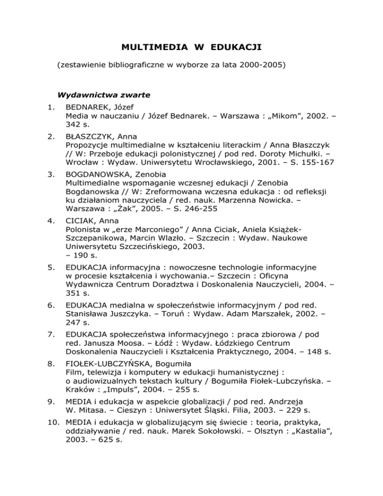 MULTIMEDIA W EDUKACJI (zestawienie bibliograficzne w wyborze za lata 2000-2005) Wydawnictwa zwarte 1. BEDNAREK, Józef Media w nauczaniu / Józef Bednarek. – Warszawa : „Mikom”, 2002. – 342 s. 2. BŁASZCZYK, Anna Propozycje multimedialne w kształceniu literackim / Anna Błaszczyk // W: Przeboje edukacji polonistycznej / pod red. Doroty Michułki. – Wrocław : Wydaw. Uniwersytetu Wrocławskiego, 2001. – S. 155-167 3. BOGDANOWSKA, Zenobia Multimedialne wspomaganie wczesnej edukacji / Zenobia Bogdanowska // W: Zreformowana wczesna edukacja : od refleksji ku działaniom nauczyciela / red. nauk. Marzenna Nowicka. – Warszawa : „Żak”, 2005. – S. 246-255 4. CICIAK, Anna Polonista w „erze Marconiego” / Anna Ciciak, Aniela KsiążekSzczepanikowa, Marcin Wlazło. – Szczecin : Wydaw. Naukowe Uniwersytetu Szczecińskiego, 2003. – 190 s. 5. EDUKACJA informacyjna : nowoczesne technologie informacyjne w procesie kształcenia i wychowania.– Szczecin : Oficyna Wydawnicza Centrum Doradztwa i Doskonalenia Nauczycieli, 2004. – 351 s. 6. EDUKACJA medialna w społeczeństwie informacyjnym / pod red. Stanisława Juszczyka. – Toruń : Wydaw. Adam Marszałek, 2002. – 247 s. 7. EDUKACJA społeczeństwa informacyjnego : praca zbiorowa / pod red. Janusza Moosa. – Łódź : Wydaw. Łódzkiego Centrum Doskonalenia Nauczycieli i Kształcenia Praktycznego, 2004. – 148 s. 8. FIOŁEK-LUBCZYŃSKA, Bogumiła Film, telewizja i komputery w edukacji humanistycznej : o audiowizualnych tekstach kultury / Bogumiła Fiołek-Lubczyńska. – Kraków : „Impuls”, 2004. – 255 s. 9. MEDIA i edukacja w aspekcie globalizacji / pod red. Andrzeja W. Mitasa. – Cieszyn : Uniwersytet Śląski. Filia, 2003. – 229 s. 10. MEDIA i edukacja w globalizującym się świecie : teoria, praktyka, oddziaływanie / red. nauk. Marek Sokołowski. – Olsztyn : „Kastalia”, 2003. – 625 s. 11. MULTIMEDIA w edukacji historycznej i społecznej / red. nauk. Janusz Rulka, Barbara Tarnowska. – Bydgoszcz : Wydaw. Akademii Bydgoskiej im. Kazimierza Wielkiego, 2002. – 305 s. 12. OD TEATRU żaków do Internetu : o edukacji humanistycznej w szkole / pod red. Barbary Myrdzik.– Lublin : Wydaw. Uniwersytetu Marii Curie-Skłodowskiej, 2003. – 266 s. 13. PEDAGOGIKA a środki informatyczne i media / pod red. Macieja Tanasia. – Warszawa : Wyższa Szkoła Pedagogiczna ZNP ; Kraków : „Impuls”, 2004. – 212 s. 14. PERZYCKA, Elżbieta eduROMy w nauczaniu przyrody : multimedia w szkole podstawowej / Elżbieta Perzycka. – Szczecin : Oficyna Wydawnicza Centrum Doradztwa i Doskonalenia Nauczycieli, 2004. – 207 s. 15. ROLA i miejsce technologii informacyjnej w okresie reform edukacyjnych w Polsce / pod red. Tadeusza Lewowickiego i Bronisława Siemienieckiego. – Toruń : Wydaw. Adam Marszałek, 2002. – 466 s. 16. SKARBIŃSKA, Aleksandra Multimedia w Logo Komeniuszu : próby edukacyjnych zastosowań / Aleksandra Skarbińska. – Toruń : Wydaw. Adam Marszałek, 2001. – 130 s. 17. STANDARDY wyposażenia i obudowy medialnej przedmiotów ogólnokształcących : gimnazjum / red. Andrzej Bogaj, Stefan M. Kwiatkowski. – Warszawa : Instytut Badań Edukacyjnych, 2002. – 194 s. 18. STANDARDY wyposażenia i obudowy medialnej przedmiotów ogólnokształcących : szkoła podstawowa / red. Andrzej Bogaj, Stefan M. Kwiatkowski. – Warszawa : Instytut Badań Edukacyjnych, 2002. – 140 s. 19. ŚRODKI audiowizualne w katechezie / pod red. Stanisława Kulpaczyńskiego. – Lublin : „Polihymnia”, 2004. – 254 s. 20. TECHNOLOGIA informacyjna w polskiej edukacji / red. Bronisław Siemieniecki. – Toruń : Wydaw. Adam Marszałek, 2002. – 119 s. 21. TOPOL, Paweł Intermedialne nauczanie języka obcego / Paweł Topol. – Poznań : Wydaw. Naukowe Uniwersytetu im. Adama Mickiewicza, 2003. – 140 s. 22. WALAT, Wojciech Podręcznik multimedialny : teoria, metodologia, przykłady / Wojciech Walat. – Rzeszów : Wydaw. Uniwersytetu Rzeszowskiego, 2004. – 362 s. 23. WSPÓŁCZESNA technologia informacyjna i edukacja medialna / red. Tadeusz Lewowicki, Bronisław Siemieniecki. – Toruń : Wydaw. Adam Marszałek, 2005.– 565 s. Artykuły z czasopism 24. BERNACKI, Bogdan Programy multimedialne pomocne w nauce języka rosyjskiego / Bogdan Bernacki // Języki Obce w Szkole.– 2001, nr 4, s. 127-128 25. BUDZEŃ, Henryk Media edukacyjne w nauczaniu techniki / Henryk Budzeń // Wychowanie Techniczne w Szkole. – 2003, nr 4, s. 8-10 26. BUTRYN, Danuta Możliwości realizacji ścieżki „edukacja europejska” z wykorzystaniem programów multimedialnych / Danuta Butryn // Geografia w Szkole. – 2000, nr 4, s. 211-215 27. GROMADZKA, Elżbieta Techniczne media edukacyjne / Elżbieta Gromadzka // Wychowanie Techniczne w Szkole. – 2001, nr 3, s. 52-54 28. GULIŃSKA, Hanna Jak nauczać i uczyć się chemii z pomocą podręcznika multimedialnego / Hanna Gulińska, Andrzej Burewicz // Edukacja Medialna. – 2002, nr 2, s. 14-21 29. GULIŃSKA, Hanna Multimedialne wspomaganie nauczania chemii / Hanna Gulińska, Andrzej Burewicz // Chemia w Szkole. – 2000, nr 5, s. 235-245 30. GULIŃSKA, Hanna Multimedialny leksykon eksperymentów przyrodniczych / Hanna Gulińska, Małgorzata Bartosiewicz // Chemia w Szkole. – 2003, nr 1, s. 61-62 31. HATALSKA, Natalia Multimedia w nauczaniu przedmiotowym / Natalia Hatalska // Nowa Szkoła. – 2002, nr 5, s. 53-54 32. HATALSKA, Natalia Multimedia w szkole : nauka języków obcych / Natalia Hatalska // Nowa Szkoła. – 2002, nr 4, s. 47-48 33. HATALSKA, Natalia Multimedialne słowniki w nauce języków obcych // Natalia Hatalska // Nowa Szkoła. – 2002, nr 10, s. 49-50 34. JARE, Ewa Multimedialne programy dla dzieci / Ewa Jare // Edukacja i Dialog. – 2002, nr 7, s. 40-45 35. KŁOSIŃSKA, Tatiana Edukacyjne programy multimedialne w kształceniu wczesnoszkolnym / Tatiana Kłosińska // Życie Szkoły.– 2002, nr 3, s. 137-143 36. KŁOSIŃSKA, Tatiana Kształcenie wczesnoszkolne wobec ofer