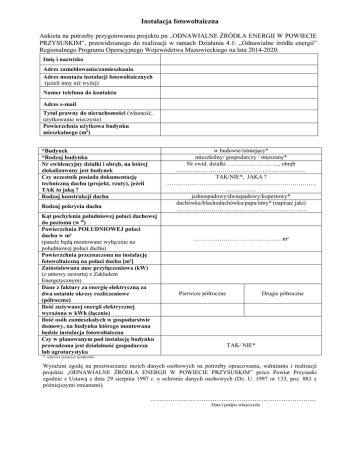 Instalacja fotowoltaiczna Ankieta na potrzeby przygotowania projektu pn „ODNAWIALNE ŹRÓDŁA ENERGII W POWIECIE PRZYSUSKIM”, przewidzianego do realizacji w ramach Działania 4.1: „Odnawialne źródła energii” Regionalnego Programu Operacyjnego Województwa Mazowieckiego na lata 2014-2020. Imię i nazwisko Adres zameldowania/zamieszkania Adres montażu instalacji fotowoltaicznych (jeżeli inny niż wyżej) Numer telefonu do kontaktu Adres e-mail Tytuł prawny do nieruchomości (własność, użytkowanie wieczyste) Powierzchnia użytkowa budynku mieszkalnego (m2) w budowie/istniejący* mieszkalny/ gospodarczy / mieszany* Nr ewid. działki ……..………………, obręb ………………………………………..……………… TAK/NIE*, JAKA ? ………………………………………………………………… …………… jednospadowy/dwuspadowy/kopertowy* dachówka/blachodachówka/papa/inny* (napisać jaki) ………………………….……….……………………. *Budynek *Rodzaj budynku Nr ewidencyjny działki i obręb, na której zlokalizowany jest budynek Czy uczestnik posiada dokumentację techniczną dachu (projekt, rzuty), jeżeli TAK to jaką ? Rodzaj konstrukcji dachu Rodzaj pokrycia dachu Kąt pochylenia południowej połaci dachowej do poziomu (w ⁰) Powierzchnia POŁUDNIOWEJ połaci dachu w m² (panele będą montowane wyłącznie na południowej połaci dachu) Powierzchnia przeznaczona na instalację fotowoltaiczną na połaci dachu [m²] Zainstalowana moc przyłączeniowa (kW) (z umowy zawartej z Zakładem Energetycznym) Dane z faktury za energię elektryczną za dwa ostatnie okresy rozliczeniowe (półroczne) Ilość zużywanej energii elektrycznej wyrażona w kWh (łącznie) Ilość osób zamieszkałych w gospodarstwie domowy, na budynku którego montowana będzie instalacja fotowoltaiczna Czy w planowanym pod instalację budynku prowadzona jest działalność gospodarcza lub agroturystyka …………………………………….. m² Pierwsze półroczne Drugie półroczne TAK/ NIE* *- właściwe zaznaczyć (podkreślić) Wyrażam zgodę na przetwarzanie moich danych osobowych na potrzeby opracowania, wdrażania i realizacji projektu „ODNAWIALNE ŹRÓDŁA ENERGII W POWIECIE PRZYSUSKIM” przez Powiat Przysuski zgodnie z Ustawą z dnia 29 sierpnia 1997 r. o ochronie danych osobowych (Dz. U. 1997 nr 133, poz. 883 z późniejszymi zmianami). .……………………………………………………………….. Data i podpis właściciela