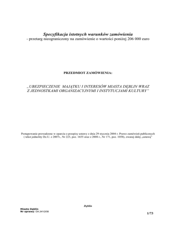 Specyfikacja istotnych warunków zamówienia - przetarg nieograniczony na zamówienie o wartości poniŜej 206 000 euro PRZEDMIOT ZAMÓWIENIA: „UBEZPIECZENIE MAJĄTKU I INTERESÓW MIASTA DĘBLIN WRAZ Z JEDNOSTKAMI ORGANIZACYJNYMI I INSTYTUCJAMI KULTURY” Postępowanie prowadzone w oparciu o przepisy ustawy z dnia 29 stycznia 2004 r. Prawo zamówień publicznych ( tekst jednolity Dz.U. z 2007r., Nr 223, poz. 1655 oraz z 2008 r., Nr 171, poz. 1058), zwanej dalej „ustawą” Dęblin Miasto Dęblin Nr sprawy: OA.341/2/08 1/73 DZIAŁ A. Informacje, o których mowa w art. 36 ust. 1 ustawy Prawo zamówień publicznych oraz opis części zamówienia I. Nazwa i adres zamawiającego Nazwa zamawiającego: Miasto Dęblin reprezentowane przez Burmistrza Miasta Dęblin Ulica: Rynek 12 Kod: 08-530 Miejscowość: Dęblin Strona: www.deblin.pl E-mail: [email protected] Godziny urzędowania: poniedziałek: 9-17, wtorek-piątek: 7.30-15.30 Telefon/fax: (081) 883 00 01 II. Tryb udzielenia zamówienia 1.Postępowanie o udzielenie zamówienia publicznego prowadzone jest w trybie przetargu nieograniczonego. 2.Podstawa prawna udzielenia zamówienia publicznego: art. 10 ust. 1 oraz art. 39-46 ustawy Prawo zamówień publicznych (tekst jednolity Dz.U. z 2007 Nr 223, poz. 1655 oraz z 2008 r., Nr 171, poz. 1058). 3.Podstawa prawna opracowania specyfikacji istotnych warunków zamówienia: 3.1.Ustawa z dnia 29 stycznia 2004 r. Prawo zamówień publicznych (tekst jednolity Dz.U. z 2007 r., Nr 223, poz. 1655 oraz z 2008 r., Nr 171, poz. 1058). 3.2.Rozporządzenie Prezesa Rady Ministrów z dnia 19 maja 2006 r. w sprawie rodzajów dokumentów, jakich moŜe Ŝądać zamawiający od wykonawcy oraz form, w jakich dokumenty te mogą być składane (Dz. U. z 2006 r., Nr 87, poz. 605 oraz z 2008r., Nr 188, poz.1155) III. Opis przedmiotu zamówienia 1. Część I: Przedmiotem zamówienia w części I jest ubezpieczenie majątku i odpowiedzialności cywilnej Miasta Dęblin wraz z jednostkami organizacyjnymi i instytucjami kultury. Zakres zamówienia obejmuje: • ubezpieczenie mienia od ognia i innych zdarzeń losowych • ubezpieczenie mienia od kradzieŜy z włamaniem i rabunku • ubezpieczenie sprzętu elektronicznego • ubezpieczenie przedmiotów szklanych od stłuczenia • ubezpieczenie odpowiedzialności cywilnej • ubezpieczeń komunikacyjnych (AC, OC, NNW, Assistance) • ubezpieczenie Następstw Nieszczęśliwych Wypadków (Warsztaty Terapii Zajęciowej) 2. Część II: Przedmiotem zamówienia w części II jest ubezpieczenie członków Ochotniczych StraŜy PoŜarnych Miasta Dęblin. Zakres zamówienia obejmuje ubezpieczenie następstw nieszczęśliwych wypadków. 3. Zamawiający nie dopuszcza powierzenia podwykonawcom wykonania zamówienia. 4. Szczegółowy opis przedmiotu zamówienia zawierają załączniki do niniejszej specyfikacji: Miasto Dęblin Nr sprawy: OA.341/2/08 2/73 Załącznik nr 1: „Szczegółowy opis przedmiotu zamówienia dotyczący części I zamówienia, zawierający warunki wymagane oraz klauzule dodatkowe i inne postanowienia szczególne preferowane dla poszczególnych rodzajów ubezpieczeń”, Załącznik nr 1a „Szczegółowy opis przedmiotu zamówienia dotyczący części II zamówienia, zawierający warunki wymagane dla ubezpieczenia NNW członków OSP”, Załącznik nr 5 „Warunki wymagane – definicje pojęć i wymagana treść klauzul dodatkowych” Załącznik nr 6 „Klauzule dodatkowe i inne postanowienia szczególne preferowane”, Załącznik nr 8 „Wykaz pojazdów”, Załącznik nr 9 „Wykaz zabezpieczeń przeciwkradzieŜowych, przeciwpoŜarowych i przepięciowych w jednostkach” Załącznik Nr 10 – „Szkodowość” 5. Oznaczenie wg Wspólnego Słownika Zamówień (CPV): 66515100-4 (usługi ubezpieczenia od ognia), 66515400-7 (usługi ubezpieczenia od skutków Ŝywiołów), 66515000-3 (usługi ubezpieczenia od uszkodzenia lub utraty), 66516400-4 (usługi ubezpieczenia od ogólnej odpowiedzialności cywilnej), 66516000-0 (usługi ubezpieczenia od odpowiedzialności cywilnej), 66516100-1 (usługi ubezpieczenia pojazdów mechanicznych od odpowiedzialności cywilnej), 66514110-0 (usługi ubezpieczeń pojazdów mechanicznych), 66512100-3 (usługi ubezpieczenia od następstw nieszczęśliwych wypadków). Wymienione usługi naleŜą do kategorii usług CPC nr 6. IV. Termin wykonania zamówienia 1. Termin wykonania zamówienia: 36 miesięcy począwszy od dnia 15.01.2009r., z moŜliwością: a) odstąpienia od umowy w trybie art. 145 ustawy Prawo zamówień publicznych z dnia 29 stycznia 2004 r. w terminie 30 dni od powzięcia wiadomości o zaistnieniu istotnej zmiany okoliczności powodującej, Ŝe wykonanie umowy nie leŜy w interesie publicznym, czego nie moŜna było przewidzieć w chwili zawarcia umowy, b) rozwiązania umowy z uzasadnionych przyczyn przez kaŜdą ze stron za wypowiedzeniem złoŜonym w formie pisemnej najpóźniej na 2 miesiące przed końcem kaŜdego rocznego okresu ubezpieczenia; wypowiedzenie złoŜone w powyŜszym terminie wywołuje skutek na koniec danego roku ubezpieczenia. 2. Polisy ubezpieczeniowe będą wystawiane na okres roczny, zgodny z terminem wykonania zamówienia, z wyjątkiem: • polis w pierwszym rocznym okresie dotyczących ubezpieczeń jeszcze aktualnych • polis dotyczących umów ubezpieczeń komunikacyjnych AUTO CASCO, Assistance, Zielona Karta i NNW kierowcy i pasaŜerów pojazdów włączanych w trakcie wykonania niniejszego zamówienia, które będą zawierane od dnia zgłoszenia do ubezpieczenia do końca kaŜdego rocznego okresu wykonywania zamówienia, tj. do dnia 14.01.2010 r., 14.01.2011 r. i/lub 14.01.2012 r. (wyrównanie okresu ubezpieczenia), • obowiązkowego ubezpieczenia OC posiadaczy pojazdów mechanicznych, o którym mowa w ust. 3 niniejszego rozdziału. 3. Polisy obowiązkowego ubezpieczenia OC posiadaczy pojazdów mechanicznych włączanych w trakcie wykonania niniejszego zamówienia będą wystawione na pe