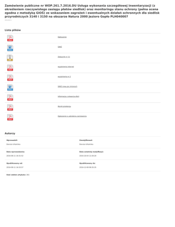 Zamówienie publiczne nr WOP.261.7.2016.DU Usługa wykonania szczegółowej inwentaryzacji (z określeniem rzeczywistego zasięgu płatów siedlisk) oraz monitoringu stanu ochrony (pełna ocena zgodna z metodyką GIOŚ) ze wskazaniem zagrożeń i ewentualnych działań ochronnych dla siedlisk przyrodniczych 3140 i 3150 na obszarze Natura 2000 Jezioro Gopło PLH040007 2016-08-11 Lista plików Ogłoszenie SIWZ Załącznik nr 11 wyjaśnienia internet wyjaśnienia nr 2 SIWZ nowy po zmianach Informacja z otwarcia ofert Wynik przetargu Ogłoszenie o udzieleniu zamówienia Autorzy Wprowadził: Zmodyfikował: Danuta Urbańska Danuta Urbańska Data wprowadzenia: Data ostatniej modyfikacji: 2016-08-11 16:31:52 2016-10-04 12:26:20 Opublikowany od: Opublikowany do: 2016-08-11 16:33:57 2016-12-08 08:35:35 Ilość odsłon artykułu: 261