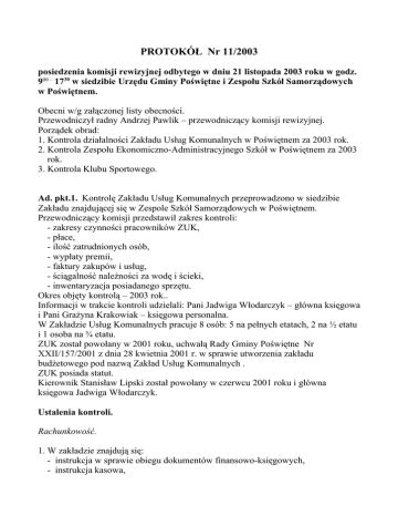 PROTOKÓŁ Nr 11/2003 posiedzenia komisji rewizyjnej odbytego w dniu 21 listopada 2003 roku w godz. 900 – 1730 w siedzibie Urzędu Gminy Poświętne i Zespołu Szkół Samorządowych w Poświętnem. Obecni w/g załączonej listy obecności. Przewodniczył radny Andrzej Pawlik – przewodniczący komisji rewizyjnej. Porządek obrad: 1. Kontrola działalności Zakładu Usług Komunalnych w Poświętnem za 2003 rok. 2. Kontrola Zespołu Ekonomiczno-Administracyjnego Szkół w Poświętnem za 2003 rok. 3. Kontrola Klubu Sportowego. Ad. pkt.1. Kontrolę Zakładu Usług Komunalnych przeprowadzono w siedzibie Zakładu znajdującej się w Zespole Szkół Samorządowych w Poświętnem. Przewodniczący komisji przedstawił zakres kontroli: - zakresy czynności pracowników ZUK, - płace, - ilość zatrudnionych osób, - wypłaty premii, - faktury zakupów i usług, - ściągalność należności za wodę i ścieki, - inwentaryzacja posiadanego sprzętu. Okres objęty kontrolą – 2003 rok.. Informacji w trakcie kontroli udzielali: Pani Jadwiga Włodarczyk – główna księgowa i Pani Grażyna Krakowiak – księgowa personalna. W Zakładzie Usług Komunalnych pracuje 8 osób: 5 na pełnych etatach, 2 na ½ etatu i 1 osoba na ¾ etatu. ZUK został powołany w 2001 roku, uchwałą Rady Gminy Poświętne Nr XXII/157/2001 z dnia 28 kwietnia 2001 r. w sprawie utworzenia zakładu budżetowego pod nazwą Zakład Usług Komunalnych . ZUK posiada statut. Kierownik Stanisław Lipski został powołany w czerwcu 2001 roku i główna księgowa Jadwiga Włodarczyk. Ustalenia kontroli. Rachunkowość. 1. W zakładzie znajdują się: - instrukcja w sprawie obiegu dokumentów finansowo-księgowych, - instrukcja kasowa, 2 - zarządzenie w sprawie zakładowego planu kont, ZUK nie posiada komputera i programów komputerowych. 2. W zakładzie prowadzone są następujące księgi rachunkowe: - księga główna, - księgi pomocnicze: księga inwentarzowa, wykaz środków trwałych, kartoteki. Przy prowadzeniu ksiąg rachunkowych jest przestrzegany obowiązek: -otwierania ksiąg rachunkowych na początek każdego roku, -zamykania ksiąg rachunkowych na koniec każdego roku, -oznaczenia ksiąg rachunkowych nazwą zakładu budżetowego , zrozumiałą nazwą danego rodzaju ksiąg, rokiem, którego księgi dotyczą. W księgach zapisy prowadzone są z zachowaniem chronologii, numerowanie zapisów, liczenie w sposób ciągły sumy zapisów (obrotów) oraz zachowanie porządku systematycznego i chronologicznego. Sprawozdawczość. Zakład budżetowy sporządza sprawozdania kwartalne, półroczne i roczne, terminowo, zgodnie z przepisami GUS i Urzędu Skarbowego. Zakład przekazuje sprawozdania do Skarbnika Gminy. Skarbnik nie potwierdza odbioru sprawozdań. Zalecenie: potwierdzać doręczenie sprawozdań do Skarbnika Gminy. Rozrachunki i roszczenia. 1. Otrzymywane faktury są księgowane na kontach. Fakt zapłaty faktury nie jest odnotowany na odwrotnej stronie. Nie ma opisów faktur odnośnie celowości i przeznaczenia zakupu. Główna księgowa udzieliła informacji, że faktury dotyczące energii elektrycznej i rozmów telefonicznych są regulowane w terminie. 2.Jeśli chodzi o zobowiązania i zaległości od ludności, to najwięcej zadłużeń w stosunku do ZUK-u posiada Pan Michta, były lokator w budynku weterynarii. U rolników zadłużenia na koniec października wynoszą 2340,30 zł. Dłużnicy mają naliczone odsetki za nieterminowe płacenie. Z opłatą zalega też Szpital w Opocznie, ale należności ich wpływają z opóźnieniem. Wysłano do wszystkich dłużników wezwania. Na dzień 21.11.03 ZUK wysłał 7 wezwań do zapłaty na ogólną kwotę 930 zł. Od zobowiązań niepłaconych w terminie naliczane są ustawowe odsetki. W jednym przypadku wystąpiono na drogę sądową ze stosunków cywilnoprawnych w sprawie zaległości z tyt. najmu lokalu mieszkalnego, stanowiącego własność Gminy, będącego w zarządzie ZUK-u, w stosunku do Państwa A.i W. Michtów. Główna księgowa przedstawiła do wglądu Komisji sądowy nakaz zapłaty z dnia 31 października 2003 r. z Sądu Rejonowego w Opocznie, na kwotę 2861,11 zł plus koszty procesu 57,30 zł, z wysłaniem klauzuli wykonalności nakazu zapłaty, po 3 której uprawomocnieniu nastąpi egzekucja finansowa zapłaty. W stosunku do drugiego lokatora P. D. Łukasika, na zaległość składa się kwota za trzymiesięczny czynsz, w wysokości 789 zł i w najbliższym czasie ZUK wyśle wezwanie do zapłaty należności z odsetkami. Najemcy mają zawartą umowę na czas nieokreślony. Innych przypadków zadłużenia nie stwierdzono. 3.Rachunki za telefon są w granicach 100 zł miesięcznie. ZUK nie prowadzi kontrolki rozmów telefonicznych. 4.Raporty kasowe są spisywane co 10 dni, zgodnie z instrukcją kasową. Stwierdzono, że w ZUK-u znajduje się szafa pancerna, z wbudowanym sejfem. Pomieszczenie kasowe nie jest wydzielone. W tym samym pomieszczeniu pracuje główna księgowa i księgowa personalna. Nadmiar gotówki, powyżej 500 zł odprowadzany jest do banku. W okresie od 1 stycznia do 31 października 2003 r. nie były wypłacane zaliczki. 5.Stwierdzono, że pieczątki przechowywane są w biurku w szufladzie. W szafie pancernej znajduje się komputer do wody, pieniądze, czek. Raporty kasowe sporządza główna księgowa, księguje je i dekretuje. Główna księgowa przedstawiła plan finansowy na 2003 rok z korektą w poszczególnych paragrafach. Ogólna kwota dotacji z Urzędu Gminy nie uległa zmianie. Materiały biurowe kupują księgowe ZUK-u. 6.Zakład otrzymał dotację przedmiotową z Urzędu Gminy w wysokości 59.000 zł, na 121.000 zł planowanej. O zmiany w planie księgowym występuje główna księgowa w porozumieniu z kierownikiem ZUK. Skontrolowano faktury, które były podstawą wydatków w październiku 2003 r. Na fakturach stwierdzono brak pieczęci o treści: 1/ sprawdzono pod względem merytorycznym, 2/ sprawdzono pod względem formal