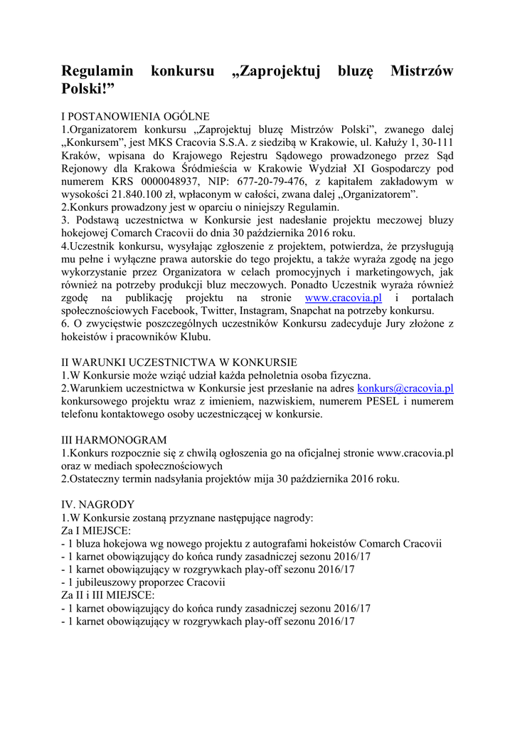 Regulamin Polski!” konkursu „Zaprojektuj bluzę Mistrzów I POSTANOWIENIA OGÓLNE 1.Organizatorem konkursu „Zaprojektuj bluzę Mistrzów Polski”, zwanego dalej „Konkursem”, jest MKS Cracovia S.S.A. z siedzibą w Krakowie, ul. Kałuży 1, 30-111 Kraków, wpisana do Krajowego Rejestru Sądowego prowadzonego przez Sąd Rejonowy dla Krakowa Śródmieścia w Krakowie Wydział XI Gospodarczy pod numerem KRS 0000048937, NIP: 677-20-79-476, z kapitałem zakładowym w wysokości 21.840.100 zł, wpłaconym w całości, zwana dalej „Organizatorem”. 2.Konkurs prowadzony jest w oparciu o niniejszy Regulamin. 3. Podstawą uczestnictwa w Konkursie jest nadesłanie projektu meczowej bluzy hokejowej Comarch Cracovii do dnia 30 października 2016 roku. 4.Uczestnik konkursu, wysyłając zgłoszenie z projektem, potwierdza, że przysługują mu pełne i wyłączne prawa autorskie do tego projektu, a także wyraża zgodę na jego wykorzystanie przez Organizatora w celach promocyjnych i marketingowych, jak również na potrzeby produkcji bluz meczowych. Ponadto Uczestnik wyraża również zgodę na publikację projektu na stronie www.cracovia.pl i portalach społecznościowych Facebook, Twitter, Instagram, Snapchat na potrzeby konkursu. 6. O zwycięstwie poszczególnych uczestników Konkursu zadecyduje Jury złożone z hokeistów i pracowników Klubu. II WARUNKI UCZESTNICTWA W KONKURSIE 1.W Konkursie może wziąć udział każda pełnoletnia osoba fizyczna. 2.Warunkiem uczestnictwa w Konkursie jest przesłanie na adres [email protected] konkursowego projektu wraz z imieniem, nazwiskiem, numerem PESEL i numerem telefonu kontaktowego osoby uczestniczącej w konkursie. III HARMONOGRAM 1.Konkurs rozpocznie się z chwilą ogłoszenia go na oficjalnej stronie www.cracovia.pl oraz w mediach społecznościowych 2.Ostateczny termin nadsyłania projektów mija 30 października 2016 roku. IV. NAGRODY 1.W Konkursie zostaną przyznane następujące nagrody: Za I MIEJSCE: - 1 bluza hokejowa wg nowego projektu z autografami hokeistów Comarch Cracovii - 1 karnet obowiązujący do końca rundy zasadniczej sezonu 2016/17 - 1 karnet obowiązujący w rozgrywkach play-off sezonu 2016/17 - 1 jubileuszowy proporzec Cracovii Za II i III MIEJSCE: - 1 karnet obowiązujący do końca rundy zasadniczej sezonu 2016/17 - 1 karnet obowiązujący w rozgrywkach play-off sezonu 2016/17 3.Nagrody rzeczowe nie podlegają wymianie na ekwiwalent pieniężny. 4.Wartość nagrody nie przekracza kwoty, która zgodnie z przepisami o podatku dochodowym od osób fizycznych zobowiązałyby laureata Konkursu do zapłaty zryczałtowanego podatku dochodowego od osób fizycznych od wygranej w Konkursie. 5.Lista laureatów Konkursu, którzy otrzymają nagrody zostanie opublikowana na stronie internetowej www.cracovia.pl oraz na oficjalnym koncie na portalu społecznościowym Facebook. Organizator skontaktuje się ze zwycięzcami drogą mailową. Uczestnik konkursu wyraża zgodą na publikację informacji o tym, iż został on laureatem konkursu. 6.Nagrody zostaną przekazane laureatom osobiście, jednocześnie laureat swoją obecnością przy odbiorze nagrody potwierdzi autentyczność wysłanego na potrzeby Konkursu projektu. 7. Laureaci konkursu będą zobowiązani do zawarcia z Organizatorem umowy dotyczącej przeniesienia autorskich praw majątkowych do przesłanego projektu bluzy meczowej. V. PRZETWARZANIE DANYCH OSOBOWYCH 1. Przetwarzanie danych osobowych uczestników Konkursu odbywać się będzie stosownie do przepisów o ochronie danych osobowych. 2. Administratorem danych osobowych jest Organizator. 3. Osobom udostępniającym swoje dane osobowe przysługuje prawo wglądu do tych danych oraz ich poprawienia. 4. Dane personalne uczestników nie będą podane do wiadomości publicznej w trakcie trwania Konkursu, chyba że uczestnik zadecyduje inaczej. VI. POSTANOWIENIA KOŃCOWE 1.Regulamin niniejszego Konkursu jest dostępny na stronie internetowej www.cracovia.pl Organizator może w każdym czasie dokonać zmiany Regulaminu. Zmiana będzie wiązała uczestników konkursu, jeśli nie sprzeciwią się oni treści wprowadzonej zmiany. 2. Dokonanie zgłoszenia konkursowego oznacza wyrażenie zgody na przystąpienie do Konkursu i poddanie się wymaganiom niniejszego Regulaminu. 3.Organizator zastrzega sobie prawo do nie publikacji wybranych projektów.