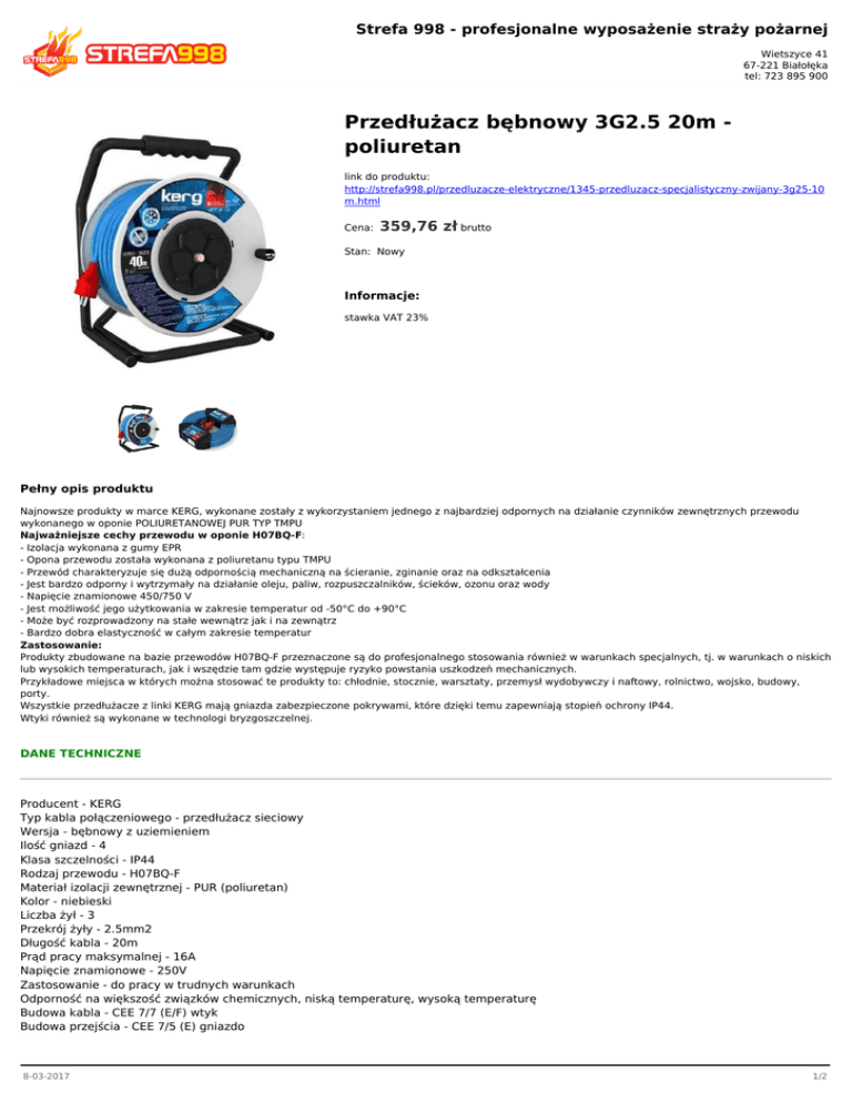 Strefa 998 - profesjonalne wyposażenie straży pożarnej Wietszyce 41 67-221 Białołęka tel: 723 895 900 Przedłużacz bębnowy 3G2.5 20m poliuretan link do produktu: http://strefa998.pl/przedluzacze-elektryczne/1345-przedluzacz-specjalistyczny-zwijany-3g25-10 m.html Cena: 359,76 zł brutto Stan: Nowy Informacje: stawka VAT 23% Pełny opis produktu Najnowsze produkty w marce KERG, wykonane zostały z wykorzystaniem jednego z najbardziej odpornych na działanie czynników zewnętrznych przewodu wykonanego w oponie POLIURETANOWEJ PUR TYP TMPU Najważniejsze cechy przewodu w oponie H07BQ-F: - Izolacja wykonana z gumy EPR - Opona przewodu została wykonana z poliuretanu typu TMPU - Przewód charakteryzuje się dużą odpornością mechaniczną na ścieranie, zginanie oraz na odkształcenia - Jest bardzo odporny i wytrzymały na działanie oleju, paliw, rozpuszczalników, ścieków, ozonu oraz wody - Napięcie znamionowe 450/750 V - Jest możliwość jego użytkowania w zakresie temperatur od -50°C do +90°C - Może być rozprowadzony na stałe wewnątrz jak i na zewnątrz - Bardzo dobra elastyczność w całym zakresie temperatur Zastosowanie: Produkty zbudowane na bazie przewodów H07BQ-F przeznaczone są do profesjonalnego stosowania również w warunkach specjalnych, tj. w warunkach o niskich lub wysokich temperaturach, jak i wszędzie tam gdzie występuje ryzyko powstania uszkodzeń mechanicznych. Przykładowe miejsca w których można stosować te produkty to: chłodnie, stocznie, warsztaty, przemysł wydobywczy i naftowy, rolnictwo, wojsko, budowy, porty. Wszystkie przedłużacze z linki KERG mają gniazda zabezpieczone pokrywami, które dzięki temu zapewniają stopień ochrony IP44. Wtyki również są wykonane w technologi bryzgoszczelnej. DANE TECHNICZNE Producent - KERG Typ kabla połączeniowego - przedłużacz sieciowy Wersja - bębnowy z uziemieniem Ilość gniazd - 4 Klasa szczelności - IP44 Rodzaj przewodu - H07BQ-F Materiał izolacji zewnętrznej - PUR (poliuretan) Kolor - niebieski Liczba żył - 3 Przekrój żyły - 2.5mm2 Długość kabla - 20m Prąd pracy maksymalnej - 16A Napięcie znamionowe - 250V Zastosowanie - do pracy w trudnych warunkach Odporność na większość związków chemicznych, niską temperaturę, wysoką temperaturę Budowa kabla - CEE 7/7 (E/F) wtyk Budowa przejścia - CEE 7/5 (E) gniazdo 8-03-2017 1/2 Bezpiecznik termiczny resetowalny Bęben metalowy 8-03-2017 2/2