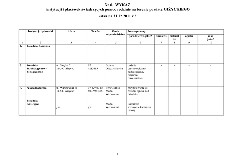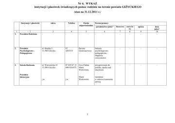 Nr 6. WYKAZ instytucji i placówek świadczących pomoc rodzinie na terenie powiatu GIŻYCKIEGO /stan na 31.12.2011 r./ Instytucje i placówki L Adres Telefon . p 1 1. 2 Poradnia Rodzinna 2. 3. 3 Osoba Forma pomocy odpowiedzialna poradnictwo-jakie? 4 5 6 finansowa material na opieka 7 - 8 - 9 - inna jaka? 10 - - - - - Poradnia Psychologiczno – Pedagogiczna ul. Smętka 5 11-500 Giżycko 87 4283315 Bożena Giedziusiewicz badania psychologicznopedagogiczne, diagnoza, orzecznictwo - - - - Szkoła Rodzenia ul. Warszawska 41 11-500 Giżycko 07 429 67 15 600-924-875 Ewa Chabas Marta Werkowska przygotowanie do porodu, opieka nad dzieckiem - - - - j.w. j.w. Marta Werkowska instruktaż w zakresie karmienia piersią Poradnia laktacyjna 1 4. Oddział "Caritas " Parafia Św. Brunona, ul. Pionierska 14 11-500 Giżycko Centrum Charytatywne im. Jana Pawła II „Otwórzcie drzwi Chrystusowi” Ul. Wodociągowa 23 11-500 Giżycko 5. Dom Samotnej Matki 6. Ośrodek Adopcyjno – Opiekuńczy ul. Smętka 5 11-500 Giżycko Barbara Jasińska paczki żywnościowe Jolanta Kamińska j.w - - - 87 4283557 87 4286289 87 4284920 - - Eliza Szwed konsultacyjno diagnostyczne - - - - - - - (od 1.12.2012 r. nie działa) 7. Ośrodek Interwencji Kryzysowej ul. Staszica 13 11-500 Giżycko Dom Św. Faustyny Caritas Diecezji Ełckiej hostel dla osoby z dzieckiem /dziećmi dotkniętymi przemocą w rodzinie 87 4285497 Barbara Nowosielska – pracownik socjalny prawne, psychologiczne, praca socjalna 8. Ośrodek Wsparcia Środowiskowy Dom Samopomocy Ul. Warszawska 31 11-500 Giżycko 87 4281257 Małgorzata Dziawer wsparcie dla osób z zaburzeniami psychicznymi Środowiskowy Dom Samopomocy Ul. Konrada Wallenroda 4 87 4218086 11-520 Ryn Gabriela Leciewicz 2 wsparcie dla osób z zaburzeniami psychicznymi - - - - - schronienie opieka medyczna, wyżywienie - hostel opieka medyczna, wyżywienie - opieka medyczna, wyżywienie 9. Poradnie Uzależnień: - Dotyczące Alkoholu GOPS 11-510 Wydminy Grupa Terapeutyczna dla osób uzależnionych ul. Sikorskiego 3B 11-500 Giżycko od alkoholu Punkt konsultacyjno informacyjny - dotyczący Przemocy w rodzinie Smętka 5 11-500 Giżycko 87 4210115 87 428 51 63 87 4291089 Mirosława Romatowska Pomoc prawna – Piotr Trejnis Pomoc psychologiczna Czesław Biłat Grupy wsparcia – Czesław Zapaśnik dotyczące uzależnienia i współuzależnienia, pomoc osobom doświadczającym przemocy w rodzinie, dzieciom i młodzieży używających substancji psychoaktywnych zajęcia terapeutyczne (Jerzy Zakrzewski) - „ dla rodzin osób uzależnionych od alkoholu Zbigniew Piestrzyński dotyczące uzależnienia i współuzależnienia, pomoc osobom doświadczającym przemocy w rodzinie, Zbigniew Piestrzyński dotyczące uzależnienia i współuzależnienia, pomoc osobom doświadczającym przemocy w rodzinie konsultacje psychologiczne, prawne zajęcia terapeutyczne 10. Punkt konsultacyjno informacyjny Smętka 5 11-500 Giżycko 3 konsultacje psychologiczne, prawne zajęcia terapeutyczne 11. 12. dotyczący Narkotyków - - dotyczący innych uzależnień NZOZ Ul. Smętka 5 11-500 Giżycko 87 4299936 - Gizela Świętojańska - 4 dla osób uzależnionych od narkotyków i alkoholu konsultacje psychologiczne zajęcia terapeutyczne - - 13. Młodzieżowy Dom Kultury GCK ul. Konarskiego 8 11-500 Giżycko fax 874281637 874284326 RCK ul. Sawickiej 1 11-520 Ryn 4218061 GOK ul. 22 Lipca 11 11-612 Kruklanki GOK ul. Olsztyńska 54 Wilkasy 11-500 Giżycko GOK ul. 40-lecia 4 11-510 Wydminy GOK Szkolna 1b Miłki 11-513 87 4217301 87 4280416 87 4210142 87 4211156 Dorota Łabuz praca z dziećmi i młodzieżą organizacja czasu wolnego, wystawy kulturalnooświatowe zajęcia teatralne, plastyczne, taneczne, fotograficzne, muzyczne, szachowe Marek Podskalny j.w. koło taneczne, plastyczne, teatralne, muzyczne, taneczne Sławomir Zieliński imprezy plenerowe Bożena Oleksiak praca z dziećmi i młodzieżą Alina Skirucha, Łopczyńska, Dąbrowska, Koleśnik, Augustynowicz Dariusz Skrzypek 5 j.w. j.w. imprezy plenerowe, organizacja wolnego czasu nauka gry na gitarze, zajęcia terapeutyczne, plastyka , ceramika, koło teatralne, taneczne, muzyczne, dziennikarskie rzeźbiarstwo, kółko teatralne, plastyczne, taneczne, sportowe, komputerowe, poetyckie kółko tańca współczesnego, nauka gry na pianinie, teatrzyk, plastyczne, muzyczne 14. 15. Oratorium dla dzieci i młodzieży przy parafiach Klub młodzieżowy - Sikorskiego 3B 11-500 Giżycko /MKIS/ - 87 429 13 36 87 428 22 57 - - Joanna Dycha Elżbieta Lisiczyńska 6 praca z młodzieżą (zajęcia sportowe, plastyczne, muzyczne, fotograficzne, warsztaty z psychologii społecznej) - - - - - - zajęcia sportowe, plastyczne, muzyczne, fotograficzne, warsztaty z psychologii społecznej 16. Uczniowski Klub Sportowy UKS "Start" ul. 22 Lipca 34 11-612 Kruklanki 87 4217025 praca z dziećmi i młodzieżą, organizacja czasu wolnego Jacenty Makałus - - UKS PROMIEŃ przy LO ul. Grunwaldzka 94 11-510 Wydminy 87 4210028 UKS ORŁY przy SP w Gawlikach Wielkich 11-510 Wydminy 87 4212058 UKS Tenisa Stołowego przy ZS Kształtowania Środowiska i Agrobiznesu Ul. I Dywizji im. T. Kościuszki 23 11-500 Giżycko Ludowy Klub Sportowy przy ZS Kształtowania Środowiska i Agrobiznesu Ul. I Dywizji im. T. Kościuszki 23 11-500 Giżycko Jarosław Binik Ewa Idek - - formy sportu piłka nożna ręczna tenis stołowy piłka nożna i ręczna, tenis stołowy j. w. - - - - - - j. w. tenis stołowy 87 4282484 Andrzej Arian j. w. 87 4282484 Sylwester Choiński j.w - - - 87 4282538 Trochim Piotr j. w. - - - piłka ręczna, siatkówka, koszykówka piłka ręczna UKS „Dwójka” przy Gimnazjum Nr 2 Ul. Warszawska 39 11-500 Giżycko UKS „Wilanów” przy SP Nr 3 Ul. Wiejska 50 11-500 Giżycko 87 4282135 87 4285697 Alicja Tymaszewska Uczniowski Klub Żeglarstwa Regatowego „Niegocin” Ul. Nadbrzeżna 15 11-500 Giżycko j. w. - - - piłka nożna i ręczna Organizacja imprez j. w. - - - Formy sportu, Piłka nożna, ręczna Romu