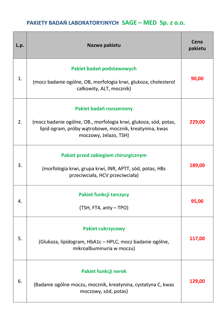 PAKIETY BADAŃ LABORATORYJNYCH SAGE – MED Sp. z o.o. L.p. Nazwa pakietu Cena pakietu Pakiet badań podstawowych 1. (mocz badanie ogólne, OB, morfologia krwi, glukoza, cholesterol całkowity, ALT, mocznik) 90,00 Pakiet badań rozszerzony 2. (mocz badanie ogólne, OB., morfologia krwi, glukoza, sód, potas, lipid ogram, próby wątrobowe, mocznik, kreatynina, kwas moczowy, żelazo, TSH) 229,00 Pakiet przed zabiegiem chirurgicznym 3. (morfologia krwi, grupa krwi, INR, APTT, sód, potas, HBs przeciwciała, HCV przeciwciała) 189,00 Pakiet funkcji tarczycy 4. 95,00 (TSH, FT4, anty – TPO) Pakiet cukrzycowy 5. (Glukoza, lipidogram, HbA1c – HPLC, mocz badanie ogólne, mikroalbuminuria w moczu) 117,00 Pakiet funkcji nerek 6. (Badanie ogólne moczu, mocznik, kreatynina, cystatyna C, kwas moczowy, sód, potas) 129,00 Pakiet anemii 7. (OB., morfologia krwi, żelazo, ferrytyna, transferryna, witamina B12, kwas foliowy) 195,00 Pakiet metabolizmu kostnego 8. (fosfataza zasadowa, wapń całkowity, fosfor nieograniczony, parathormon, kalcytonina, osteokalcyna, fosfataza kwaśna) 233,00 Pakiet hormonalny dla kobiet 9. 190,00 (TSH, FSH, LH, Estradiol, Progesteron, Prolaktyna) Pakiet reumatologiczny 10. (OB., morfologia krwi, kwas moczowy, proteinogram, CRP, ASO – ilościowo, RF- ilościowo, anty-CCP, Borelioza IgG, Borelioza IgM, PPJ test przesiewowy (ANA1) met. IIF) 407,00 Pakiet studencki 11. (grupa krwi, morfologia krwi, OB., mocz- badanie ogólne, TSH, sód, potas, lipidogram, Witamina B12, żelazo, bilirubina całkowita, HIV, WR, antygen HBs) 323,00 Pakiet młodej kobiety (podstawowy) 12. 13. (grupa krwi, morfologia krwi, CRP, TSH, mocz badanie ogólne, elektrolity, glukoza, prolaktyna, wapń całkowity, lipidogram) Pakiet młodej kobiety (podstawowy) + dodatkowo pakiet ginekologiczny (grupa krwi, morfologia krwi, CRP, TSH, mocz badanie ogólne, elektrolity, glukoza, prolaktyna, wapń całkowity, lipidogram, czystość pochwy, cytologia ginekologiczna) 208,00 278,00 Pakiet młodej kobiety (rozszerzony) 14. (grupa krwi, morfologia krwi, CRP, TSH, FT3, FT4, mocz badanie ogólne, sód, potas, wapń całkowity, fosfor nieograniczony, glukoza, prolaktyna, lipidogram, próby wątrobowe, mocznik, kreatynina, kwas foliowy, witamina B12, INR, APTT, fibrynogen, ferrytyna, HIV, WR) 560,00 Pakiet młodej kobiety (rozszerzony) + dodatkowo pakiet ginekologiczny 15. (grupa krwi, morfologia krwi, CRP, TSH, FT3, FT4, mocz badanie ogólne, sód, potas, wapń całkowity, fosfor nieograniczony, glukoza, prolaktyna, lipidogram, próby wątrobowe, mocznik, kreatynina, kwas foliowy, witamina B12, INR, APTT, fibrynogen, ferrytyna, HIV, WR, cytologia ginekologiczna, czystość pochwy) 630,00 Pakiet dla kobiet planujących poczęcie dziecka z grupą krwi 16. (grupa krwi, morfologia, OB., mocz - badanie ogólne, glukoza, sód, potas, lipidogram, próby wątrobowe, mocznik, żelazo, wapń całkowity, fosfor nieorganiczny, magnez. Prolaktyna, antygen HBs, HCV przeciwciała, Toxo IgG, Różyczka IgG, Chlamydia trachomatis IgG, CMV IgG, CMV IgM, przeciwciała antykardiolipinowe IgG i IgM, INR, APTT, fibrynogen, TSH, FT3, FT4, HIV, WR) 815,00 Pakiet dla kobiet planujących poczęcie dziecka bez grupy krwi 17. morfologia, OB., mocz –badanie ogólne, glukoza, sód, potas, lipidogram, próby wątrobowe, mocznik, żelazo, wapń całkowity, fosfor nieorganiczny, magnez. Prolaktyna, antygen HBs, HCV przeciwciała, Toxo IgG, Różyczka IgG, Chlamydia trachomatis IgG, CMV IgG, CMV IgM, przeciwciała antykardiolipinowe IgG i IgM, INR, APTT, fibrynogen, TSH, FT3, FT4, HIV, WR) 780,00 Pakiet dla kobiet w ciąży podstawowy z grupą krwi (pakiet zawiera wszystkie obowiązujące badania przez cały okres ciąży) 18. (grupa krwi, przeciwciała odpornościowe, morfologia x 5, badanie ogólne moczu x 7, glukoza, test obciążenia glukozą 3 pkt. 75g, WR x 2, HIV x 2, HCV x 2, Toxo IgG, Toxo IgM x 2, Różyczka IgG, Różczyka IgM, CMV IgG, CMV IgM, antygen HBs, posiew w kierunku GBS (pochwa i odbyt), czystość pochwy x 3, cytologia ginekologiczna, przeciwciała anty-Rh u kobiet z Rh(-), TSH, FT3, FT4) 1024,00 + 30,00 (przy Rh-) Pakiet dla kobiet w ciąży podstawowy bez grupy krwi (pakiet zawiera wszystkie obowiązujące badania przez cały okres ciąży) 19. (przeciwciała odpornościowe, morfologia x 5, badanie ogólne moczu x7, glukoza, test obciążenia glukoza 3 pkt. 75g, WR x 2, HIV x 2, HCV x 2, Toxo IgG, Toxo IgM x 2, Różyczka IgG, Różczyka IgM, CMV IgG, CMV IgM, antygen HBs, posiew w kierunku GBS (pochwa i odbyt), czystość pochwy x 3, cytologia ginekologiczna, TSH, FT3, FT4) 989,00 Pakiet dla kobiety w ciąży rozszerzony z grupą krwi (pakiet zawiera wszystkie obowiązujące badania przez cały okres ciąży) 20. (grupa krwi , przeciwciała odpornościowe, morfologia x 5, badanie ogólne moczu x 7, gukoza, test obciążenia glukozą 3 pkt 75g, WR x2, HIV x2, HCV x2, Toxo IgG, Toxo IgM, Różyczka IgG, Różyczka IgM, CMV IgG x1, CMV IgM x 2, antygen HBs, posiew w kierunku GBS (pochwa, odbyt), czystość pochwy x 3, cytologia ginekologiczna, sód, potas, lipidogram, próby wątrobowe, kreatynina, mocznik, żelazo, wapń całkowity, fosfor nieorganiczny, magnez, prolaktyna, TSH, FT3, FT4, INR, APTT, fibrynogen, beta HCG, Chlamydia trachomatis IgG i IgM) 1480,00 + 30,00 (przy Rh-) Pakiet dla kobiety w ciąży rozszerzony bez grupy krwi (pakiet zawiera wszystkie obowiązujące badania przez cały okres ciąży) 21. (przeciwciała odpornościowe, morfologia x 5, badanie ogólne moczu x 7, gukoza, test obciążenia glukozą 3 pkt 75g, WR x2, HIV x2, HCV x2, Toxo IgG, Toxo IgM, Różyczka IgG, Różyczka IgM, CMV IgG x 1, CMV IgM x 2, antygen HBs, posiew w kierunku GBS (pochwa, odbyt), czystość pochwy x 3, cytologia ginekologiczna, sód, potas, lipidogram, próby wątrobowe, kreatynina, mocznik, żelazo, wapń całkowity, fosfor nieorganiczny, magnez, prolaktyna, TSH, FT3, FT4, INR, APTT, fibrynogen, beta HCG, Chlamydia trac
