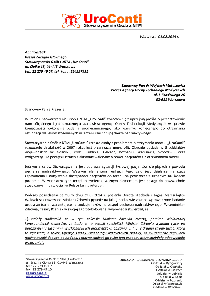 Warszawa, 01.08.2014 r. Anna Sarbak Prezes Zarządu Głównego Stowarzyszenia Osób z NTM „UroConti” ul. Ciołka 13, 01-445 Warszawa tel.: 22 279 49 07, tel. kom.: 884997931 Szanowny Pan dr Wojciech Matusewicz Prezes Agencji Oceny Technologii Medycznych ul. I. Krasickiego 26 02-611 Warszawa Szanowny Panie Prezesie, W imieniu Stowarzyszenia Osób z NTM „UroConti” zwracam się z uprzejmą prośbą o przedstawienie nam oficjalnego i jednoznacznego stanowiska Agencji Oceny Technologii Medycznych w sprawie konieczności wykonania badania urodynamicznego, jako warunku koniecznego do otrzymania refundacji dla leków stosowanych w leczeniu zespołu pęcherza nadreaktywnego. Stowarzyszenie Osób z NTM „UroConti” zrzesza osoby z problemem nietrzymania moczu. „UroConti” rozpoczęło działalność w 2007 roku, jest organizacją non-profit. Obecnie posiadamy 8 oddziałów wojewódzkich w: Gdańsku, Łodzi, Lublinie, Kielcach, Poznaniu, Warszawie, Wrocławiu oraz Bydgoszczy. Od początku istnienia aktywnie walczymy o prawa pacjentów z nietrzymaniem moczu. Jednym z celów Stowarzyszenia jest poprawa sytuacji życiowej pacjentów cierpiących z powodu pęcherza nadreaktywnego. Ważnym elementem realizacji tego celu jest działanie na rzecz zapewnienia i zwiększenia dostępności pacjentów do terapii na powszechnie uznanym na świecie poziomie. W wachlarzu tych terapii niezmiernie ważnym elementem jest dostęp do powszechnie stosowanych na świecie i w Polsce farmakoterapii. Podczas posiedzenia Sejmu w dniu 29.05.2014 r. posłanki Dorota Niedziela i Jagna MarczułajtisWalczak skierowały do Ministra Zdrowia pytanie na jakiej podstawie zostało wprowadzone badanie urodynamiczne, warunkujące refundacje leków na zespół pęcherza nadreaktywnego. Wiceminister Zdrowia, Cezary Rzemek w swojej zaprotokołowanej wypowiedzi stwierdził, że: „(…)należy podkreślić, że w tym zakresie Minister Zdrowia zresztą, pomimo wieloletniej korespondencji stwierdza, że badanie to ocenili specjaliści. Minister Zdrowia wykonał tylko po porozumieniu się z nimi, wysłuchaniu ich argumentów, opisaniu …. (….) Z drugiej strony firma, która to zgłaszała, a także Agencja Oceny Technologii Medycznych oceniły, że skuteczność tego leku można ocenić dopiero po badaniu i można zapisać go tylko tym osobom, które spełniają odpowiednie wskazania”. Stowarzyszenie Osób z NTM „UroConti” ul. Erazma Ciołka 13, 01-445 Warszawa tel.: 22 279 49 07 fax: 22 279 49 10 [email protected] www.uroconti.pl ODDZIAŁY REGIONALNE STOWARZYSZENIA Oddział w Bydgoszczy Oddział w Gdańsku Oddział w Kielcach Oddział w Lublinie Oddział w Łodzi Oddział w Poznaniu Oddział w Warszawie Oddział w Wrocławiu Tymczasem w oświadczeniu jakie przesłali Państwo redakcji Rzeczpospolitej (Rzeczpospolita, dodatek Zdrowie, 23.06.2014 r.) po debacie ekspertów nt. pacjentów cierpiących na zespół pęcherza nadreaktywnego czytamy, że „Agencja Oceny Technologii Medycznych nie oceniała świadczenia, jakim jest badanie urodynamiczne. Jednocześnie w maju 2013 r. Rada Przejrzystości pozytywnie zaopiniowała objęcie refundacją leczenia pęcherza neurogennego występującego między innymi w przebiegu urazów kręgosłupa i choroby Parkinsona produktami leczniczymi, które obecnie refundowane są we wskazaniu: zespół pęcherza nadreaktywnego potwierdzony badaniem urodynamicznym.” Nasze Stowarzyszenie od lat stara się wyjaśnić dlaczego i ewentualnie na czyj wniosek badanie urodynamiczne zostało wpisane jako obowiązkowe przed zapisaniem pacjentowi leku stosowanego w pęcherzu nadreaktywnym. W lutym 2012 r. eksperci w liście otwartym do Ministra Zdrowia jednoznacznie stwierdzili, że: „badanie urodynamiczne nie jest ani konieczne ani wskazane, aby zdiagnozować pęcherz nadreaktywny, a ponadto badanie to jest niezgodne z obowiązującymi w Polsce i na świecie standardami”. Pod listem podpisali się m.in.: prof. Włodzimierz Baranowski, prof. Andrzej Borkowski, prof. Piotr Radziszewski, prof. Tomasz Rechberger oraz inni wybitni specjaliści w dziedzinie urologii i ginekologii). Ministerstwo Zdrowia niestety od lat nie chce udzielić jasnej odpowiedzi na to pytanie, jedynie lakonicznie stwierdza, że opinię w tej sprawie wydawali „eksperci” oraz AOTM. Pisemnie zwracaliśmy się również z prośbą o wyjaśnienia tej kwestii do producentów leków stosowanych w pęcherzu nadreaktywnym. Zgodnie potwierdzają oni, że w składanych do Ministerstwa wnioskach refundacyjnych dla swoich produktów nie uwzględniali oni obowiązkowego badania urodynamicznego. Wymóg ten nie jest zresztą określony w Charakterystyce Produktu Leczniczego dla żadnego z produktów stosowanych w terapii pęcherza nadreaktywnego. Nie uzyskaliśmy również potwierdzenia jakoby badanie urodynamiczne, jako warunek refundacji leków na pęcherz nadreaktywny zarekomendowali konsultanci krajowi w dziedzinie urologii i ginekologii, a także Polskie Towarzystwo Urologiczne czy też Polskie Towarzystwo Ginekologiczne. W trakcie wspomnianego przez nas posiedzenia Sejmu, Wiceminister Rzemek wskazał, że instytucją, która zleciła to badanie jest także Agencja Oceny Technologii Medycznych. Dlatego kierujemy do Pana Prezesa prośbę o wyjaśnienie czy rzeczywiście jest tak jak twierdzi Pan Wiceminister Cezary Rzemek. Według naszej wiedzy w wydanych do tej pory rekomendacjach AOTM w sprawie finansowania solifenacyny i tolterodyny (dwie substancje stosowane w leczeniu zespołu pęcherza nadreaktywnego) AOTM nie rekomendował badania urodynamicznego jako warunku koniecznego do uzyskania refundacji leków stosowanych w terapii pęcherza nadreaktywnego. Jedynym warunkiem, który został wymieniony przez AOTM jako konieczny do objęcia tych leków refundacją było utworzenie wspólnej grupy terapeutycznej obejmującej leki stosowane w tym wskazaniu z limitem na poziomie najtańszego leku w tej grupie i odpłatności na poziomie 5