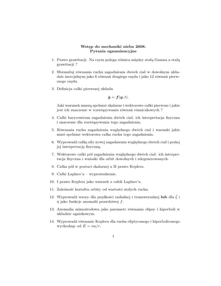 Wstęp do mechaniki nieba 2008. Pytania egzaminacyjne 1. Prawo