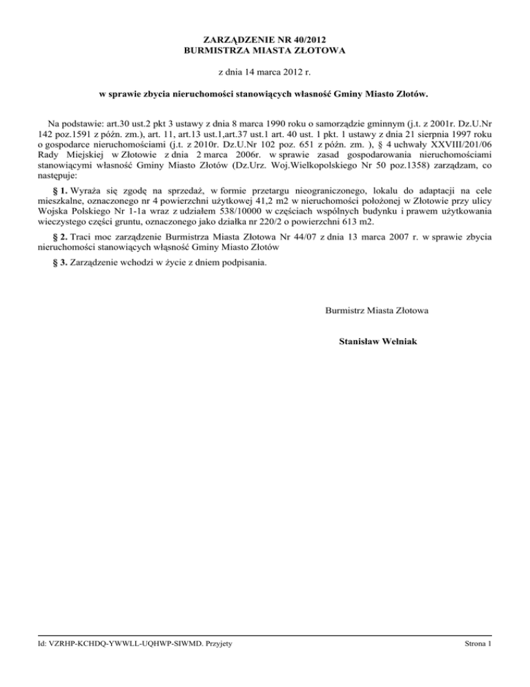 ZARZĄDZENIE NR 40/2012 BURMISTRZA MIASTA ZŁOTOWA z dnia 14 marca 2012 r. w sprawie zbycia nieruchomości stanowiących własność Gminy Miasto Złotów. Na podstawie: art.30 ust.2 pkt 3 ustawy z dnia 8 marca 1990 roku o samorządzie gminnym (j.t. z 2001r. Dz.U.Nr 142 poz.1591 z późn. zm.), art. 11, art.13 ust.1,art.37 ust.1 art. 40 ust. 1 pkt. 1 ustawy z dnia 21 sierpnia 1997 roku o gospodarce nieruchomościami (j.t. z 2010r. Dz.U.Nr 102 poz. 651 z późn. zm. ), § 4 uchwały XXVIII/201/06 Rady Miejskiej w Złotowie z dnia 2 marca 2006r. w sprawie zasad gospodarowania nieruchomościami stanowiącymi własność Gminy Miasto Złotów (Dz.Urz. Woj.Wielkopolskiego Nr 50 poz.1358) zarządzam, co następuje: § 1. Wyraża się zgodę na sprzedaż, w formie przetargu nieograniczonego, lokalu do adaptacji na cele mieszkalne, oznaczonego nr 4 powierzchni użytkowej 41,2 m2 w nieruchomości położonej w Złotowie przy ulicy Wojska Polskiego Nr 1-1a wraz z udziałem 538/10000 w częściach wspólnych budynku i prawem użytkowania wieczystego części gruntu, oznaczonego jako działka nr 220/2 o powierzchni 613 m2. § 2. Traci moc zarządzenie Burmistrza Miasta Złotowa Nr 44/07 z dnia 13 marca 2007 r. w sprawie zbycia nieruchomości stanowiących włąsność Gminy Miasto Złotów § 3. Zarządzenie wchodzi w życie z dniem podpisania. Burmistrz Miasta Złotowa Stanisław Wełniak Id: VZRHP-KCHDQ-YWWLL-UQHWP-SIWMD. Przyjety Strona 1