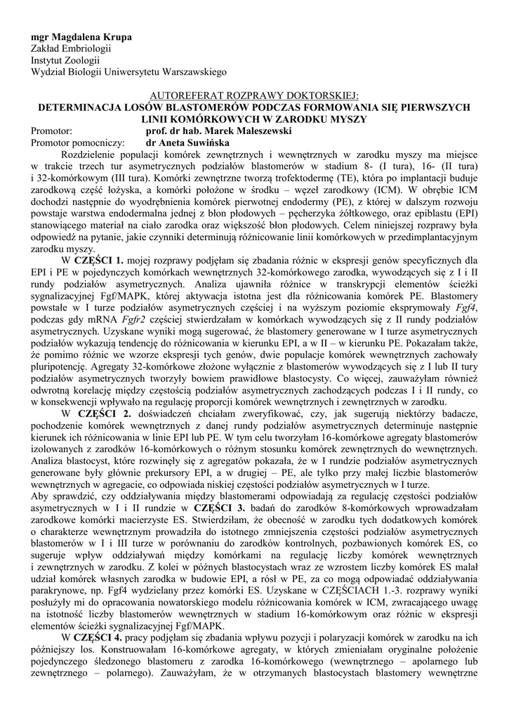 mgr Magdalena Krupa Zakład Embriologii Instytut Zoologii Wydział Biologii Uniwersytetu Warszawskiego AUTOREFERAT ROZPRAWY DOKTORSKIEJ: DETERMINACJA LOSÓW BLASTOMERÓW PODCZAS FORMOWANIA SIĘ PIERWSZYCH LINII KOMÓRKOWYCH W ZARODKU MYSZY Promotor: prof. dr hab. Marek Maleszewski Promotor pomocniczy: dr Aneta Suwińska Rozdzielenie populacji komórek zewnętrznych i wewnętrznych w zarodku myszy ma miejsce w trakcie trzech tur asymetrycznych podziałów blastomerów w stadium 8- (I tura), 16- (II tura) i 32-komórkowym (III tura). Komórki zewnętrzne tworzą trofektodermę (TE), która po implantacji buduje zarodkową część łożyska, a komórki położone w środku – węzeł zarodkowy (ICM). W obrębie ICM dochodzi następnie do wyodrębnienia komórek pierwotnej endodermy (PE), z której w dalszym rozwoju powstaje warstwa endodermalna jednej z błon płodowych – pęcherzyka żółtkowego, oraz epiblastu (EPI) stanowiącego materiał na ciało zarodka oraz większość błon płodowych. Celem niniejszej rozprawy była odpowiedź na pytanie, jakie czynniki determinują różnicowanie linii komórkowych w przedimplantacyjnym zarodku myszy. W CZĘŚCI 1. mojej rozprawy podjęłam się zbadania różnic w ekspresji genów specyficznych dla EPI i PE w pojedynczych komórkach wewnętrznych 32-komórkowego zarodka, wywodzących się z I i II rundy podziałów asymetrycznych. Analiza ujawniła różnice w transkrypcji elementów ścieżki sygnalizacyjnej Fgf/MAPK, której aktywacja istotna jest dla różnicowania komórek PE. Blastomery powstałe w I turze podziałów asymetrycznych częściej i na wyższym poziomie eksprymowały Fgf4, podczas gdy mRNA Fgfr2 częściej stwierdzałam w komórkach wywodzących się z II rundy podziałów asymetrycznych. Uzyskane wyniki mogą sugerować, że blastomery generowane w I turze asymetrycznych podziałów wykazują tendencję do różnicowania w kierunku EPI, a w II – w kierunku PE. Pokazałam także, że pomimo różnic we wzorze ekspresji tych genów, dwie populacje komórek wewnętrznych zachowały pluripotencję. Agregaty 32-komórkowe złożone wyłącznie z blastomerów wywodzących się z I lub II tury podziałów asymetrycznych tworzyły bowiem prawidłowe blastocysty. Co więcej, zauważyłam również odwrotną korelację między częstością podziałów asymetrycznych zachodzących podczas I i II rundy, co w konsekwencji wpływało na regulację proporcji komórek wewnętrznych i zewnętrznych w zarodku. W CZĘŚCI 2. doświadczeń chciałam zweryfikować, czy, jak sugerują niektórzy badacze, pochodzenie komórek wewnętrznych z danej rundy podziałów asymetrycznych determinuje następnie kierunek ich różnicowania w linie EPI lub PE. W tym celu tworzyłam 16-komórkowe agregaty blastomerów izolowanych z zarodków 16-komórkowych o różnym stosunku komórek zewnętrznych do wewnętrznych. Analiza blastocyst, które rozwinęły się z agregatów pokazała, że w I rundzie podziałów asymetrycznych generowane były głównie prekursory EPI, a w drugiej – PE, ale tylko przy małej liczbie blastomerów wewnętrznych w agregacie, co odpowiada niskiej częstości podziałów asymetrycznych w I turze. Aby sprawdzić, czy oddziaływania między blastomerami odpowiadają za regulację częstości podziałów asymetrycznych w I i II rundzie w CZĘŚCI 3. badań do zarodków 8-komórkowych wprowadzałam zarodkowe komórki macierzyste ES. Stwierdziłam, że obecność w zarodku tych dodatkowych komórek o charakterze wewnętrznym prowadziła do istotnego zmniejszenia częstości podziałów asymetrycznych blastomerów w I i III turze w porównaniu do zarodków kontrolnych, pozbawionych komórek ES, co sugeruje wpływ oddziaływań między komórkami na regulację liczby komórek wewnętrznych i zewnętrznych w zarodku. Z kolei w późnych blastocystach wraz ze wzrostem liczby komórek ES malał udział komórek własnych zarodka w budowie EPI, a rósł w PE, za co mogą odpowiadać oddziaływania parakrynowe, np. Fgf4 wydzielany przez komórki ES. Uzyskane w CZĘŚCIACH 1.-3. rozprawy wyniki posłużyły mi do opracowania nowatorskiego modelu różnicowania komórek w ICM, zwracającego uwagę na istotność liczby blastomerów wewnętrznych w stadium 16-komórkowym oraz różnic w ekspresji elementów ścieżki sygnalizacyjnej Fgf/MAPK. W CZĘŚCI 4. pracy podjęłam się zbadania wpływu pozycji i polaryzacji komórek w zarodku na ich późniejszy los. Konstruowałam 16-komórkowe agregaty, w których zmieniałam oryginalne położenie pojedynczego śledzonego blastomeru z zarodka 16-komórkowego (wewnętrznego – apolarnego lub zewnętrznego – polarnego). Zauważyłam, że w otrzymanych blastocystach blastomery wewnętrzne charakteryzowały się znacznie większą plastycznością w stosunku do komórek zewnętrznych i po eksperymentalnej zmianie lokalizacji mogły się przeprogramować i różnicować ostatecznie w TE. Z kolei we wszystkich agregatach, w których blastomer zewnętrzny umieszczany był w środku, śledzona komórka przemieszczała się na powierzchnię. Proces ten prawdopodobnie nie miał charakteru aktywnego, ponieważ zaburzenie polimeryzacji aktyny nie hamowało migracji tej komórki.