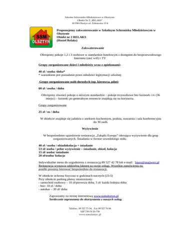 Szkolne Schronisko Młodzieżowe w Olsztynie Obiekt Nr 2 „RELAKS” 10-558 Olsztyn ul. Żołnierska 13 b Proponujemy zakwaterowanie w Szkolnym Schronisku Młodzieżowym w Olsztynie Obiekt nr 2 RELAKS (Hostel Relaks) Zakwaterowanie Oferujemy pokoje 1,2 i 3 osobowe w standardzie hotelowym z dostępem do bezprzewodowego Internetu (sieć wifi) i TV Grupy zorganizowane dzieci i młodzieży wraz z opiekunami: 40 zł / osoba /doba* * warunkiem jest posiadanie przez młodzież legitymacji szkolnej Grupy zorganizowane osób dorosłych (np. kierowca, pilot) 60 zł / osoba / doba Oferujemy również pokoje o niższym standardzie – pokoje trzyosobowe bez łazienek i tv (36 miejsc) – łazienki po generalnym remoncie znajdują się na korytarzu. Grupy zorganizowane 25 zł / os / doba W obiekcie znajduje się jadalnia z aneksem kuchennym, pralnia, suszarnia i sala konferencyjna do 30 osób. Wyżywienie W bezpośrednim sąsiedztwie restauracja „Zakątki Europy” oferująca wyżywienie dla grup zorganizowanych. Śniadania w formie szwedzkiego stołu. 40 zł / osoba / obiadokolacja + śniadanie 53 zł/ osoba / pełne wyżywienie – śniadanie, obiad, kolacja 15 zł/ osoba/ śniadanie 20 zł/osoba/ kolacja Indywidualne menu do uzgodnienia z restauracją 89 527 42 78 lub e-mail: [email protected] Restauracja wystawia oddzielną fakturę za swoje usługi. Wszelkie zamówienia na posiłki prosimy kierować bezpośrednio do restauracji. W obiekcie ochrona fizyczna w godzinach nocnych (23-5) Przy obiekcie parking płatny niestrzeżony: - samochód osobowy – 10 zł/pierwsza doba, 5 zł/ każda kolejna doba - bus- 10 zł / doba - autokar – 30 zł/ doba Zapraszamy na stronę internetową www.ssmolsztyn.pl Serdecznie zapraszamy do skorzystania z naszych usług. Telefon : 89 527 75 34; Fax 89 527 76 84 NIP 739-33-26-758 www.ssmolsztyn..pl