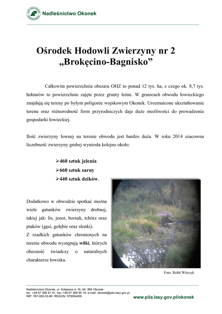 Nadleśnictwo Okonek Ośrodek Hodowli Zwierzyny nr 2 „Brokęcino-Bagnisko” Całkowita powierzchnia obszaru OHZ to ponad 12 tys. ha, z czego ok. 8,7 tys. hektarów to powierzchnie zajęte przez grunty leśne. W granicach obwodu łowieckiego znajdują się tereny po byłym poligonie wojskowym Okonek. Urozmaicone ukształtowanie terenu oraz różnorodność form przyrodniczych daje duże możliwości do prowadzenia gospodarki łowieckiej. Ilość zwierzyny łownej na terenie obwodu jest bardzo duża. W roku 2014 szacowna liczebność zwierzyny grubej wyniosła kolejno około: 460 sztuk jelenia 660 sztuk sarny 440 sztuk dzików. Dodatkowo w obwodzie spotkać można wiele gatunków zwierzyny drobnej, takiej jak: lis, jenot, borsuk, tchórz oraz ptaków (gęsi, gołębie oraz słonki). Z rzadkich gatunków chronionych na terenie obwodu występują wilki, których obecność świadczy o naturalnych charakterze łowiska. Foto. Rafał Witczyk Nadleśnictwo Okonek, ul. Kolejowa nr 16, 64- 965 Okonek tel.: +48 67 266 91 01, fax: +48 67 266 95 19, e-mail: [email protected] NIP: 767-000-53-80 REGON: 570064458 www.pila.lasy.gov.pl/okonek Nadleśnictwo Okonek prowadzi biuro polowań, które w swojej ofercie ma zarówno polowania dla myśliwych polskich, jak i zagranicznych. Jesteśmy zainteresowani współpraca w zakresie organizacji polowań indywidualnych (na sarny, jelenie, dziki,) oraz polowań zbiorowych. NASZE BIURO POLOWAŃ UMOŻLIWIA PRZEŻYCIE MYŚLIWSKIEJ PRZYGODY ORAZ ZDOBYCIE WYMARZONYCH TROFEÓW. Osoby zainteresowana przygodą łowiecka na terenie Ośrodka Hodowli Zwierzyny nr 2 ”Brokęcino-Bagnisko” zachęcamy do współpracy. Wszystkie oferty i zapytania prosimy kierować ([email protected]) lub telefonicznie (67 266 91 01) Zapraszamy do współpracy. Z myśliwskim pozdrowieniem – DARZ BÓR! na adres mailowy