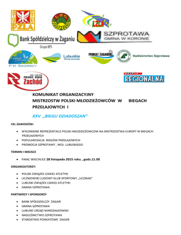 KOMUNIKAT ORGANIZACYJNY MISTRZOSTW POLSKI MŁODZIEŻOWCÓW W PRZEŁAJOWYCH I BIEGACH XXV „BIEGU DZIADOSZAN” CEL ZAWODÓW: WYŁONIENIE REPREZENTACJI POLSKI MŁODZIEŻOWCOW NA MISTRZOSTWA EUROPY W BIEGACH PRZEŁAJOWYCH POPULARYZACJA BIEGÓW PRZEŁAJOWYCH PROMOCJA SZPROTAWY , WOJ. LUBUSKIEGO TERMIN I MIEJSCE PAłAC WIECHLICE 28 listopada 2015 roku , godz.11.00 ORGANIZATORZY: POLSKI ZWIĄZEK LEKKIEJ ATLETYKI UCZNIOWSKI LUDOWY KLUB SPORTOWY „UCZNIAK” LUBUSKI ZWIĄZEK LEKKIEJ ATLETYKI GMINA SZPROTAWA PARTNERZY I SPONSORZY BANK SPÓŁDZIELCZY ŻAGAŃ GMINA SZPROTAWA LUBUSKI URZĄD MARSZAŁKOWSKI NADLEŚNICTWO SZPROTAWA STAROSTWO POWIATOWE ŻAGAŃ P.W. SIKORSCY PATRONI MEDIALNI RADIO ZACHÓD GAZETA REGIONALNA INSTYTUCJE WSPOMAGAJĄCE PAŁAC WIECHLICE SZPROTAWSKI DOM KULTURY ZS RCK W HENRYKOWIE ZAKWATEROWANIE I WYŻYWIENIE PAŁAC WIECHLICE , WIECHLICE 45B, 67-300 SZPROTAWA / KOSZT POBYTU 120 PLN – OSOBODZIEŃ Tel 68 376 86 10 CENTRUM KSZTAŁCENIA I WYCHOWANIA OHP , HOTEL „CHROBRY”, WIECHLICE , UL JESIONOWA 2, 67-300 SZPROTAWA/ KOSZT POBYTU 100PLN/ Tel. 68 376 70 07 Zamówienia i płatność bezpośrednio w miejscach zakwaterowania i wyżywienia NAGRODY I WYRÓŻNIENIA MEDALE ZA MIEJSCA I – III PUCHARY ZA I- III W BIEGACHMŁODZIEŻOWCOW KOBIET I MĘŻCZYZN I NAGRODY FINANSOWE I– 700, II – 500, III – 300 W OTWARTM „BIEGU DZIADOSZAN”- MĘŻCZYŹNI – I – 350, II- 250, III - 150 NAGRODY ZA BIEG OTWARTY KOBIET „BIEGU DZIADOSZAN” I – 350, II- 250, III - 150 UCZESTNISTWO I DYSTANSE ZGODNIE Z REGULAMINEM PZLA /6 km kobiety i 8 km mężczyźni/ZGŁOSZENIA DOMTEL/ MŁODZIEZ SZKOLNA /ILOŚCIOWE ZGŁOSZENIA ZE SZKÓŁ DO BIEGU OTWARTEGO „DZIADOSZAN” KOBIET I MĘŻCZYZN / PROGRAM MINUTOWY 11.00 11.20 11.30 12.00 12.10 12.40 12.50 13.10 - OTWARCIE ZAWODÓW 1000 m – bieg dziewcząt kl V-VI SP / kartki startowe/ 6000 m - bieg główny MMP kobiet / zgłoszenia Domtel/GP PZLA + 4 km jun 1000 m – bieg chłopców kl V-VI / kartki startowe / 8000m – bieg główny MMP mężczyzn / zgłoszenia Domtel/GP PZLA + 6 km jun 1000 m – bieg dziewcząt Gimnazja / kartki startowe/ 2000m - bieg chłopców Gimnazja / kartki startowe/ 5000 m – bieg otwarty” Biegu Dziadoszan”/KOBIET I MĘŻCZYZN/ SPRAWY RÓŻNE Zgłoszenia zgodnie z regulaminem /mmp DOMTEL/ Weryfikacja – w Pałacu Wiechlice / siłownia LUB INNE MIEJSCE OZNACZONE// W trakcie weryfikacji uczestnicy otrzymają nr. startowe ./ biegi główne, biegi młodzieżowe na kartki startowe/ Trasa na terenie Pałacu Wiechlice , płaska , lekko kręta. Start i meta OBOK budynku głównego Pałacu Wiechlice Wszelkie informacje dodatkowe, Tel 792 656 300 / Zygmunt Szwarc / Obsada sędziowska Sędzia główny – Tomasz Lubowski Delegat techniczny PZLAr – Andrzej Szczesny Sędziowie na trasie – z woj. Lubuskiego i wolontariusze ze Szprotawy/ nauczyciele, zawodnicy Uczniaka/