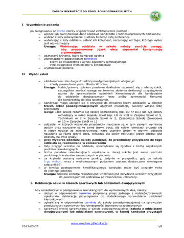 ZASADY REKRUTACJI DO SZKÓŁ PONADGIMNAZJALNYCH I Wypełnienie podania po zalogowaniu na konto naleŜy wygenerować elektronicznie podanie: • wpisać lub zweryfikować dane osobowe kandydata i rodziców/prawnych opiekunów • wybrać z listy maksymalnie 3 szkoły tworząc listę preferencji • wybierając z listy oddziały, ustalić ich kolejność, zaczynając od tego, którego wybór jest najwaŜniejszy Uwaga: Wybierając oddziały w szkole naleŜy zwrócić uwagę, aby proponowany język obcy zapewniał kontynuację z gimnazjum. • zaznaczyć kryteria, które kandydat spełnia • wprowadzić w odpowiednim terminie: oceny ze świadectwa i wyniki egzaminu gimnazjalnego inne osiągnięcia wymienione w świadectwie • wydrukować podanie II Wybór szkół • • • • • • • • elektroniczna rekrutacja do szkół ponadgimnazjalnych obejmuje: szkoły prowadzone przez Miasto Wrocław Uwaga: Rodzic/prawny opiekun powinien dokładnie zapoznać się z ofertą szkół, szczególnie zwrócić uwagę na terminy złoŜenia deklaracji przystąpienia ucznia do sprawdzianów uzdolnień kierunkowych dla kandydatów do oddziałów dwujęzycznych oraz próby sprawności fizycznej dla kandydatów do klas sportowych. kandydaci mogą ubiegać się o przyjęcie do dowolnej liczby oddziałów w obrębie trzech szkół ponadgimnazjalnych objętych rekrutacją, tworząc własną listę preferencji Uwaga: Jako szkołę rozumie się szkołę samodzielną (np. LO nr III,) lub typ szkoły wchodzący w skład zespołu szkół (np. LO nr XIII w Zespole Szkół nr 5, Technikum nr 2 w Zespole Szkół nr 2, Zasadnicza Szkoła Zawodowa nr 10 w Zespole Szkół nr 1) oddziały, w których wszystkie przedmioty nauczane są w tym samym wymiarze godzin oraz nauczane są te same języki obce, dla celów rekrutacji grupuje się w jeden oddział ze zwielokrotnioną liczbą uczniów (jeŜeli w jednym oddziale nauczane są róŜne języki obce, wówczas dla celów rekrutacji jeden oddział jest dzielony na dwie grupy) przy wyborze oddziału naleŜy pamiętać, Ŝe przedmioty przypisane do tego oddziału są realizowane w rozszerzeniu listy przyjęć uczniów do oddziału, sporządzane są zgodnie z liczbą uzyskanych punktów rekrutacyjnych liczba punktów rekrutacyjnych uzyskana w danej szkole jest sumą wartości punktowych kryteriów zaznaczonych w podaniu za kryteria zostaną naliczone punkty, jedynie w przypadku, gdy do szkoły I–go wyboru wraz z wydrukowanym podaniem zostaną dostarczone wymagane załączniki[0] w wyniku postępowania kwalifikacyjnego kandydat moŜe być przyjęty tylko do jednego oddziału Uwaga: Szkolna komisja rekrutacyjno-kwalifikacyjna przydziela uczniów przyjętych do poszczególnych oddziałów po zakończeniu rekrutacji. a. Deklaracja nauki w klasach sportowych lub oddziałach dwujęzycznych Aby uczestniczyć w postępowaniu rekrutacyjnym do wymienionych klas, naleŜy: • złoŜyć w odpowiednim terminie podpisaną przez jednego z rodziców/prawnych opiekunów deklarację przystąpienia do dodatkowego sprawdzianu uzdolnień kierunkowych • zgłosić się w odpowiednim terminie do szkoły ponadgimnazjalnej na sprawdzian predyspozycji sportowych lub umiejętności językowo-przedmiotowych • sprawdzić wyniki sprawdzianu w szkole ponadgimnazjalnej (szkoła z oddziałami dwujęzycznymi lub oddziałami sportowymi, w której kandydat przystąpił www.wroclaw.pl/edukacja 2013-02-22 1/6 ZASADY REKRUTACJI DO SZKÓŁ PONADGIMNAZJALNYCH do dodatkowego sprawdzianu lub próby sprawnościowej wydaje kandydatowi zaświadczenie potwierdzające liczbę uzyskanych punktów) Klasy sportowe: • interdyscyplinarna: LO nr XXIV w Zespole Szkół nr 4 • koszykówka chłopców: LO nr II w Zespole Szkół nr 22 • siatkówka dziewcząt: LO nr II w Zespole Szkół nr 22 • piłka noŜna, wioślarstwo: LO nr XI Szkoły Mistrzostwa Sportowego: • lekkoatletyka: LO Mistrzostwa Sportowego nr II w Zespole Szkół nr 22 • pływanie: LO Mistrzostwa Sportowego nr I w Zespole Szkół nr 4 Oddziały dwujęzyczne: • język angielski: LO nr XIV w Zespole Szkół nr 14 • język francuski: LO nr VIII • język hiszpański: Liceum Dwujęzyczne nr IV w Zespole Szkół Ogólnokształcących nr 3 • język niemiecki: LO nr XIII w Zespole Szkół nr 5 • język włoski: Liceum Dwujęzyczne nr IV w Zespole Szkół Ogólnokształcących nr 3 Oddział międzynarodowy pre-IB w Liceum Ogólnokształcącym nr V w Zespole Szkół Ogólnokształcących nr 5 b. Deklaracja nauki w szkole dla kandydatów o specjalnych potrzebach edukacyjnych Nabór do oddziałów integracyjnych w Zespole Szkół Integracyjnych odbywa się bez wykorzystania systemu elektronicznego. Rodzice kandydatów o specjalnych potrzebach edukacyjnych, zobowiązani są złoŜyć w odpowiednim terminie w Wydziale Edukacji Urzędu Miejskiego Wrocławia przy ul. Gabrieli Zapolskiej 4: • podanie • 2 egzemplarze (oryginały) aktualnego orzeczenia o potrzebie kształcenia specjalnego wydane przez Poradnię Psychologiczno-Pedagogiczną Uwaga: Kandydaci spoza Wrocławia składają wniosek w Starostwie Powiatowym właściwym ze względu na miejsce zamieszkania dziecka. c. Kandydat, który nie uzyskał promocji do klasy II • • po złoŜeniu deklaracji o powtarzaniu klasy I w macierzystej szkole, zgodnie ze statutem szkoły ma zagwarantowane w niej miejsce deklarując powtarzanie klasy w innej szkole, uczestniczy w rekrutacji na zasadach ogólnych d. Zmiana decyzji o wyborze szkół • kandydat ma prawo zmienić w określonym terminie swoje wybory oddziałów lub ich kolejność na liście preferencji • kandydat chcąc dokonać zmian w liście preferencji powinien: zalogować się do systemu sprawdzić, czy kolejność wybranych oddziałów jest prawidłowa i odpowiada zainteresowaniom kandydata w przypadku, gdy kolejność oddziałów była niezgodna z jego priorytetami odpowiednio przesuwając oznaczenia klas na liście ustawić ich nową kolejno