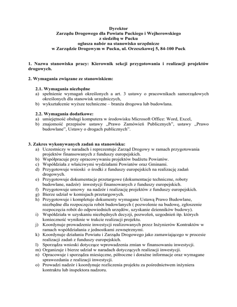 Dyrektor Zarządu Drogowego dla Powiatu Puckiego i Wejherowskiego z siedzibą w Pucku ogłasza nabór na stanowisko urzędnicze w Zarządzie Drogowym w Pucku, ul. Orzeszkowej 5, 84-100 Puck 1. Nazwa stanowiska pracy: Kierownik sekcji przygotowania i realizacji projektów drogowych. 2. Wymagania związane ze stanowiskiem: 2.1. Wymagania niezbędne a) spełnienie wymagań określonych a art. 3 ustawy o pracownikach samorządowych określonych dla stanowisk urzędniczych, b) wykształcenie wyższe techniczne – branża drogowa lub budowlana. 2.2. Wymagania dodatkowe: a) umiejętność obsługi komputera w środowisku Microsoft Office: Word, Excel, b) znajomość przepisów ustawy „Prawo Zamówień Publicznych”, ustawy „Prawo budowlane”, Ustawy o drogach publicznych”. 3. Zakres wykonywanych zadań na stanowisku: a) Uczestniczy w naradach i reprezentuje Zarząd Drogowy w ramach przygotowania projektów finansowanych z funduszy europejskich. b) Współpracuje przy opracowywaniu projektów budżetu Powiatów. c) Współdziała z właściwymi wydziałami Powiatów oraz Gminami. d) Przygotowuje wnioski o środki z funduszy europejskich na realizację zadań drogowych. e) Przygotowuje dokumentacje przetargowe (dokumentacje techniczne, roboty budowlane, nadzór) inwestycji finansowanych z funduszy europejskich. f) Przygotowuje umowy na nadzór i realizację projektów z funduszy europejskich. g) Bierze udział w komisjach przetargowych. h) Przygotowuje i kompletuje dokumenty wymagane Ustawą Prawo Budowlane, niezbędne dla rozpoczęcia robót budowlanych ( pozwolenie na budowę, zgłoszenie rozpoczęcia robót do odpowiednich urzędów, uzyskanie dzienników budowy). i) Współdziała w uzyskaniu niezbędnych decyzji, pozwoleń, uzgodnień itp. których konieczność wyniknie w trakcie realizacji projektu. j) Koordynuje prowadzenie inwestycji realizowanych przez Inżynierów Kontraktów w ramach współdziałania z jednostkami zewnętrznymi. k) Koordynuje działania Powiatu i Zarządu Drogowego jako zamawiającego w procesie realizacji zadań z funduszy europejskich. l) Sporządza wnioski dotyczące wprowadzenia zmian w finansowaniu inwestycji. m) Organizuje i bierze udział w naradach dotyczących realizacji inwestycji. n) Opracowuje i sporządza miesięczne, półroczne i doraźne informacje oraz wymagane sprawozdania z realizacji inwestycji. o) Prowadzi nadzór i koordynuje rozliczenia projektu za pośrednictwem inżyniera kontraktu lub inspektora nadzoru. p) Przygotowuje i kompletuje dokumenty niezbędne do uzyskania decyzji o pozwoleniu na użytkowanie. q) Po zakończeniu inwestycji podejmuje działania pozwalające na przekazanie wytworzonych środków trwałych na majątek Powiatu. r) Sporządza sprawozdania i analizy zgodnie z wytycznymi i podręcznikiem procedur. s) Gromadzi i analizuje przepisy prawa oraz informacje związane z zakresem działania. t) Wykonuje inne prace zleconych przez przełożonych. 4. Wymagane dokumenty: a) życiorys (prosimy o podanie telefonu kontaktowego), b) oryginał kwestionariusza osobowego, c) kserokopie zaświadczeń o ukończonych kursach, szkoleniach, d) kopia pierwszych trzech stron dowodu osobistego lub kopia nowego dowodu osobistego, e) kopie dokumentów potwierdzających wykształcenie, f) oświadczenie o korzystaniu z pełni praw publicznych, g) oświadczenie o niekaralności za popełnienie przestępstwa z winy umyślnej (wybrany kandydat zobowiązany będzie dostarczyć zaświadczenie o niekaralności z Centralnego Rejestru Skazanych), h) zaświadczenie potwierdzające stan zdrowia pozwalający na zajmowanie stanowiska specjalisty, i) oświadczenie o wyrażeniu zgody na przetwarzanie danych osobowych dla celów rekrutacji, j) kopie świadectw pracy. 5. Warunki pracy a) zatrudnienie w pełnym wymiarze czasu pracy, b) miejsce pracy: biuro Zarządu Drogowego dla Powiatu Puckiego i Wejherowskiego z siedzibą w Pucku, ul. Orzeszkowej 5, c) przewiduje się zawarcie umowy o pracę na czas określony, a następnie jej przedłużenie lub zawarcie umowy na czas nieokreślony bez przeprowadzania kolejnego naboru. 6. Termin i miejsce składania dokumentów: Dokumenty należy składać do dnia 29.10 2007 roku do godz. 15.00 osobiście w sekretariacie Zarządu Drogowego dla Powiatu Puckiego i Wejherowskiego z siedziba w Pucku, ul. Orzeszkowej 5 lub drogą pocztową na powyższy adres (liczy się data wpływu do Zarządu Drogowego). Dokumenty należy złożyć w zamkniętej kopercie z dopiskiem „konkurs na stanowisko kierownika sekcji przygotowania i realizacji projektów drogowych”. 7. Dodatkowe informacje a) dodatkowe informacje można uzyskać pod nr telefonu: (058) 774-32-80. b) oferty otrzymane po terminie nie będą rozpatrywane, c) po upływie terminu, do złożenia dokumentów, określonego w ogłoszeniu o naborze w Biuletynie Informacji Publicznej Starostwa Powiatowego w Pucku i Wejherowie, zostanie ogłoszona lista kandydatów, którzy spełniają wymagania formalne określone w ogłoszeniu o naborze. d) informacja o wyniku naboru będzie umieszczona w Biuletynie Informacji Publicznej (www.bip.starostwo.puck.pl), (www.bip.powiat.wejherowo.pl) oraz na tablicy informacyjnej Zarządu Drogowego dla Powiatu Puckiego i Wejherowskiego z siedzibą w Pucku przy ul. Orzeszkowej 5.