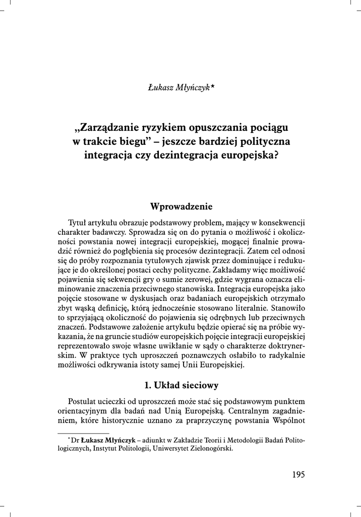 Łukasz Młyńczyk* „Zarządzanie ryzykiem opuszczania pociągu w trakcie biegu” – jeszcze bardziej polityczna integracja czy dezintegracja europejska? Wprowadzenie Tytuł artykułu obrazuje podstawowy problem, mający w konsekwencji charakter badawczy. Sprowadza się on do pytania o możliwość i okoliczności powstania nowej integracji europejskiej, mogącej finalnie prowadzić również do pogłębienia się procesów dezintegracji. Zatem cel odnosi się do próby rozpoznania tytułowych zjawisk przez dominujące i redukujące je do określonej postaci cechy polityczne. Zakładamy więc możliwość pojawienia się sekwencji gry o sumie zerowej, gdzie wygrana oznacza eliminowanie znaczenia przeciwnego stanowiska. Integracja europejska jako pojęcie stosowane w dyskusjach oraz badaniach europejskich otrzymało zbyt wąską definicję, którą jednocześnie stosowano literalnie. Stanowiło to sprzyjającą okoliczność do pojawienia się odrębnych lub przeciwnych znaczeń. Podstawowe założenie artykułu będzie opierać się na próbie wykazania, że na gruncie studiów europejskich pojęcie integracji europejskiej reprezentowało swoje własne uwikłanie w sądy o charakterze doktrynerskim. W praktyce tych uproszczeń poznawczych osłabiło to radykalnie możliwości odkrywania istoty samej Unii Europejskiej. 1. Układ sieciowy Postulat ucieczki od uproszczeń może stać się podstawowym punktem orientacyjnym dla badań nad Unią Europejską. Centralnym zagadnieniem, które historycznie uznano za praprzyczynę powstania Wspólnot * Dr Łukasz Młyńczyk – adiunkt w Zakładzie Teorii i Metodologii Badań Politologicznych, Instytut Politologii, Uniwersytet Zielonogórski. 195 Studia Europejskie, 2/2015 Europejskich, była kwestia lęku przed odrodzeniem się Niemiec, co postrzegano jako geopolityczną katastrofę, używając kategorii Carla Schmitta, mającą charakter egzystencjalny. Rozwój Europy po drugiej wojnie światowej dokonywał się liniowo, jednak z czasem struktura wzajemnych powiązań straciła tradycyjnie hierarchiczny układ na rzecz sieciowego. System jest dziś nie tylko zbiorem elementów kontaktujących się ze sobą, często z pominięciem tradycyjnego centrum, lecz także konstrukcją nieprzejrzystą, która reprezentuje określony polityczny sens jedynie dla bezpośrednich uczestników. Często jest to wszystko dla części obserwatorów i niewiele dla całości obrazu. Gdy spoglądamy spoza systemu, widzimy, że jego złożoność wymyka się skutecznym ocenom, powoduje dezorientację właśnie z powodu zastosowania wobec przedmiotu badania tradycyjnych narzędzi interpretacji i analizy. W pewien sposób zdaje się być całkowicie chaotyczny, niemniej jest to raczej zabieg celowy, służący jego możliwości powtarzającego się stale procesu reorientacji. W radykalnym ontologicznym ujęciu mamy byt jako stawanie się, niemający punktów stałych, a jego istotą jest ciągłe wyłanianie się nowych faz procesu, gdzie ruch ma charakter nieustanny1. Dylemat, jaki temu towarzyszy, to: czy mamy przed oczami „to, co nigdy się nie narodziło i trwa”, czy może „co się zawsze rodzi i nigdy nie istnieje”2? Zwykle badacze oraz komentatorzy pozostający na zewnątrz UE w sposób intencjonalny i upraszczający przypisują jej znane sobie kategorie, maskujące i fałszujące realny obraz. W tym sensie postulat ograniczania wpływu badającego na przedmiot badania wydaje się nieuzasadniony. Wprowadzona na nowo logika interakcji służy konfliktowi, o ile ten ostatni ma wartość kreującą, nigdy zaś destrukcyjną. Zauważona pewien czas temu przez Ulricha Becka walka między zwolennikami „starych narodowych warcabów a metagraczami” sprowadza się do relacji między akceptacją konsekwencji, gdzie wszystko jest przewidziane, a reprezentantami stanowiska, że wszystko jest możliwe3. Jeśli przyjmujemy wykładnię ograniczającą legitymizację do organizmu narodowego, wówczas konsekwencje dla oczekujących utrzymania starego porządku nie mogą stanowić zaskoczenia, ponieważ niejako nic nie wydostaje się na zewnątrz organizmu. Dopuszczenie konkurencyjnej logiki transnarodowej ogranicza skuteczność starych narzędzi analizy, a wszelka kwantyfikacja gospodarki światowej jako sumy gospodarek narodowych jest z góry obarczona błędną kalkulacją. Oczywista różnica sprowadza W. Stróżewski, Ontologia, Kraków 2006, s. 69–70. Ibidem, s. 70–71. 3 Por.: U. Beck, Władza i przeciwwładza w epoce globalnej: nowa ekonomia polityki światowej, Warszawa 2005, s. 38–39. 1 2 196 Ł. Młyńczyk, Zarządzanie ryzykiem opuszczania pociągu... się zatem do dychotomii: państwo narodowe i Unia Europejska, której niesłusznie przypisuje się quasi-państwowość. Pojawiająca się antynomia to nie wyłącznie spór między zwolennikami i oponentami bezkonkurencyjności państwa narodowego, ale przede wszystkim błąd pojawiający się w studiach europejskich, będący następstwem myślenia intencjonalnego samych badaczy. Klasyczny już dziś konflikt intergovernmentalistów oraz neofunkcjonalistów dotyczył pozornie kształtu tego, co europejskie wraz z kolejnymi krokami integracji. Przy czym został on zdominowany przez myślenie o wpływie zjawiska na znaczenie państw, mimo że sugerowano centralne umiejscowienie integracji europejskiej w toczącej się debacie4. Trudno jednoznacznie rozstrzygnąć motywacje badaczy, niemniej nawet jeśli postulowano obiektywizm, to faktycznie dominującą orientacją był naukowy państwocentryzm. Wnioski mogące się nasuwać dotyczą przede wszystkim roli, jaką pierwotnie przypisywano samej UE. Nie może dziwić tego rodzaju stanowisko, gdyż w głównej mierze brakowało wiarygodnych doświadczeń, które pozwalałyby odnosić się do alternatywnej wobec państw rzeczywistości (bardziej aktualnej niż stan przedpolityczny Hobbesa). O ile osobiste doświadczenie nie determinuje samego poznania, o t