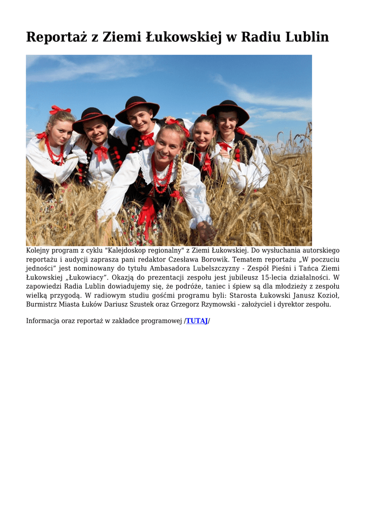 Reportaż z Ziemi Łukowskiej w Radiu Lublin Kolejny program z cyklu "Kalejdoskop regionalny" z Ziemi Łukowskiej. Do wysłuchania autorskiego reportażu i audycji zaprasza pani redaktor Czesława Borowik. Tematem reportażu „W poczuciu jedności” jest nominowany do tytułu Ambasadora Lubelszczyzny - Zespół Pieśni i Tańca Ziemi Łukowskiej „Łukowiacy”. Okazją do prezentacji zespołu jest jubileusz 15-lecia działalności. W zapowiedzi Radia Lublin dowiadujemy się, że podróże, taniec i śpiew są dla młodzieży z zespołu wielką przygodą. W radiowym studiu gośćmi programu byli: Starosta Łukowski Janusz Kozioł, Burmistrz Miasta Łuków Dariusz Szustek oraz Grzegorz Rzymowski - założyciel i dyrektor zespołu. Informacja oraz reportaż w zakładce programowej /TUTAJ/