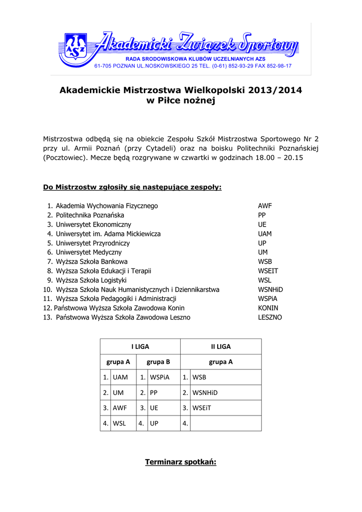 Akademickie Mistrzostwa Wielkopolski 2013/2014 w Piłce nożnej Mistrzostwa odbędą się na obiekcie Zespołu Szkół Mistrzostwa Sportowego Nr 2 przy ul. Armii Poznań (przy Cytadeli) oraz na boisku Politechniki Poznańskiej (Pocztowiec). Mecze będą rozgrywane w czwartki w godzinach 18.00 – 20.15 Do Mistrzostw zgłosiły się następujące zespoły: 1. Akademia Wychowania Fizycznego 2. Politechnika Poznańska 3. Uniwersytet Ekonomiczny 4. Uniwersytet im. Adama Mickiewicza 5. Uniwersytet Przyrodniczy 6. Uniwersytet Medyczny 7. Wyższa Szkoła Bankowa 8. Wyższa Szkoła Edukacji i Terapii 9. Wyższa Szkoła Logistyki 10. Wyższa Szkoła Nauk Humanistycznych i Dziennikarstwa 11. Wyższa Szkoła Pedagogiki i Administracji 12. Państwowa Wyższa Szkoła Zawodowa Konin 13. Państwowa Wyższa Szkoła Zawodowa Leszno I LIGA II LIGA grupa A grupa B grupa A 1. UAM 1. WSPiA 1. WSB 2. UM 2. PP 2. WSNHiD 3. AWF 3. UE 3. WSEiT 4. WSL 4. UP 4. Terminarz spotkań: AWF PP UE UAM UP UM WSB WSEIT WSL WSNHiD WSPiA KONIN LESZNO I LIGA CYTADELA Data Godzina 1 boisko II LIGA - CYTADELA 1 boisko 2 boisko II LIGA - POLITECHNIKA 1 boisko 18.00 6.03.2014 19.00 18.00 13.03.2014 19.00 18.00 WSPiA-UE 19.00 UM-WSL 18.00 PP-UP 19.00 UAM-WSL 18.00 WSPiA-PP 19.00 UAM-UM 18.00 UE-UP 19.00 AWF-WSL WSB-WSNHiD 20.03.2014 WSNHiD-WSEiT 27.03.2014 WSB-WSEiT 3.04.2014 10.04.2014 17-21.04.2014 WIELKANOC 18.00 PP-UE 19.00 AWF-UAM 18.00 WSPiA-UP 19.00 UM-AWF 18.00 2A-2B 19.00 1A-1B 24.04.2014 1-3.05.2013 8.05.2014 15.05.2014 18.00 22.05.2014 19.00 termin rezerwowy termin rezerwowy 18.00 29.05.2014 19.00 25-28.05.2014 Półfinał AMP. KU AZS PWSZ LESZNO Ustalenia regulaminowe: Organizatorem rozgrywek jest Rada Środowiskowa Klubów Uczelnianych AZS Poznań. 2 boisko 1. Mecze rozgrywane są zgodnie z przepisami Akademickich Mistrzostw Wielkopolski i właściwymi przepisami PZPN. 2. Podstawowe wymagania wobec zawodników: - zobowiązani są posiadać przy sobie ważne legitymacje AZS; - występ na boisku możliwy jest tylko w koszulce z numerem; numer ten powinien być wpisany do protokołu z meczu. 3. Mecze sędziują sędziowie, delegowani przez Wielkopolski Związek Piłki Nożnej. 4. Wszystkie mecze w I lidze rozgrywane są w wymiarze 2 x 30 minut. Wszystkie mecze w II lidze rozgrywane są w wymiarze 2 x 25 minut. W wypadku remisów mecze rozstrzygane są rzutami karnymi, zgodnie z przepisami PZPN. Mecze II ligi – zespoły 7 osobowe (6+bramkarz), mecz odbywa się w poprzek boiska, bramki „5”, „zmiany hokejowe”. 5. Bezpośredni organizatorzy meczów (zespoły ujęte w terminarzu na 1. miejscu) zobowiązani są do: - zapewnienia piłek na mecz; - zapewnienia protokołu na mecz i oddania go do biura RŚ do 3 dni po spotkaniu - posiadania zapasowego kompletu strojów, kontrastowego w stosunku do kompletu podstawowego; 6. Kary: czasowe usunięcie z boiska przez sędziego (2 lub 5 minut), żółte i czerwone kartki. Otrzymanie w meczu czerwonej kartki automatycznie uniemożliwia danemu zawodnikowi grę w jednym następnym meczu. Inne kary, wynikające z kartek: na podstawie komunikatów, wydawanych przez Organizatora. 7. W meczach, w wypadku remisu, bezpośrednio po zakończeniu spotkania wykonywanie są rzuty karne, zgodnie z przepisami PZPN. Wynik rzutów karnych brany będzie pod uwagę tylko w przypadku, kiedy dwa zespoły będą miały taki sam bilans punktów. Dotyczy tylko grup 3-zespołowych. 9. O miejscu w grupie decydują kolejno: - Liczba punktów - Wynik bezpośredniego pojedynku (w przypadku kilku drużyn „mała tabela”) - Stosunek bramek - Większa liczba bramek zdobytych - Losowanie 10. W sprawach wątpliwych i spornych, nie ujętych w niniejszych „ustaleniach”, wiążące decyzje podejmuje Organizator. 11.Zakaz gry w obuwiu z metalowymi lub ceramicznymi korkami! Na obiekcie „Pocztowca” można grać tylko w butach do gry na hali lub śniegówkach z małymi koreczkami. Zakaz gry w butach z korkami. 12. Na obiekcie Zespołu Szkół Mistrzostwa Sportowego obowiązuje zakaz palenia papierosów i spożywania alkoholu. Awans do Półfinału AMP uzyskuje 6 zespołów, grających w rozgrywkach I ligi: - zwycięzcy grup A i B - zespoły zajmujące 2 miejsca w grupach A i B - zwycięzca meczu pomiędzy zespołami zamiejscowymi - zwycięzca meczu barażowego pomiędzy zespołami: drugim zamiejscowym a zwycięzcą meczu pomiędzy zespołami zajmującymi 3 miejsce w grupie A i B