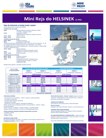 Mini Rejs do HELSINEK (3 DNI) Rejs do Helsinek w każdą środę i piątek powrót odpowiednio w piątek lub niedzielę 1 DZIEŃ (środa lub piątek) 09:00 odprawa biletowa na Dworcu Morskim w Gdyni, ul. Polska 1, przejazd na prom 11:00 wypłynięcie z GDYNI, zakwaterowanie w kabinach, atrakcje na promie, 12:15 – 13:45 obiad na promie 18:00 – 19:30 kolacja na promie 2 DZIEŃ (czwartek lub sobota) 07:00 – 08:30 śniadanie na promie 09:00 przypłynięcie do HELSINEK Przejazd komunikacją miejską (autobus 90B + metro) do centrum Helsinek – ok. 30 min. Przyjazd do centrum Helsinek (stacja metra Kaisaniemi) – czas wolny. ok. 15:30 przejazd komunikacją miejską (metro - kierunek Vuosaari + autobus 90B) z centrum Helsinek do portu. 16:30 – 18:00 odprawa biletowa przejazd z terminala promowego na prom 18:30 wypłynięcie z Helsinek, atrakcje na promie 19:30 – 21.00 kolacja na promie 3 DZIEŃ (piątek lub niedziela) 08:00 – 09:30 śniadanie na promie 13:15 – 13:45 obiad na promie 15:00 przypłynięcie do GDYNI - przejazd z promu na Dworzec Morski w Gdyni, ul. Polska 1 Zakończenie rejsu Rozkład rejsów zgodny z rozkładem promów Finnlines. Ceny za osobę w wybranej kabinie RODZAJ KABINY w kabinie 3-os. bez okna w kabinie 2-os. bez okna w kabinie 4-os. z oknem w kabinie 3-os. z oknem w kabinie 2-os. z oknem RODZAJ KABINY w kabinie 3-os. bez okna w kabinie 2-os. bez okna w kabinie 4-os. z oknem w kabinie 3-os. z oknem w kabinie 2-os. z oknem 01.02-15.06.2010 & 10.08-31.12.2010 16.06.2010-09.08.2010 PAKIET I PAKIET II PAKIET I PAKIET II przepłynięcie przepłynięcie i wyżywienie przepłynięcie przepłynięcie i wyżywienie OSOBY DOROSŁE 510 PLN OSOBY DOROSŁE 804 PLN 916 PLN 600 PLN 894PLN 568 PLN 862 PLN 626 PLN 920 PLN 804 PLN 1098 PLN DZIECI W WIEKU 6-17 LAT 255 PLN 300 PLN 284 PLN 313 PLN 402 PLN 402 PLN 447 PLN 431 PLN 460 PLN 549 PLN Dzieci do 6 lat - BEZPŁATNIE CENA REJSU ZAWIERA - przepłynięcie na trasie Gdynia – Helsinki – Gdynia w wybranej kabinie - czas wolny w Helsinkach - wszystkie opłaty portowe i paliwowe - niezapomniane widoki - wyżywienie na promie zgodnie z wykupionym pakietem: Pakiet I zawiera samo przepłynięcie promem na trasie Gdynia – Helsinki – Gdynia w wybranej kabinie Pakiet II zawiera: 2 śniadanie, 2 obiady, 2 kolacje – wszystkie posiłki z napojami, posiłki serwowane są w formie samoobsługowego bufetu Istnieje możliwość zakupienia posiłków bezpośrednio na promie: 1 śniadanie: 10 EUR 1 obiad: 17 EUR 1 kolacja: 22 EUR INFORMACJE PRAKTYCZNE Na promie obowiązuje czas fiński – po wejściu na prom należy przestawić czas o 1 godzinę do przodu (z 11:00 na 12:00). 1210 PLN 1084 PLN 1378 PLN 1168 PLN 1462 PLN 1286 PLN 1580 PLN 1706 PLN 2000 PLN DZIECI W WIEKU 6-17 LAT 458 PLN 605 PLN 542 PLN 584 PLN 643 PLN 853 PLN 689 PLN 731 PLN 790 PLN 1000 PLN Oferta Mini Rejs Gdynia - Helsinki - Gdynia obejmuje realizację wszystkich, następujących po sobie odcinków trasy, z pobytem Helsinkach nie dłuższym niż 9 godzin. ATRAKCJE NA PROMACH pub, kawiarnia, restauracja, kasyno, sklep wolnocłowy. W cenie również: pokój gier i plac zabaw dla dzieci, siłownia, sauna fińska & jacuzzi. ATRAKCJE TURYSTYCZNE HELSINEK Katedra Świętego Mikołaja, Plac Targowy, Cerkiew Uspieńska, Kościół w Skale, Stadion Olimpijski. DLA ZMOTORYZOWANYCH I ROWERZYSTÓW – istnieje możliwość zabrania ze sobą w rejs samochodu, motoru lub roweru. O cennik pojazdów pytaj w naszym biurze. Czas wolny w Helsinkach do indywidualnej dyspozycji pasażerów.