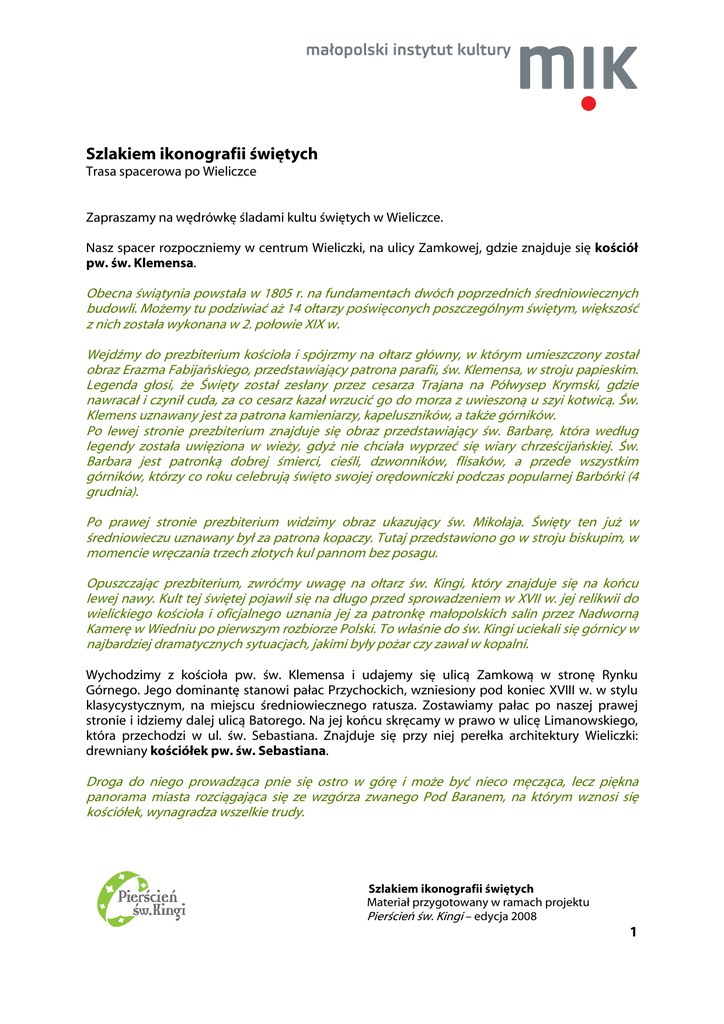 Szlakiem ikonografii świętych Trasa spacerowa po Wieliczce Zapraszamy na wędrówkę śladami kultu świętych w Wieliczce. Nasz spacer rozpoczniemy w centrum Wieliczki, na ulicy Zamkowej, gdzie znajduje się kościół pw. św. Klemensa. Obecna świątynia powstała w 1805 r. na fundamentach dwóch poprzednich średniowiecznych budowli. Możemy tu podziwiać aż 14 ołtarzy poświęconych poszczególnym świętym, większość z nich została wykonana w 2. połowie XIX w. Wejdźmy do prezbiterium kościoła i spójrzmy na ołtarz główny, w którym umieszczony został obraz Erazma Fabijańskiego, przedstawiający patrona parafii, św. Klemensa, w stroju papieskim. Legenda głosi, że Święty został zesłany przez cesarza Trajana na Półwysep Krymski, gdzie nawracał i czynił cuda, za co cesarz kazał wrzucić go do morza z uwieszoną u szyi kotwicą. Św. Klemens uznawany jest za patrona kamieniarzy, kapeluszników, a także górników. Po lewej stronie prezbiterium znajduje się obraz przedstawiający św. Barbarę, która według legendy została uwięziona w wieży, gdyż nie chciała wyprzeć się wiary chrześcijańskiej. Św. Barbara jest patronką dobrej śmierci, cieśli, dzwonników, flisaków, a przede wszystkim górników, którzy co roku celebrują święto swojej orędowniczki podczas popularnej Barbórki (4 grudnia). Po prawej stronie prezbiterium widzimy obraz ukazujący św. Mikołaja. Święty ten już w średniowieczu uznawany był za patrona kopaczy. Tutaj przedstawiono go w stroju biskupim, w momencie wręczania trzech złotych kul pannom bez posagu. Opuszczając prezbiterium, zwróćmy uwagę na ołtarz św. Kingi, który znajduje się na końcu lewej nawy. Kult tej świętej pojawił się na długo przed sprowadzeniem w XVII w. jej relikwii do wielickiego kościoła i oficjalnego uznania jej za patronkę małopolskich salin przez Nadworną Kamerę w Wiedniu po pierwszym rozbiorze Polski. To właśnie do św. Kingi uciekali się górnicy w najbardziej dramatycznych sytuacjach, jakimi były pożar czy zawał w kopalni. Wychodzimy z kościoła pw. św. Klemensa i udajemy się ulicą Zamkową w stronę Rynku Górnego. Jego dominantę stanowi pałac Przychockich, wzniesiony pod koniec XVIII w. w stylu klasycystycznym, na miejscu średniowiecznego ratusza. Zostawiamy pałac po naszej prawej stronie i idziemy dalej ulicą Batorego. Na jej końcu skręcamy w prawo w ulicę Limanowskiego, która przechodzi w ul. św. Sebastiana. Znajduje się przy niej perełka architektury Wieliczki: drewniany kościółek pw. św. Sebastiana. Droga do niego prowadząca pnie się ostro w górę i może być nieco męcząca, lecz piękna panorama miasta rozciągająca się ze wzgórza zwanego Pod Baranem, na którym wznosi się kościółek, wynagradza wszelkie trudy. Szlakiem ikonografii świętych Materiał przygotowany w ramach projektu Pierścień św. Kingi – edycja 2008 1 Patronem świątyni jest św. Sebastian, według legendy oficer gwardii cesarza Dioklecjana, gorliwy wyznawca Chrystusa. Ponieważ sprzeciwiał się cesarskim prześladowaniom chrześcijan, został skazany na śmierć. Przywiązano go do drzewa i przeszyto strzałami. Ciało ledwie żywego Sebastiana odnalazła kobieta o imieniu Irena, która roztoczyła nad nim opiekę. Po powrocie do zdrowia przyszły Święty ponownie wystąpił wobec cesarza w obronie chrześcijan. Wtedy Dioklecjan rozkazał zatłuc go pałkami. Ciało Świętego wrzucono do rzymskiej Cloaca Maxima. Sebastian został patronem m.in. kamieniarzy, łuczników, strażaków, strzelców, żołnierzy oraz orędownikiem podczas epidemii chorób zakaźnych. Nie dziwi więc fakt, że mieszkańcy Wieliczki nadali wezwanie Świętego Sebastiana kościółkowi wzniesionemu na miejscu cmentarza cholerycznego w podzięce za ustanie epidemii. Zwróćmy teraz uwagę na dach świątyni – znajduje się tam wykuty w metalu łuk, będący odwołaniem do męczeństwa Świętego. Przypomina o nim także obraz w rokokowym ołtarzu głównym, ufundowany z okazji 200-lecia konsekracji kościoła, która odbyła się w roku 1598. Ukazuje on najpopularniejszy typ przedstawienia św. Sebastiana – młodzieniec przywiązany jest do drzewa, w jego ciele tkwią strzały. Podobnie namalował postać Świętego Włodzimierz Tetmajer, którego polichromia, wykonana na początku XX w., zdobi wnętrze kościółka. Na stropie artysta przedstawił jednak nie tylko patrona świątyni, ale i niezwykle dla Wieliczki ważną osobę – św. Kingę wraz z jej mężem, księciem krakowsko-sandomierskim Bolesławem Wstydliwym. Przyglądnij się uważnie polichromii Włodzimierza Tetmajera. Czy potrafisz odnaleźć postaci trzech żyjących w średniowieczu biskupów krakowskich: Stanisława ze Szczepanowa, Wincentego Kadłubka i Iwona Odrowąża? [Zwiedzanie kościółka jest możliwe tylko bezpośrednio przed lub po nabożeństwach. W niedzielę msze św. odprawiane są o godz. 10.00 i 16.30.] Czas spaceru: 60 min. Opracowanie trasy: Aleksandra Szeląg, Katarzyna Meroń Bibliografia: Długosz A., Zabytki wielickie. Przewodnik, Muzeum Żup Krakowskich, Wieliczka 1966. Kalwajtys E., Ochniak K., Kościół pw. Św. Klemensa w Wieliczce (architektura i wyposażenie), [w:] Studia i materiały do dziejów żup solnych w Polsce, tom XXI, Muzeum Żup Krakowskich, Wieliczka 2001. Spiechowicz A. M., Wieliczka. Parafia św. Klemensa, Wydawnictwo Turystyczne 2004 http://free.of.pl/s/swsebastian/index.htm Chrzanowski T., Kornecki M., Sztuka ziemi krakowskiej, Kraków 1982. Janicka-Krzywda U., Patron-atrybut-symbol, Poznań 1993. Szlakiem ikonografii świętych Materiał przygotowany w ramach projektu Pierścień św. Kingi – edycja 2008 2