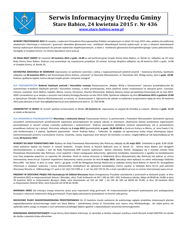 Serwis Informacyjny Urzędu Gminy Stare Babice, 24 kwietnia 2015 r. Nr 436 www.stare-babice.waw.pl WYBORY PREZYDENCKIE 2015 W związku z wyborami Prezydenta Rzeczypospolitej Polskiej zarządzonymi na dzień 10 maja 2015 roku, podano do publicznej wiadomości informację o numerach i granicach obwodów głosowania oraz siedzibach obwodowych komisji wyborczych, w tym o lokalach obwodowych komisji wyborczych dostosowanych do potrzeb wyborców niepełnosprawnych, a także o możliwości glosowania korespondencyjnego i przez pełnomocnika. Szczegóły w Urzędzie Gminy i na stronie bip.babice-stare.waw.pl VII SESJA RADY GMINY W czwartek 30 kwietnia 2015 o godz. 14.00 w sali konferencyjnej Urzędu Gminy Stare Babice, ul. Rynek 21, odbędzie się VII sesja Rady Gminy Stare Babice. Podczas sesji przewiduje się rozpatrzenie projektów 10 uchwał. Komisja Wspólna odbędzie się 28 kwietnia 2015 o godz. 14.00 w Urzędzie Gminy, ul. Rynek 32. KATARZYNA GROCHOLA W OŻAROWIE Zapraszamy na spotkanie autorskie z jedną z najpoczytniejszych polskich pisarek – Katarzyną Grocholą. Spotkanie odbędzie się 26 kwietnia 2015 w Sali Kominkowej Domu Kultury „Uśmiech” w Ożarowie Mazowieckim, ul. Poznańska 165. Wstęp wolny, start o godz. 18.00. Podczas spotkania będzie można zakupić książki pisarki i otrzymać autograf. DLA PRZESIĘBIORCÓW Badanie lokalnych potrzeb i kierunków rozwoju Stowarzyszenie „Między Wisłą a Kampinosem” zaprasza przedsiębiorców do uczestnictwa w badaniu lokalnych potrzeb i kierunków rozwoju, a także przedsięwzięć, które powinny zostać zrealizowane na obszarze gmin: Czosnów, Leoncin, Łomianki, Stare Babice, Izabelin, Błonie, Leszno, Kampinos, Ożarów Mazowiecki. Badanie dotyczy nowej perspektywy finansowej UE na lata 20142020 i prowadzone są w związku z pracami nad Lokalną Strategią Rozwoju na lata 2014-2020. Spotkanie odbędzie się dnia 28 kwietnia 2015 o godzinie 15:00 w Specjalnym Ośrodku Szkolno-Wychowawczym w Lesznie, ul. Sochaczewska 4. Zgłoszenia do udziału w badaniach przyjmowane będą do dnia 24 kwietnia 2015 pod adresem e-mail: [email protected] oraz telefonicznie pod nr. 22 794 04 88. UNIWERSYTET III WIEKU W ramach spotkań Uniwersytetu III Wieku 28 kwietnia br. zapraszamy na wyjazd do Ośrodka w Laskach. Zbiórka o godz. 15.15 w szkole w Borzęcinie. DLA ORGANIZACJI POZARZĄDOWYCH Warsztaty z rozliczania dotacji Towarzystwo Amicus w partnerstwie z Powiatem Warszawskim Zachodnim zaprasza wszystkich zainteresowanych przedstawicieli organizacji pozarządowych do wzięcia udziału w warsztacie „Rozliczanie dotacji przekazanej organizacjom pozarządowym w ramach ustawy o pożytku publicznym i wolontariacie”. Podczas warsztatów dokładnie zostanie opowiedziane, jak w sprawozdaniu prawidłowo rozliczyć się z dotacji. Warsztaty odbędą się 4 maja 2015 (poniedziałek) w godz. 18.00-20.00 w Centrum Kultury w Błoniu, ul. Jana Pawła II 1b, sala konferencyjna ( II piętro). Spotkanie poprowadzi trener Andrzej Rybus – Tołłoczko. Ze względu na ograniczoną liczbę miejsc obowiązują zapisy. Zainteresowanych prosimy o przesyłanie imienia, nazwiska, nazwy organizacji oraz danych do kontaktu na adres: [email protected] lub [email protected] do środy 30 kwietnia 2015. WYBORY DO RADY POWIATOWEJ MIR Wybory do Rady Powiatowej Mazowieckiej Izby Rolniczej odbędą się 31 maja 2015 (niedziela) w godz. 8.00-18.00. Lokal wyborczy będzie się mieścić w nowym budynku Urzędu Gminy w Starych Babicach przy ul. Rynek 21. Gmina Stare Babice jest okręgiem dwumandatowym, w związku z tym do Rady Powiatowej MIR zostanie wybranych dwóch członków. Rolnik, ubiegający się o mandat członka Rady Powiatowej Mazowieckiej Izby Rolniczej musi wypełnić i złożyć następujące dokumenty: zgłoszenie kandydata, oświadczenie o zgodzie na kandydowanie oraz listę podpisów poparcia, co najmniej 50 członków. Druki te można otrzymać w Oddziałach Biura Mazowieckiej Izby Rolniczej lub pobrać ze strony internetowej www.mir.pl. Czytelnie wypełnione dokumenty należy przesłać do dnia 8 maja 2015. (decyduje data wpływu) na adres właściwego Oddziału Biura MIR, lub złożyć w dniu 11 maja 2015 r. go godz. 15.00 do Okręgowej Komisji Wyborczej w siedzibie Gminy Stare Babice ul. Rynek 32. Szczegółowe informacje o zasadach wyborów i wzory dokumentów niezbędnych do zgłaszania kandydatów można uzyskać w Oddziale Biura M.I.R. pod adresem Warszawa Wesoła ul. Zółkiewskiego 17, pod nr tel. (22) 733 5395 w. 1, tel. fax (22) 733 55 29, e-mail: [email protected] oraz na stronie internetowej www.mir.pl. PRZERWY W DOSTAWIE PRĄDU PGE Dystrybucja SA Oddział Warszawa Rejon Energetyczny Pruszków zawiadamia o przerwach w dostawie prądu: w dniu 28 kwietnia 2015 w miejscowościach Zalesie i Wierzbin, ulice: Trakt Królewski od 167 i 182 do 185 i 202, Królewicza Jakuba, Sklep od 09:00 do 14:00; w dniu 29 kwietnia 2015 w miejscowości Borzęcin Mały, ulica Kosmowska od 142 do 188 i od 145 do 183 od 08:00 do 15:00; w dniu 30 kwietnia 2015 w miejscowości Zielonki Wieś, ulica Kukuczki od 13:00 do 16:00. NAPRAWA DRÓG Od miesiąca trwają wiosenne prace przy naprawach dróg gminnych. W miejscowościach gminnych wykonywane jest podsypywanie kruszywa i równanie nawierzchni dróg gruntowych. Prace będą sukcesywnie prowadzone na terenie całej gminy. MIEJSCOWE PLANY ZAGOSPODAROWANIA PRZESTRZENNEGO Do 15 kwietnia trwało wyłożenie do publicznego wglądu projektów miejscowych planów zagospodarowania przestrzennego części wsi Stare Babice – południowej strony ul. Koczarskiej oraz rejonu ulicy Mizikowskiego. Do wójta gminy nie wpłynęły żadne uwagi, w związku z czym procedura przebiegać będzie zgodnie z zapowiadanym wcześniej harmonogramem. ROKOWANIA NIEROZSTRZYGNIĘTE Urząd Gminy Stare Babice informuje, że sprzedaż w drodze rokowań autobusu marki Renault model MASTER nie doszła do skutku z powodu braku oferentów.