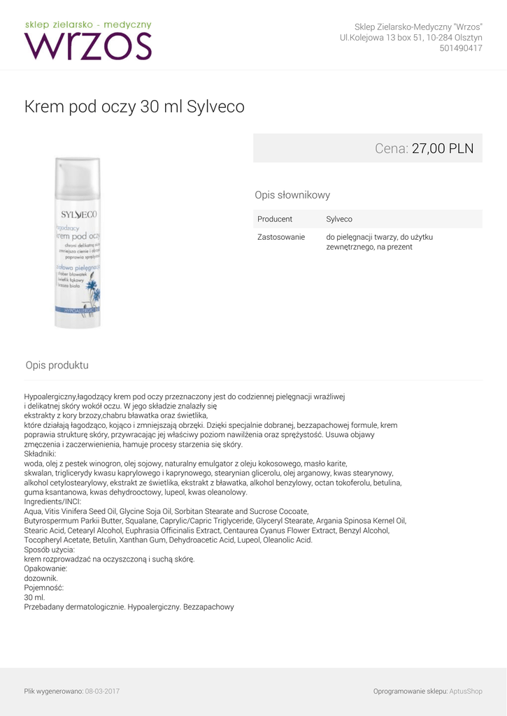 Sklep Zielarsko-Medyczny "Wrzos" Ul.Kolejowa 13 box 51, 10-284 Olsztyn 501490417 Krem pod oczy 30 ml Sylveco Cena: 27,00 PLN Opis słownikowy Producent Sylveco Zastosowanie do pielęgnacji twarzy, do użytku zewnętrznego, na prezent Opis produktu Hypoalergiczny,łagodzący krem pod oczy przeznaczony jest do codziennej pielęgnacji wrażliwej i delikatnej skóry wokół oczu. W jego składzie znalazły się ekstrakty z kory brzozy,chabru bławatka oraz świetlika, które działają łagodząco, kojąco i zmniejszają obrzęki. Dzięki specjalnie dobranej, bezzapachowej formule, krem poprawia strukturę skóry, przywracając jej właściwy poziom nawilżenia oraz sprężystość. Usuwa objawy zmęczenia i zaczerwienienia, hamuje procesy starzenia się skóry. Składniki: woda, olej z pestek winogron, olej sojowy, naturalny emulgator z oleju kokosowego, masło karite, skwalan, triglicerydy kwasu kaprylowego i kaprynowego, stearynian glicerolu, olej arganowy, kwas stearynowy, alkohol cetylostearylowy, ekstrakt ze świetlika, ekstrakt z bławatka, alkohol benzylowy, octan tokoferolu, betulina, guma ksantanowa, kwas dehydrooctowy, lupeol, kwas oleanolowy. Ingredients/INCI: Aqua, Vitis Vinifera Seed Oil, Glycine Soja Oil, Sorbitan Stearate and Sucrose Cocoate, Butyrospermum Parkii Butter, Squalane, Caprylic/Capric Triglyceride, Glyceryl Stearate, Argania Spinosa Kernel Oil, Stearic Acid, Cetearyl Alcohol, Euphrasia Officinalis Extract, Centaurea Cyanus Flower Extract, Benzyl Alcohol, Tocopheryl Acetate, Betulin, Xanthan Gum, Dehydroacetic Acid, Lupeol, Oleanolic Acid. Sposób użycia: krem rozprowadzać na oczyszczoną i suchą skórę. Opakowanie: dozownik. Pojemność: 30 ml. Przebadany dermatologicznie. Hypoalergiczny. Bezzapachowy Plik wygenerowano: 08-03-2017 Powered by TCPDF (www.tcpdf.org) Oprogramowanie sklepu: AptusShop