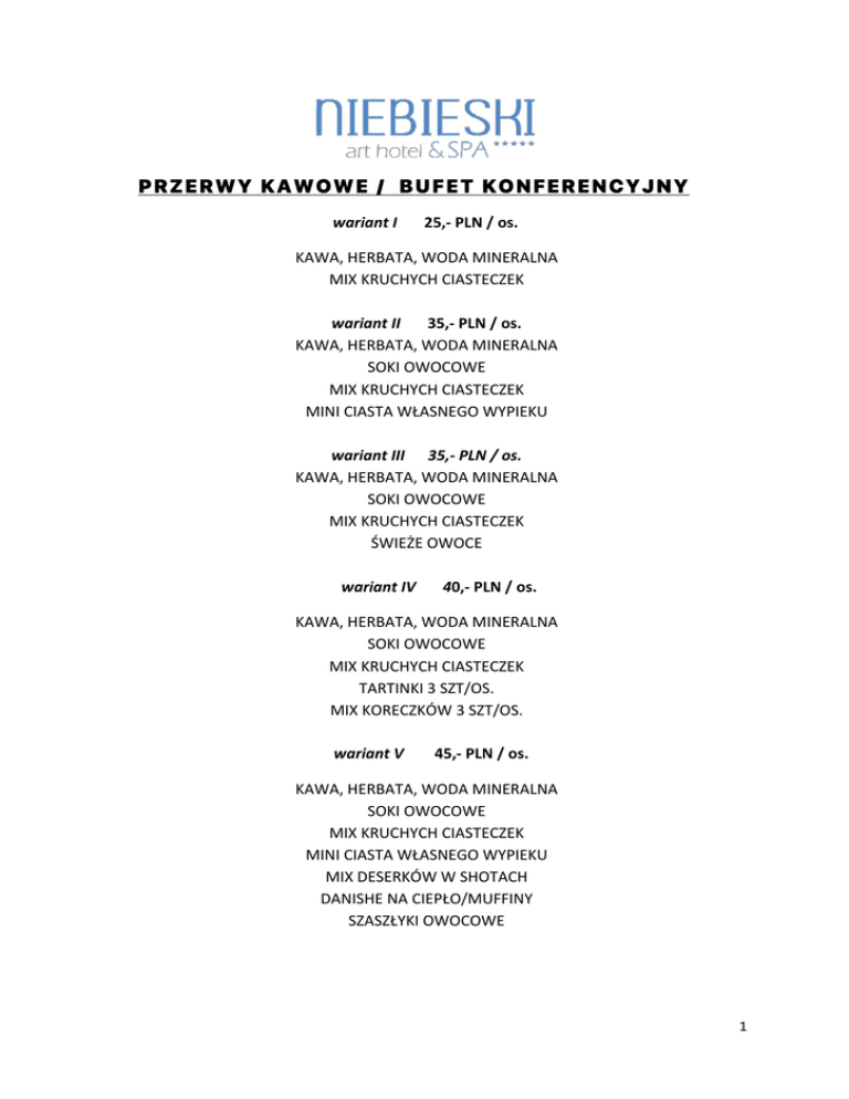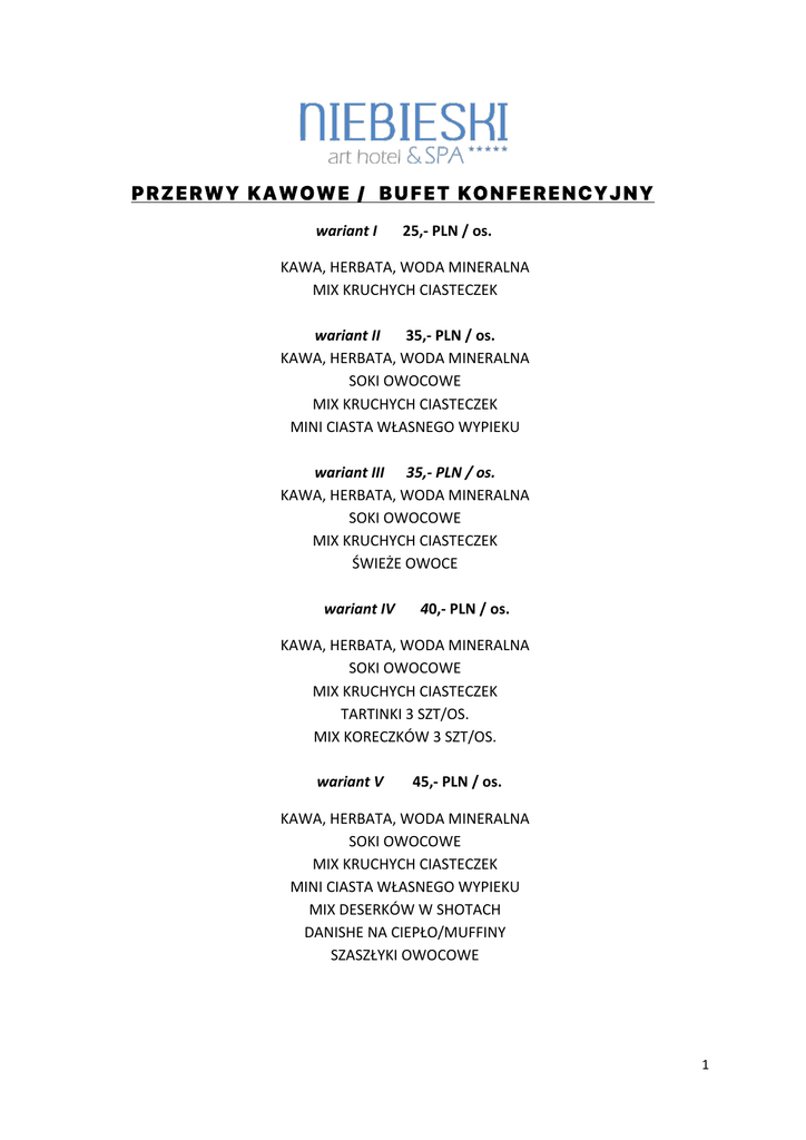 PRZERWY KAWOWE / BUFET KONFERENCYJNY wariantI25,-PLN/os. KAWA,HERBATA,WODAMINERALNA MIXKRUCHYCHCIASTECZEK wariantII35,-PLN/os. KAWA,HERBATA,WODAMINERALNA SOKIOWOCOWE MIXKRUCHYCHCIASTECZEK MINICIASTAWŁASNEGOWYPIEKU wariantIII35,-PLN/os. KAWA,HERBATA,WODAMINERALNA SOKIOWOCOWE MIXKRUCHYCHCIASTECZEK ŚWIEŻEOWOCE wariantIV40,-PLN/os. KAWA,HERBATA,WODAMINERALNA SOKIOWOCOWE MIXKRUCHYCHCIASTECZEK TARTINKI3SZT/OS. MIXKORECZKÓW3SZT/OS. wariantV45,-PLN/os. KAWA,HERBATA,WODAMINERALNA SOKIOWOCOWE MIXKRUCHYCHCIASTECZEK MINICIASTAWŁASNEGOWYPIEKU MIXDESERKÓWWSHOTACH DANISHENACIEPŁO/MUFFINY SZASZŁYKIOWOCOWE 1 BRUNCHOWA55,-PLN/os. KAWA,HERBATA,WODAMINERALNA SOKIOWOCOWE TARTYIQUICHENASŁONO MIXSANDWICH’Y SAŁATKAGRECKANAŁÓDECZKACH SAŁATKACESARENAŁÓDECZKACH MIXPRALINEKCZEKOLADOWYCH PIRAMIDAROZMAITOŚCI55,-PLN/os. KAWA,HERBATA,WODAMINERALNA SOKIOWOCOWE MINICIASTAWŁASNEGOWYPIEKU MIXSAŁATEK,KORECZKÓWIPRZEKĄSEKSERWOWANYCH WSHOTACHINAŁYŻKACH FIT60,-PLN/os. KAWA,HERBATA,WODAMINERALNA SOKIOWOCOWE KOKTAJLEOWOCOWE PATERAOWOCÓW WARZYWNEPALUSZKIZDIPAMI ŚWIEŻEJOGURTYOWOCOWEZMUSLI _______________________________________________________________________ Przerwa kawowa jest traktowana jako całodzienna. Wariant I oraz II są uzupełniane, a w pozostałych wariantach uzupełniamy napoje. 2