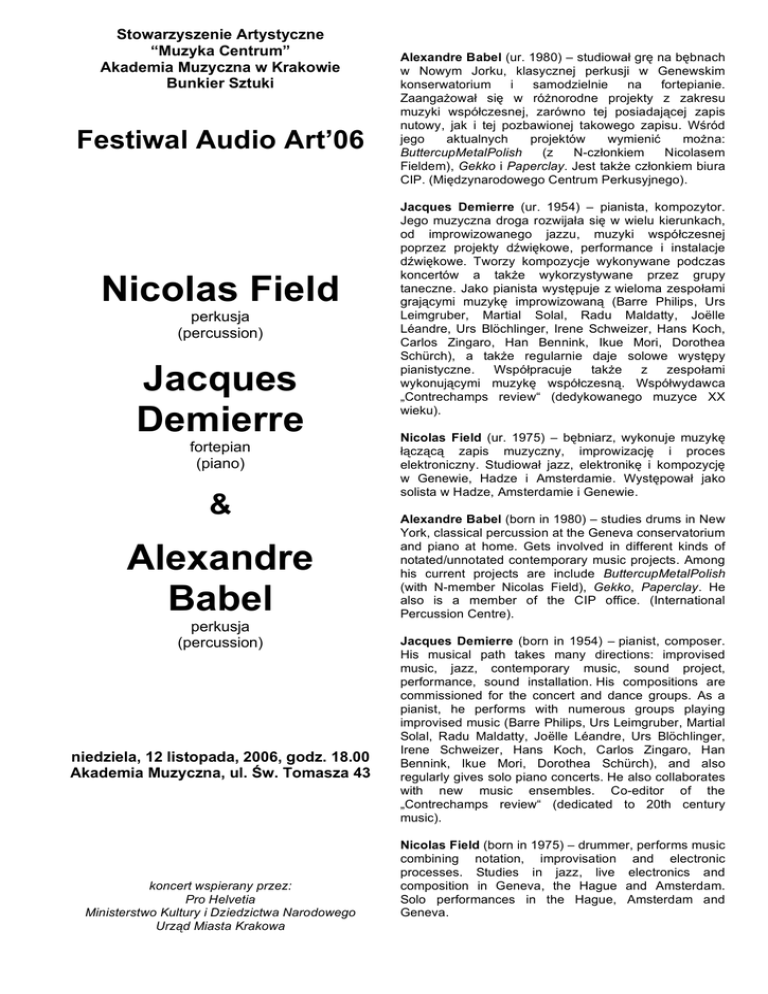 Stowarzyszenie Artystyczne “Muzyka Centrum” Akademia Muzyczna w Krakowie Bunkier Sztuki Festiwal Audio Art’06 Nicolas Field perkusja (percussion) Jacques Demierre fortepian (piano) & Alexandre Babel perkusja (percussion) niedziela, 12 listopada, 2006, godz. 18.00 Akademia Muzyczna, ul. Św. Tomasza 43 koncert wspierany przez: Pro Helvetia Ministerstwo Kultury i Dziedzictwa Narodowego Urząd Miasta Krakowa Alexandre Babel (ur. 1980) – studiował grę na bębnach w Nowym Jorku, klasycznej perkusji w Genewskim konserwatorium i samodzielnie na fortepianie. Zaangażował się w różnorodne projekty z zakresu muzyki współczesnej, zarówno tej posiadającej zapis nutowy, jak i tej pozbawionej takowego zapisu. Wśród jego aktualnych projektów wymienić można: ButtercupMetalPolish (z N-członkiem Nicolasem Fieldem), Gekko i Paperclay. Jest także członkiem biura CIP. (Międzynarodowego Centrum Perkusyjnego). Jacques Demierre (ur. 1954) – pianista, kompozytor. Jego muzyczna droga rozwijała się w wielu kierunkach, od improwizowanego jazzu, muzyki współczesnej poprzez projekty dźwiękowe, performance i instalacje dźwiękowe. Tworzy kompozycje wykonywane podczas koncertów a także wykorzystywane przez grupy taneczne. Jako pianista występuje z wieloma zespołami grającymi muzykę improwizowaną (Barre Philips, Urs Leimgruber, Martial Solal, Radu Maldatty, Joëlle Léandre, Urs Blöchlinger, Irene Schweizer, Hans Koch, Carlos Zingaro, Han Bennink, Ikue Mori, Dorothea Schürch), a także regularnie daje solowe występy pianistyczne. Współpracuje także z zespołami wykonującymi muzykę współczesną. Współwydawca „Contrechamps review“ (dedykowanego muzyce XX wieku). Nicolas Field (ur. 1975) – bębniarz, wykonuje muzykę łączącą zapis muzyczny, improwizację i proces elektroniczny. Studiował jazz, elektronikę i kompozycję w Genewie, Hadze i Amsterdamie. Występował jako solista w Hadze, Amsterdamie i Genewie. Alexandre Babel (born in 1980) – studies drums in New York, classical percussion at the Geneva conservatorium and piano at home. Gets involved in different kinds of notated/unnotated contemporary music projects. Among his current projects are include ButtercupMetalPolish (with N-member Nicolas Field), Gekko, Paperclay. He also is a member of the CIP office. (International Percussion Centre). Jacques Demierre (born in 1954) – pianist, composer. His musical path takes many directions: improvised music, jazz, contemporary music, sound project, performance, sound installation. His compositions are commissioned for the concert and dance groups. As a pianist, he performs with numerous groups playing improvised music (Barre Philips, Urs Leimgruber, Martial Solal, Radu Maldatty, Joëlle Léandre, Urs Blöchlinger, Irene Schweizer, Hans Koch, Carlos Zingaro, Han Bennink, Ikue Mori, Dorothea Schürch), and also regularly gives solo piano concerts. He also collaborates with new music ensembles. Co-editor of the „Contrechamps review“ (dedicated to 20th century music). Nicolas Field (born in 1975) – drummer, performs music combining notation, improvisation and electronic processes. Studies in jazz, live electronics and composition in Geneva, the Hague and Amsterdam. Solo performances in the Hague, Amsterdam and Geneva.